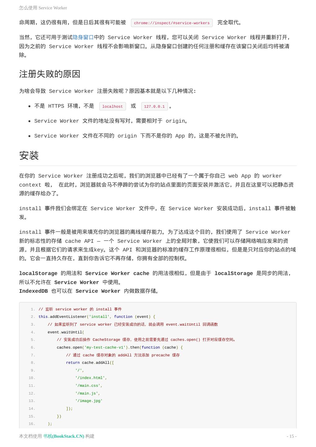 15 .怎么使用 Service Worker 命周期,这仍很有用,但是日后其很有可能被 chrome://inspect/#service-workers 完全取代。 当然,它还可用于测试隐身窗口中的 Service Worker 线程,您可以关闭 Service Worker 线程并重新打开, 因为之前的 Service Worker 线程不会影响新窗口。从隐身窗口创建的任何注册和缓存在该窗口关闭后均将被清 除。 注册失败的原因 为啥会导致 Service Worker 注册失败呢?原因基本就是以下几种情况: 不是 HTTPS 环境,不是 localhost 或 127.0.0.1 。 Service Worker 文件的地址没有写对,需要相对于 origin。 Service Worker 文件在不同的 origin 下而不是你的 App 的,这是不被允许的。 安装 在你的 Service Worker 注册成功之后呢,我们的浏览器中已经有了一个属于你自己 web App 的 worker context 啦, 在此时,浏览器就会马不停蹄的尝试为你的站点里面的页面安装并激活它,并且在这里可以把静态资 源的缓存给办了。 install 事件我们会绑定在 Service Worker 文件中,在 Service Worker 安装成功后,install 事件被触 发。 install 事件一般是被用来填充你的浏览器的离线缓存能力。为了达成这个目的,我们使用了 Service Worker 新的标志性的存储 cache API — 一个 Service Worker 上的全局对象,它使我们可以存储网络响应发来的资 源,并且根据它们的请求来生成key。这个 API 和浏览器的标准的缓存工作原理很相似,但是是只对应你的站点的域 的。它会一直持久存在,直到你告诉它不再存储,你拥有全部的控制权。 localStorage 的用法和 Service Worker cache 的用法很相似,但是由于 localStorage 是同步的用法, 所以不允许在 Service Worker 中使用。 IndexedDB 也可以在 Service Worker 内做数据存储。 1. // 监听 service worker 的 install 事件 2. this.addEventListener('install', function (event) { 3. // 如果监听到了 service worker 已经安装成功的话,就会调用 event.waitUntil 回调函数 4. event.waitUntil( 5. // 安装成功后操作 CacheStorage 缓存,使用之前需要先通过 caches.open() 打开对应缓存空间。 6. caches.open('my-test-cache-v1').then(function (cache) { 7. // 通过 cache 缓存对象的 addAll 方法添加 precache 缓存 8. return cache.addAll([ 9. '/', 10. '/index.html', 11. '/main.css', 12. '/main.js', 13. '/image.jpg' 14. ]); 15. }) 16. ); 本文档使用 书栈(BookStack.CN) 构建 - 15 -