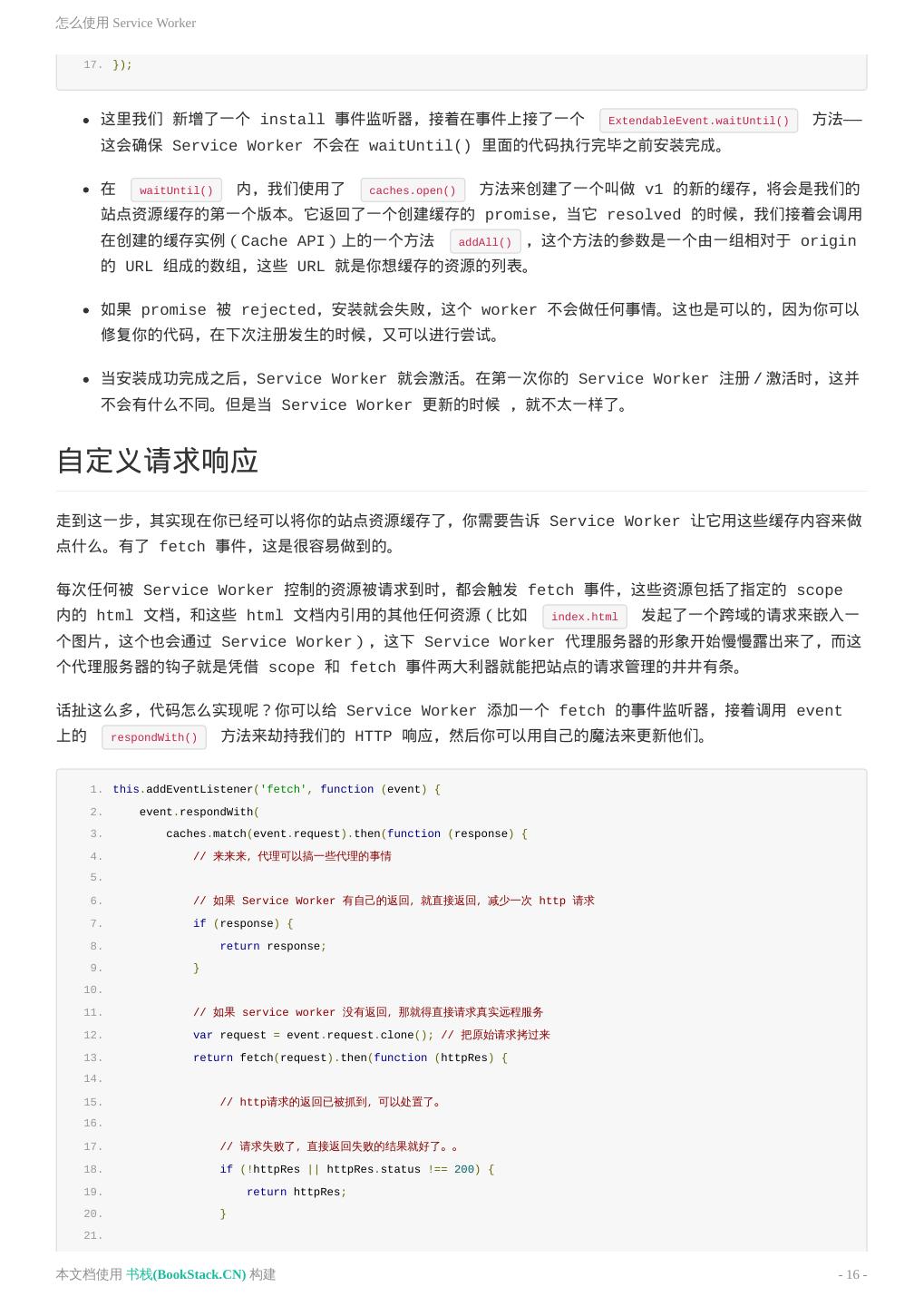 16 .怎么使用 Service Worker 17. }); 这里我们 新增了一个 install 事件监听器,接着在事件上接了一个 ExtendableEvent.waitUntil() 方法—— 这会确保 Service Worker 不会在 waitUntil() 里面的代码执行完毕之前安装完成。 在 waitUntil() 内,我们使用了 caches.open() 方法来创建了一个叫做 v1 的新的缓存,将会是我们的 站点资源缓存的第一个版本。它返回了一个创建缓存的 promise,当它 resolved 的时候,我们接着会调用 在创建的缓存实例(Cache API)上的一个方法 addAll() ,这个方法的参数是一个由一组相对于 origin 的 URL 组成的数组,这些 URL 就是你想缓存的资源的列表。 如果 promise 被 rejected,安装就会失败,这个 worker 不会做任何事情。这也是可以的,因为你可以 修复你的代码,在下次注册发生的时候,又可以进行尝试。 当安装成功完成之后,Service Worker 就会激活。在第一次你的 Service Worker 注册/激活时,这并 不会有什么不同。但是当 Service Worker 更新的时候 ,就不太一样了。 自定义请求响应 走到这一步,其实现在你已经可以将你的站点资源缓存了,你需要告诉 Service Worker 让它用这些缓存内容来做 点什么。有了 fetch 事件,这是很容易做到的。 每次任何被 Service Worker 控制的资源被请求到时,都会触发 fetch 事件,这些资源包括了指定的 scope 内的 html 文档,和这些 html 文档内引用的其他任何资源(比如 index.html 发起了一个跨域的请求来嵌入一 个图片,这个也会通过 Service Worker),这下 Service Worker 代理服务器的形象开始慢慢露出来了,而这 个代理服务器的钩子就是凭借 scope 和 fetch 事件两大利器就能把站点的请求管理的井井有条。 话扯这么多,代码怎么实现呢?你可以给 Service Worker 添加一个 fetch 的事件监听器,接着调用 event 上的 respondWith() 方法来劫持我们的 HTTP 响应,然后你可以用自己的魔法来更新他们。 1. this.addEventListener('fetch', function (event) { 2. event.respondWith( 3. caches.match(event.request).then(function (response) { 4. // 来来来,代理可以搞一些代理的事情 5. 6. // 如果 Service Worker 有自己的返回,就直接返回,减少一次 http 请求 7. if (response) { 8. return response; 9. } 10. 11. // 如果 service worker 没有返回,那就得直接请求真实远程服务 12. var request = event.request.clone(); // 把原始请求拷过来 13. return fetch(request).then(function (httpRes) { 14. 15. // http请求的返回已被抓到,可以处置了。 16. 17. // 请求失败了,直接返回失败的结果就好了。。 18. if (!httpRes || httpRes.status !== 200) { 19. return httpRes; 20. } 21. 本文档使用 书栈(BookStack.CN) 构建 - 16 -