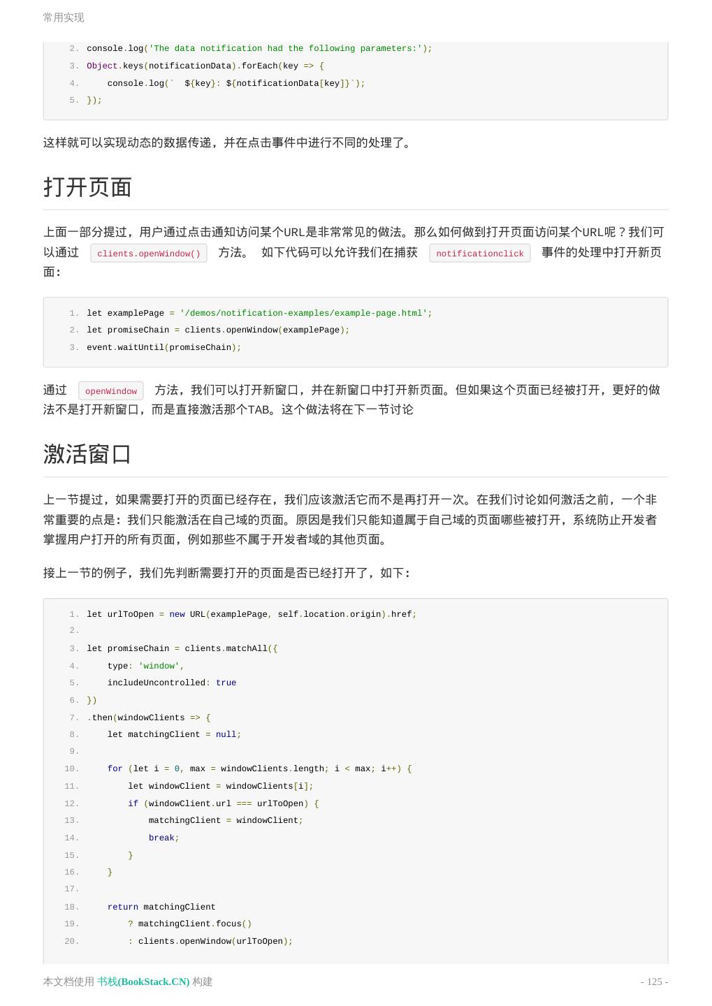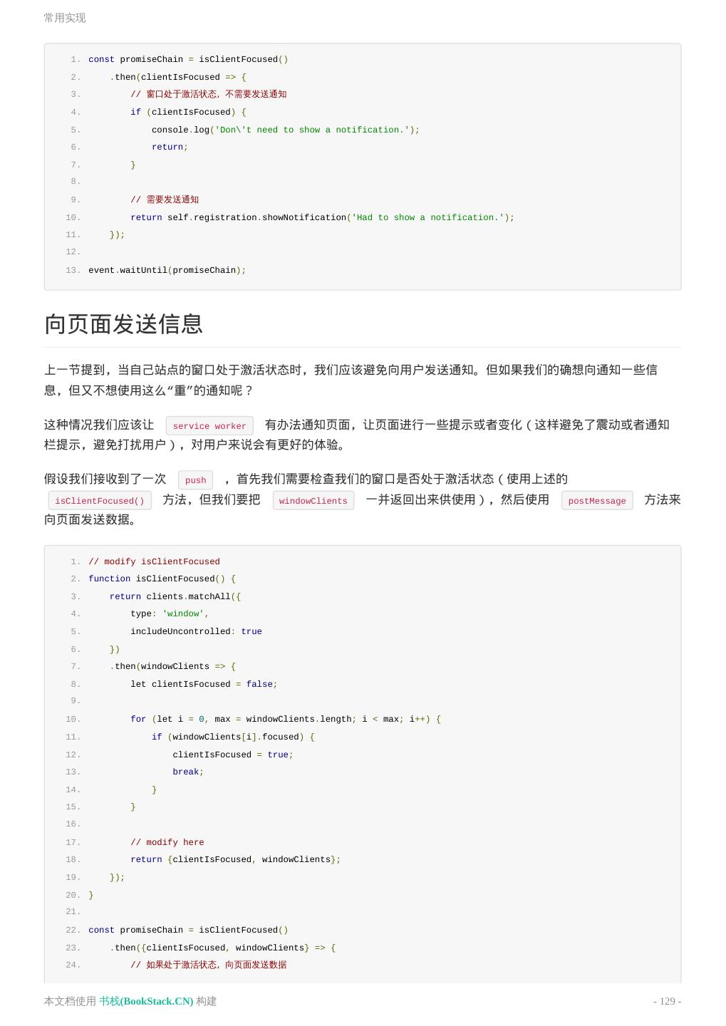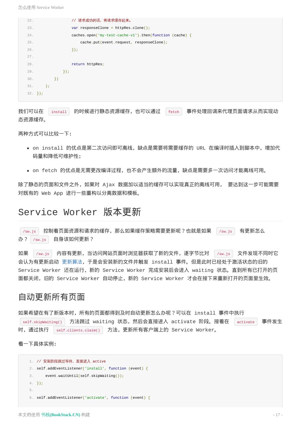 17 .怎么使用 Service Worker 22. // 请求成功的话,将请求缓存起来。 23. var responseClone = httpRes.clone(); 24. caches.open('my-test-cache-v1').then(function (cache) { 25. cache.put(event.request, responseClone); 26. }); 27. 28. return httpRes; 29. }); 30. }) 31. ); 32. }); 我们可以在 install 的时候进行静态资源缓存,也可以通过 fetch 事件处理回调来代理页面请求从而实现动 态资源缓存。 两种方式可以比较一下: on install 的优点是第二次访问即可离线,缺点是需要将需要缓存的 URL 在编译时插入到脚本中,增加代 码量和降低可维护性; on fetch 的优点是无需更改编译过程,也不会产生额外的流量,缺点是需要多一次访问才能离线可用。 除了静态的页面和文件之外,如果对 Ajax 数据加以适当的缓存可以实现真正的离线可用, 要达到这一步可能需要 对既有的 Web App 进行一些重构以分离数据和模板。 Service Worker 版本更新 /sw.js 控制着页面资源和请求的缓存,那么如果缓存策略需要更新呢?也就是如果 /sw.js 有更新怎么 办? /sw.js 自身该如何更新? 如果 /sw.js 内容有更新,当访问网站页面时浏览器获取了新的文件,逐字节比对 /sw.js 文件发现不同时它 会认为有更新启动 更新算法,于是会安装新的文件并触发 install 事件。但是此时已经处于激活状态的旧的 Service Worker 还在运行,新的 Service Worker 完成安装后会进入 waiting 状态。直到所有已打开的页 面都关闭,旧的 Service Worker 自动停止,新的 Service Worker 才会在接下来重新打开的页面里生效。 自动更新所有页面 如果希望在有了新版本时,所有的页面都得到及时自动更新怎么办呢?可以在 install 事件中执行 self.skipWaiting() 方法跳过 waiting 状态,然后会直接进入 activate 阶段。接着在 activate 事件发生 时,通过执行 self.clients.claim() 方法,更新所有客户端上的 Service Worker。 看一下具体实例: 1. // 安装阶段跳过等待,直接进入 active 2. self.addEventListener('install', function (event) { 3. event.waitUntil(self.skipWaiting()); 4. }); 5. 6. self.addEventListener('activate', function (event) { 本文档使用 书栈(BookStack.CN) 构建 - 17 -