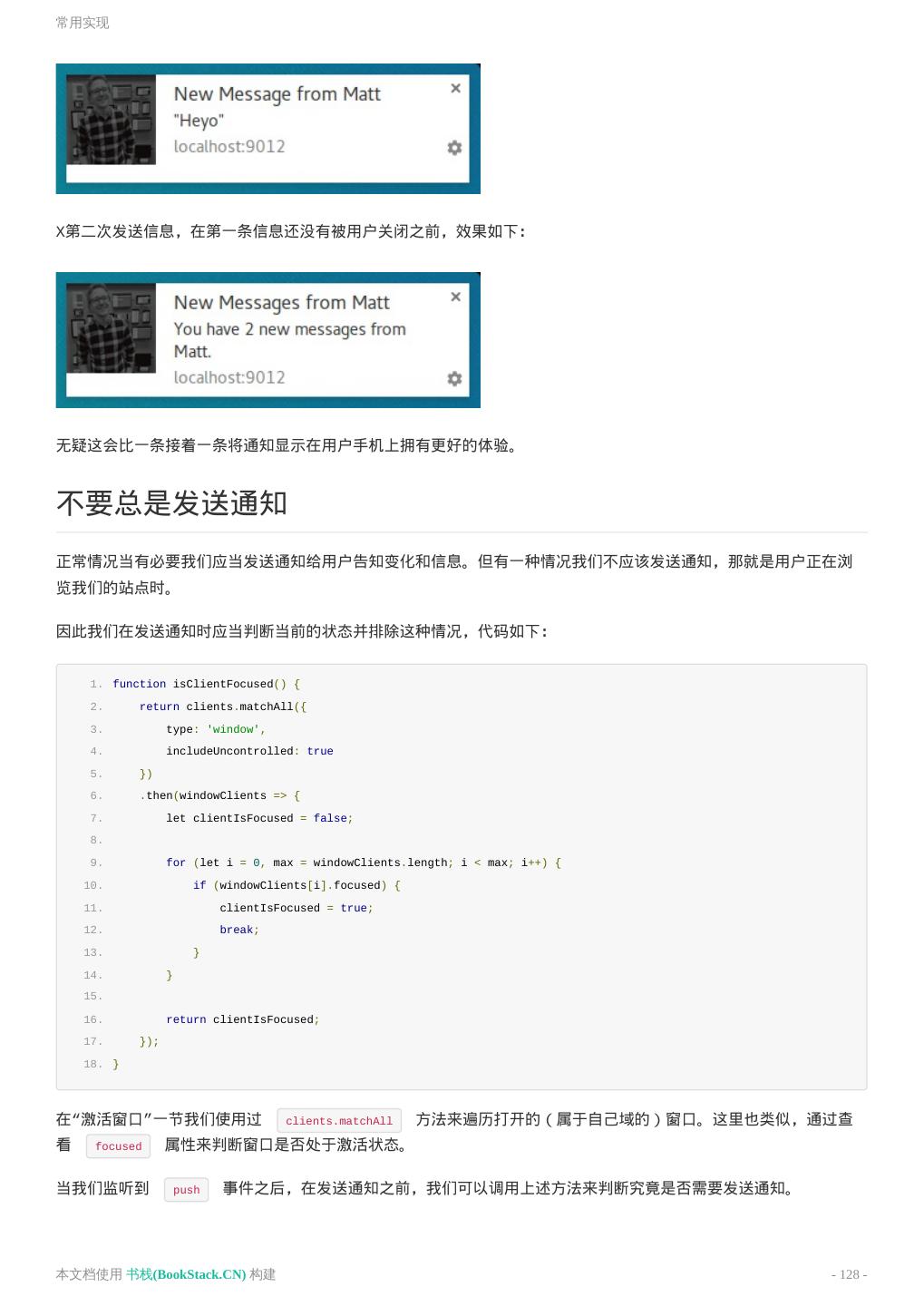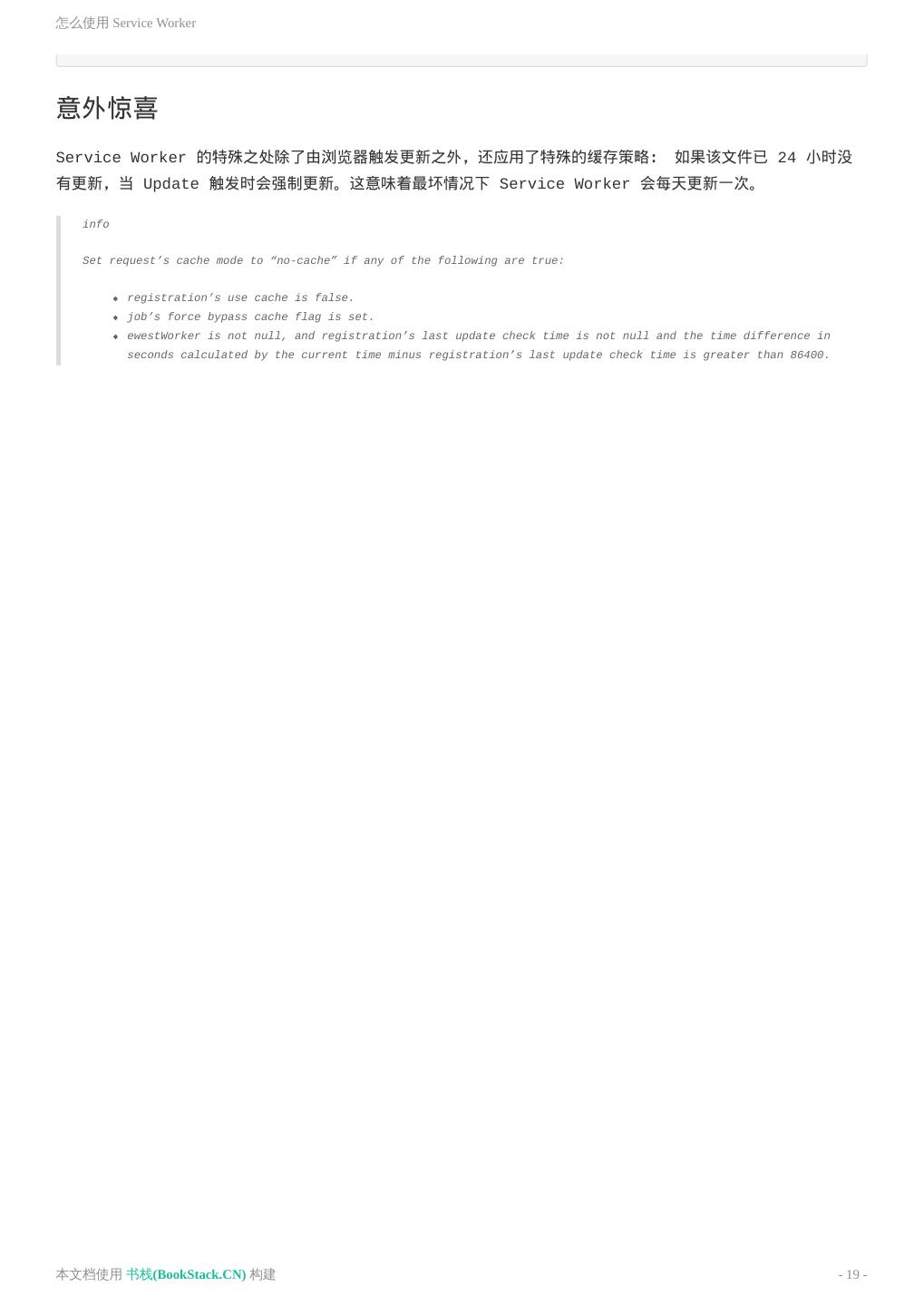 19 .怎么使用 Service Worker 意外惊喜 Service Worker 的特殊之处除了由浏览器触发更新之外,还应用了特殊的缓存策略: 如果该文件已 24 小时没 有更新,当 Update 触发时会强制更新。这意味着最坏情况下 Service Worker 会每天更新一次。 info Set request’s cache mode to “no-cache” if any of the following are true: registration’s use cache is false. job’s force bypass cache flag is set. ewestWorker is not null, and registration’s last update check time is not null and the time difference in seconds calculated by the current time minus registration’s last update check time is greater than 86400. 本文档使用 书栈(BookStack.CN) 构建 - 19 -