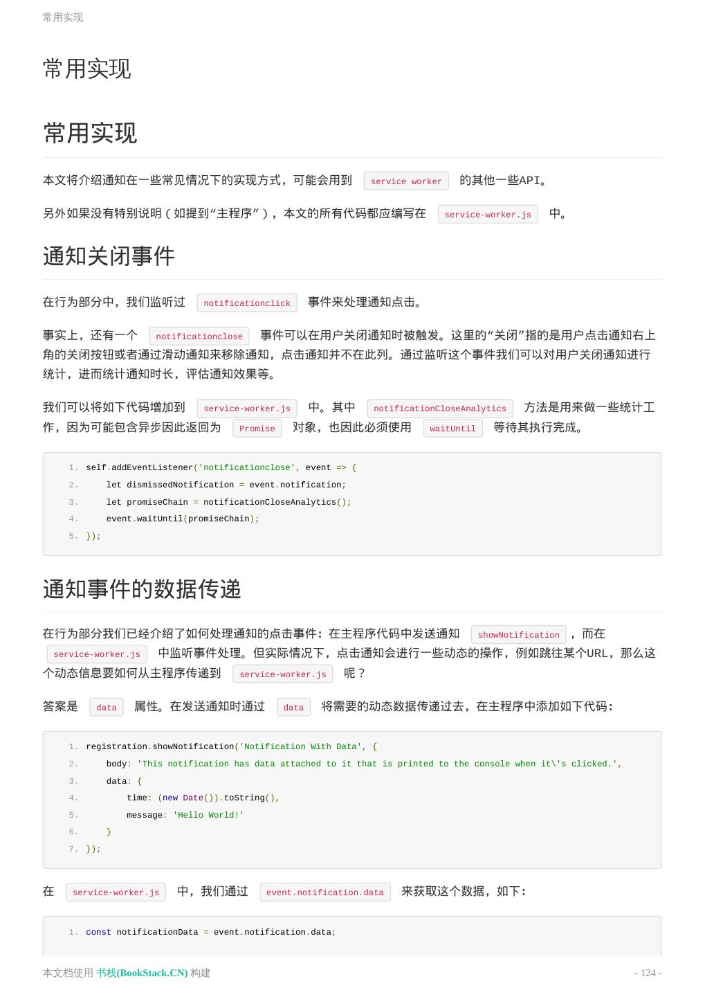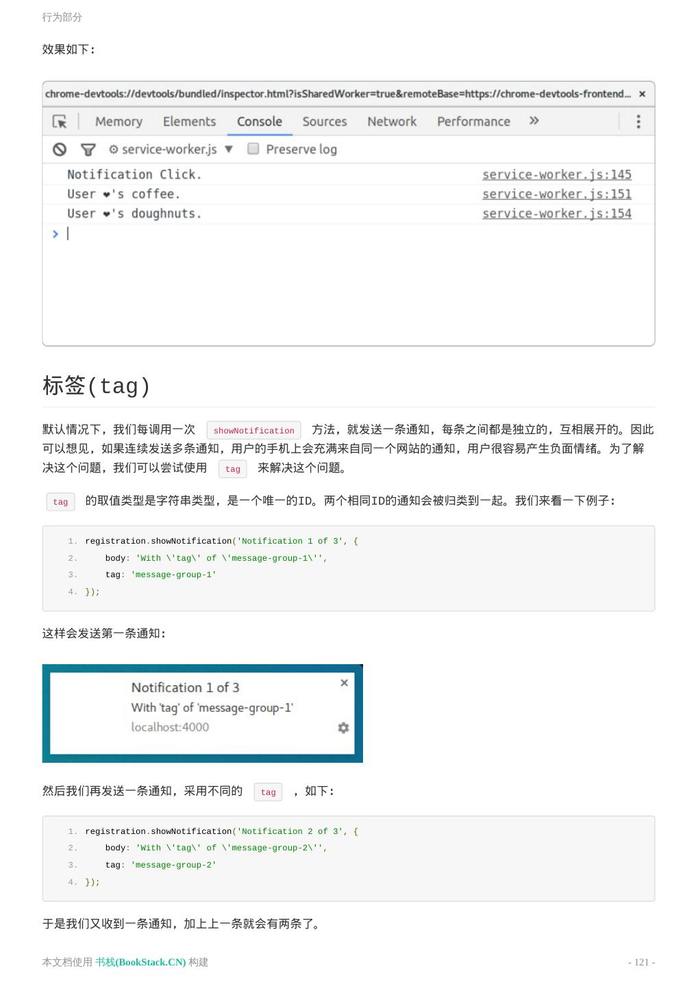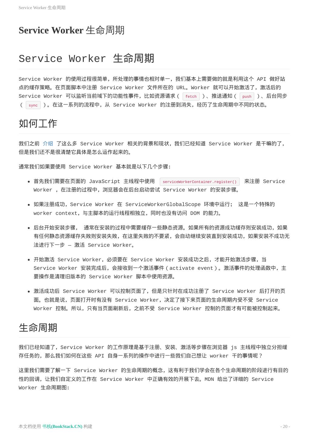 23 .Service Worker 生命周期 message:Service Worker 运行于独立 context 中,无法直接访问当前页面主线程的 DOM 等信息,但 是通过 postMessage API,可以实现他们之间的消息传递,这样主线程就可以接受 Service Worker 的 指令操作 DOM。 Service Worker 有几个重要的功能性的的事件,这些功能性的事件支撑和实现了 Service Worker 的特性。 fetch (请求):当浏览器在当前指定的 scope 下发起请求时,会触发 fetch 事件,并得到传有 response 参数的回调函数,回调中就可以做各种代理缓存的事情了。 push (推送):push 事件是为推送准备的。不过首先需要了解一下 Notification API 和 PUSH API。 通过 PUSH API,当订阅了推送服务后,可以使用推送方式唤醒 Service Worker 以响应来自系统消息传递 服务的消息,即使用户已经关闭了页面。 sync (后台同步):sync 事件由 background sync (后台同步)发出。background sync 配合 Service Worker 推出的 API,用于为 Service Worker 提供一个可以实现注册和监听同步处理的方法。 但它还不在 W3C Web API 标准中。在 Chrome 中这也只是一个实验性功能,需要访问 chrome://flags/#enable-experimental-web-platform-features ,开启该功能,然后重启生效。 本文档使用 书栈(BookStack.CN) 构建 - 23 -
