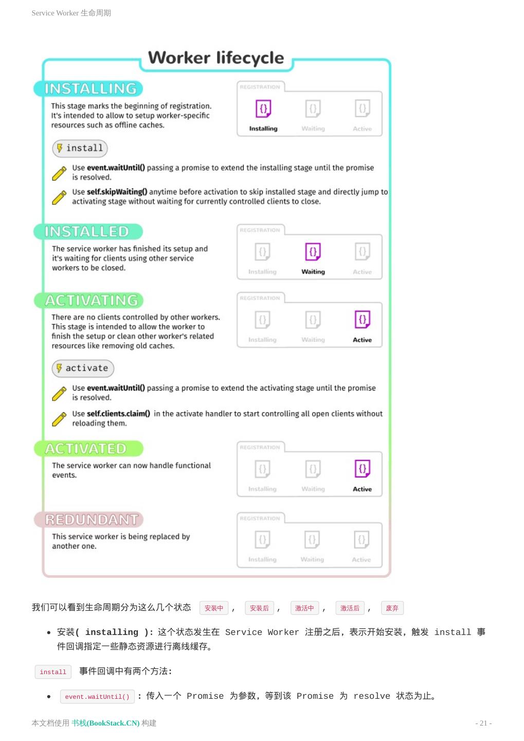21 .Service Worker 生命周期 我们可以看到生命周期分为这么几个状态 安装中 , 安装后 , 激活中 , 激活后 , 废弃 安装( installing ):这个状态发生在 Service Worker 注册之后,表示开始安装,触发 install 事 件回调指定一些静态资源进行离线缓存。 install 事件回调中有两个方法: event.waitUntil() :传入一个 Promise 为参数,等到该 Promise 为 resolve 状态为止。 本文档使用 书栈(BookStack.CN) 构建 - 21 -