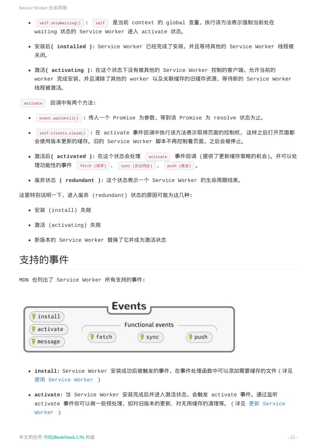 22 .Service Worker 生命周期 self.skipWaiting() : self 是当前 context 的 global 变量,执行该方法表示强制当前处在 waiting 状态的 Service Worker 进入 activate 状态。 安装后( installed ):Service Worker 已经完成了安装,并且等待其他的 Service Worker 线程被 关闭。 激活( activating ):在这个状态下没有被其他的 Service Worker 控制的客户端,允许当前的 worker 完成安装,并且清除了其他的 worker 以及关联缓存的旧缓存资源,等待新的 Service Worker 线程被激活。 activate 回调中有两个方法: event.waitUntil() :传入一个 Promise 为参数,等到该 Promise 为 resolve 状态为止。 self.clients.claim() :在 activate 事件回调中执行该方法表示取得页面的控制权, 这样之后打开页面都 会使用版本更新的缓存。旧的 Service Worker 脚本不再控制着页面,之后会被停止。 激活后( activated ):在这个状态会处理 activate 事件回调 (提供了更新缓存策略的机会)。并可以处 理功能性的事件 fetch (请求) 、 sync (后台同步) 、 push (推送) 。 废弃状态 ( redundant ):这个状态表示一个 Service Worker 的生命周期结束。 这里特别说明一下,进入废弃 (redundant) 状态的原因可能为这几种: 安装 (install) 失败 激活 (activating) 失败 新版本的 Service Worker 替换了它并成为激活状态 支持的事件 MDN 也列出了 Service Worker 所有支持的事件: install:Service Worker 安装成功后被触发的事件,在事件处理函数中可以添加需要缓存的文件(详见 使用 Service Worker ) activate:当 Service Worker 安装完成后并进入激活状态,会触发 activate 事件。通过监听 activate 事件你可以做一些预处理,如对旧版本的更新、对无用缓存的清理等。(详见 更新 Service Worker ) 本文档使用 书栈(BookStack.CN) 构建 - 22 -