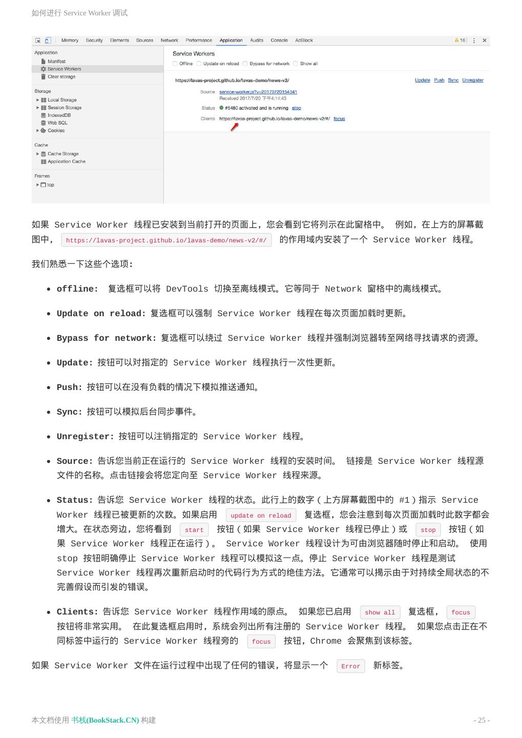 25 .如何进行 Service Worker 调试 如果 Service Worker 线程已安装到当前打开的页面上,您会看到它将列示在此窗格中。 例如,在上方的屏幕截 图中, https://lavas-project.github.io/lavas-demo/news-v2/#/ 的作用域内安装了一个 Service Worker 线程。 我们熟悉一下这些个选项: offline: 复选框可以将 DevTools 切换至离线模式。它等同于 Network 窗格中的离线模式。 Update on reload:复选框可以强制 Service Worker 线程在每次页面加载时更新。 Bypass for network:复选框可以绕过 Service Worker 线程并强制浏览器转至网络寻找请求的资源。 Update:按钮可以对指定的 Service Worker 线程执行一次性更新。 Push:按钮可以在没有负载的情况下模拟推送通知。 Sync:按钮可以模拟后台同步事件。 Unregister:按钮可以注销指定的 Service Worker 线程。 Source:告诉您当前正在运行的 Service Worker 线程的安装时间。 链接是 Service Worker 线程源 文件的名称。点击链接会将您定向至 Service Worker 线程来源。 Status:告诉您 Service Worker 线程的状态。此行上的数字(上方屏幕截图中的 #1)指示 Service Worker 线程已被更新的次数。如果启用 update on reload 复选框,您会注意到每次页面加载时此数字都会 增大。在状态旁边,您将看到 start 按钮(如果 Service Worker 线程已停止)或 stop 按钮(如 果 Service Worker 线程正在运行)。 Service Worker 线程设计为可由浏览器随时停止和启动。 使用 stop 按钮明确停止 Service Worker 线程可以模拟这一点。停止 Service Worker 线程是测试 Service Worker 线程再次重新启动时的代码行为方式的绝佳方法。它通常可以揭示由于对持续全局状态的不 完善假设而引发的错误。 Clients:告诉您 Service Worker 线程作用域的原点。 如果您已启用 show all 复选框, focus 按钮将非常实用。 在此复选框启用时,系统会列出所有注册的 Service Worker 线程。 如果您点击正在不 同标签中运行的 Service Worker 线程旁的 focus 按钮,Chrome 会聚焦到该标签。 如果 Service Worker 文件在运行过程中出现了任何的错误,将显示一个 Error 新标签。 本文档使用 书栈(BookStack.CN) 构建 - 25 -