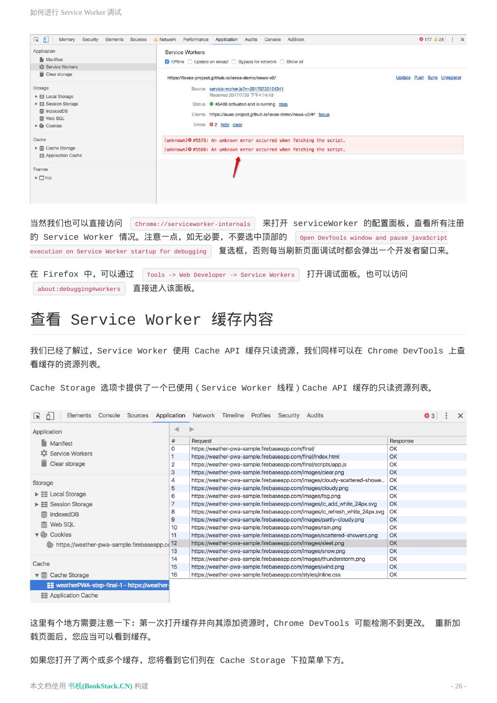 26 .如何进行 Service Worker 调试 当然我们也可以直接访问 Chrome://serviceworker-internals 来打开 serviceWorker 的配置面板,查看所有注册 的 Service Worker 情况。注意一点,如无必要,不要选中顶部的 Open DevTools window and pause javaScript execution on Service Worker startup for debugging 复选框,否则每当刷新页面调试时都会弹出一个开发者窗口来。 在 Firefox 中,可以通过 Tools -> Web Developer -> Service Workers 打开调试面板。也可以访问 about:debugging#workers 直接进入该面板。 查看 Service Worker 缓存内容 我们已经了解过,Service Worker 使用 Cache API 缓存只读资源,我们同样可以在 Chrome DevTools 上查 看缓存的资源列表。 Cache Storage 选项卡提供了一个已使用(Service Worker 线程)Cache API 缓存的只读资源列表。 这里有个地方需要注意一下:第一次打开缓存并向其添加资源时,Chrome DevTools 可能检测不到更改。 重新加 载页面后,您应当可以看到缓存。 如果您打开了两个或多个缓存,您将看到它们列在 Cache Storage 下拉菜单下方。 本文档使用 书栈(BookStack.CN) 构建 - 26 -