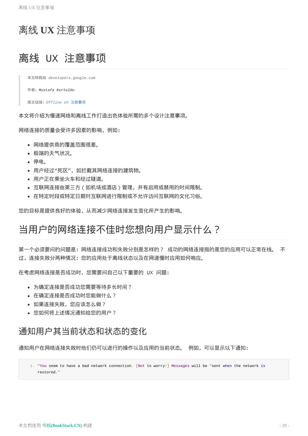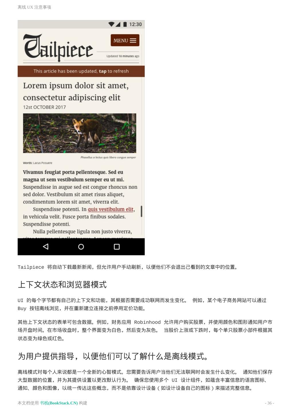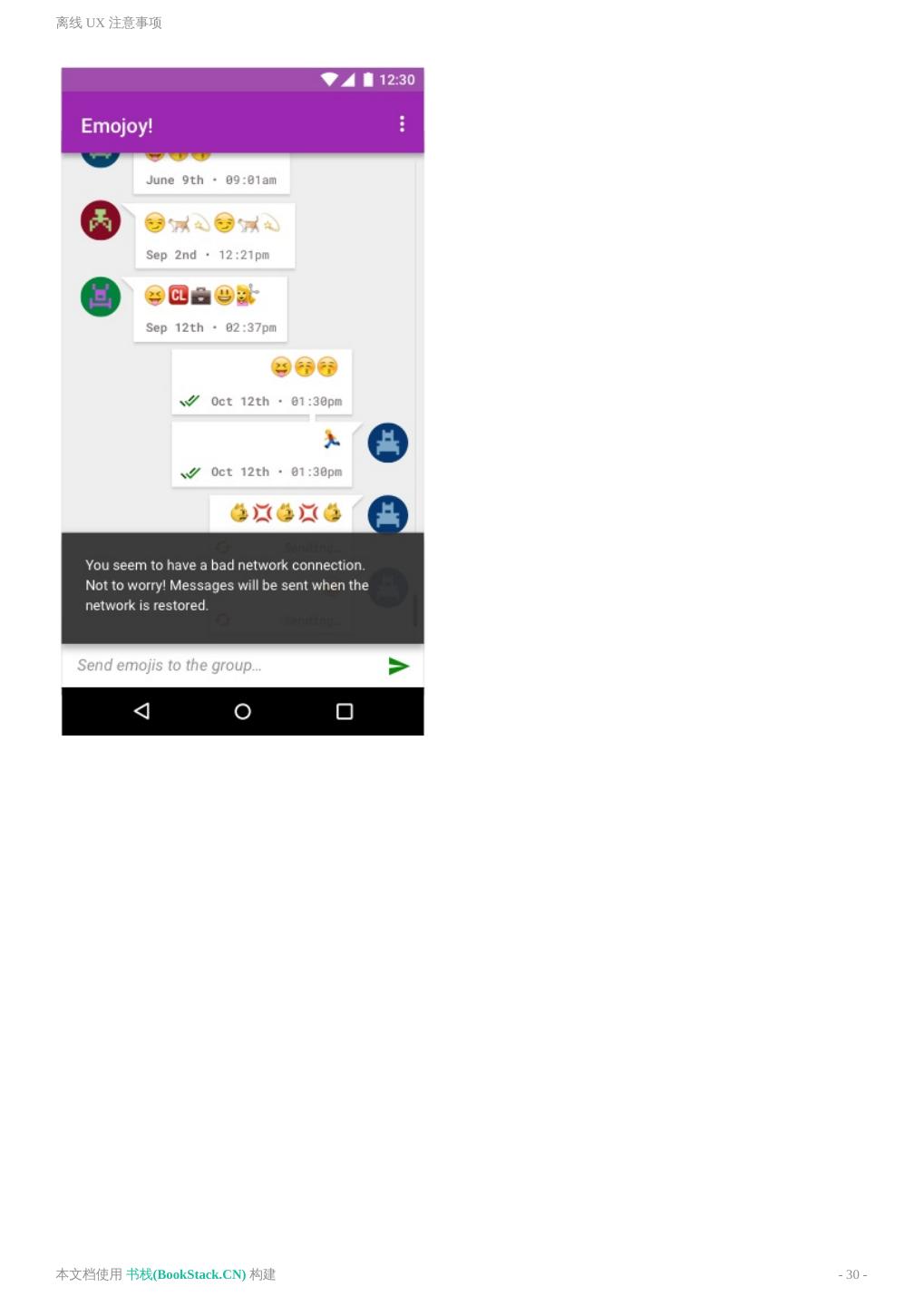29 .离线 UX 注意事项 离线 UX 注意事项 离线 UX 注意事项 本文转载自 developers.google.com 作者:Mustafa Kurtuldu 原文链接:Offline UX 注意事项 本文将介绍为慢速网络和离线工作打造出色体验所需的多个设计注意事项。 网络连接的质量会受许多因素的影响,例如: 网络提供商的覆盖范围很差。 极端的天气状况。 停电。 用户经过“死区”,如拦截其网络连接的建筑物。 用户正在乘坐火车和经过隧道。 互联网连接由第三方(如机场或酒店)管理,并有启用或禁用的时间限制。 在特定时段或特定日期对互联网进行限制或不允许访问互联网的文化习俗。 您的目标是提供良好的体验,从而减少网络连接发生变化所产生的影响。 当用户的网络连接不佳时您想向用户显示什么? 第一个必须要问的问题是:网络连接成功和失败分别是怎样的? 成功的网络连接指的是您的应用可以正常在线。 不 过,连接失败分两种情况:您的应用处于离线状态以及在网速慢时应用如何响应。 在考虑网络连接是否成功时,您需要问自己以下重要的 UX 问题: 为确定连接是否成功您需要等待多长时间? 在确定连接是否成功时您能做什么? 如果连接失败,您应该怎么做? 您如何将上述情况通知给您的用户? 通知用户其当前状态和状态的变化 通知用户在网络连接失败时他们仍可以进行的操作以及应用的当前状态。 例如,可以显示以下通知: 1. “You seem to have a bad network connection. [Not to worry!] Messages will be “sent when the network is restored.” 本文档使用 书栈(BookStack.CN) 构建 - 29 -