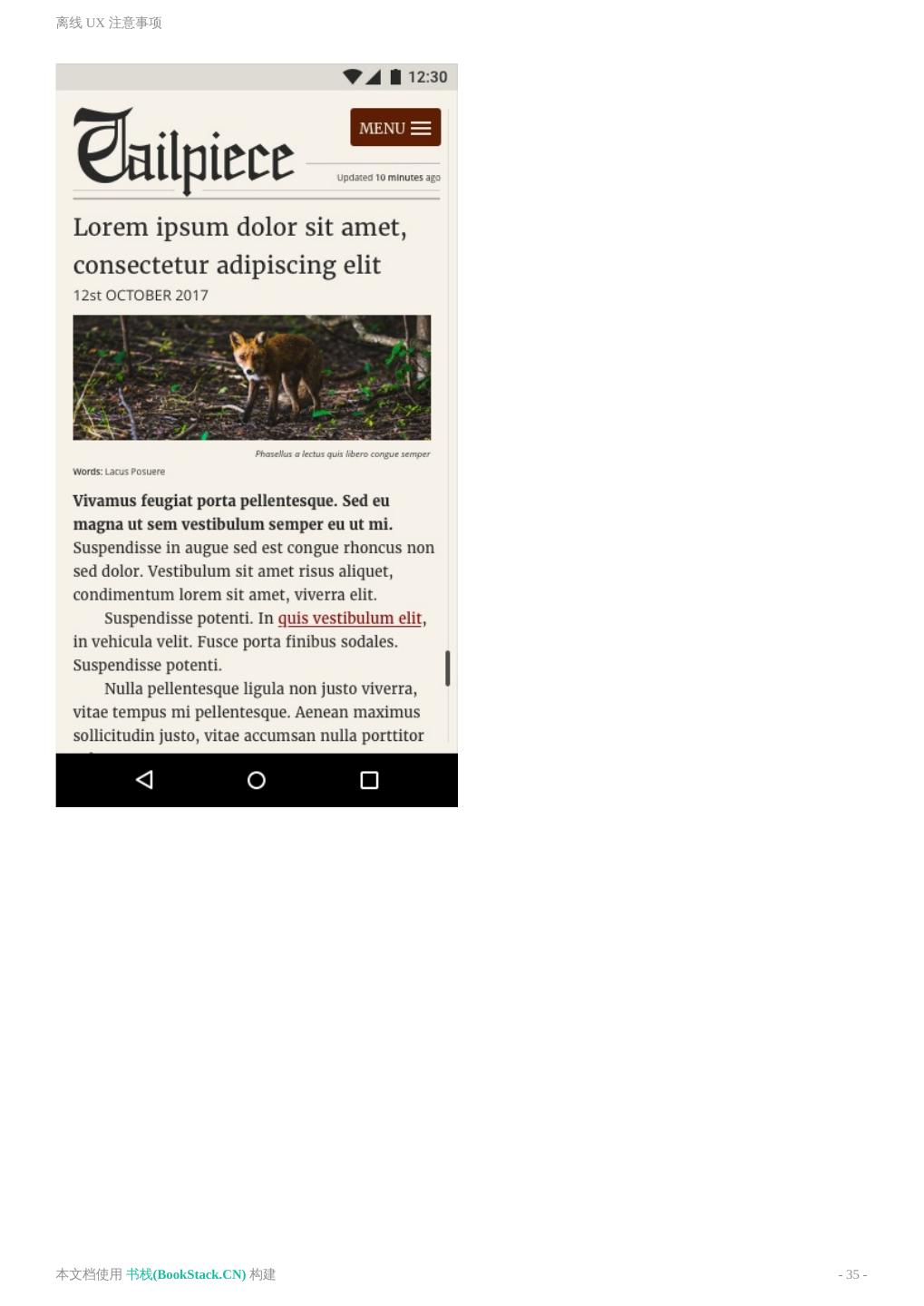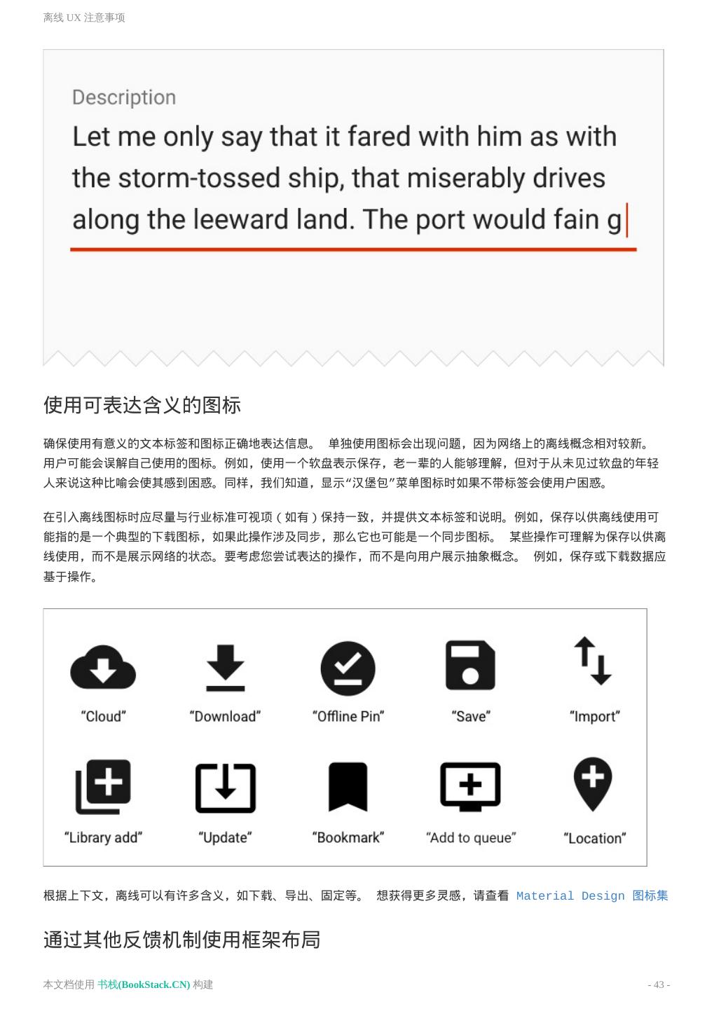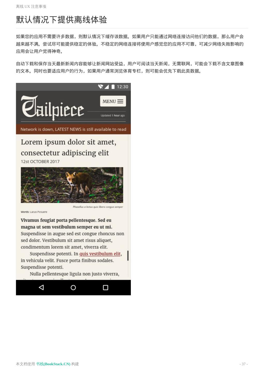 29 .离线 UX 注意事项 离线 UX 注意事项 离线 UX 注意事项 本文转载自 developers.google.com 作者:Mustafa Kurtuldu 原文链接:Offline UX 注意事项 本文将介绍为慢速网络和离线工作打造出色体验所需的多个设计注意事项。 网络连接的质量会受许多因素的影响,例如: 网络提供商的覆盖范围很差。 极端的天气状况。 停电。 用户经过“死区”,如拦截其网络连接的建筑物。 用户正在乘坐火车和经过隧道。 互联网连接由第三方(如机场或酒店)管理,并有启用或禁用的时间限制。 在特定时段或特定日期对互联网进行限制或不允许访问互联网的文化习俗。 您的目标是提供良好的体验,从而减少网络连接发生变化所产生的影响。 当用户的网络连接不佳时您想向用户显示什么? 第一个必须要问的问题是:网络连接成功和失败分别是怎样的? 成功的网络连接指的是您的应用可以正常在线。 不 过,连接失败分两种情况:您的应用处于离线状态以及在网速慢时应用如何响应。 在考虑网络连接是否成功时,您需要问自己以下重要的 UX 问题: 为确定连接是否成功您需要等待多长时间? 在确定连接是否成功时您能做什么? 如果连接失败,您应该怎么做? 您如何将上述情况通知给您的用户? 通知用户其当前状态和状态的变化 通知用户在网络连接失败时他们仍可以进行的操作以及应用的当前状态。 例如,可以显示以下通知: 1. “You seem to have a bad network connection. [Not to worry!] Messages will be “sent when the network is restored.” 本文档使用 书栈(BookStack.CN) 构建 - 29 -