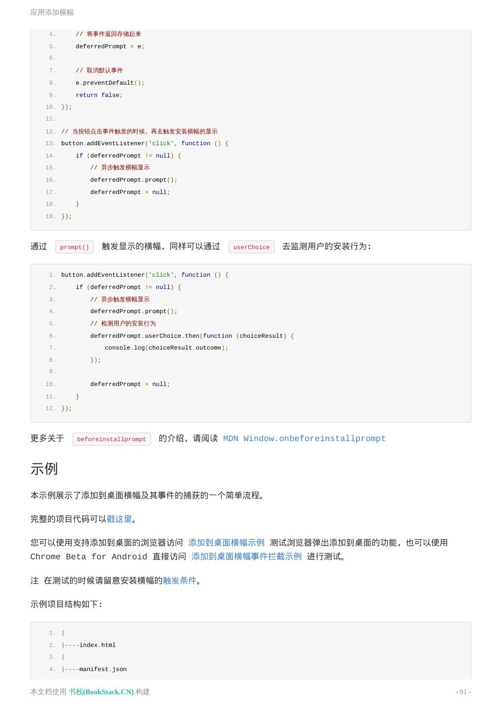 4 .致谢 致谢 当前文档 《PWA文档》 由 进击的皇虫 使用 书栈(BookStack.CN) 进行构建,生成于 2018-07-04。 书栈(BookStack.CN) 仅提供文档编写、整理、归类等功能,以及对文档内容的生成和导出工具。 文档内容由网友们编写和整理,书栈(BookStack.CN) 难以确认文档内容知识点是否错漏。如果您在阅读文档 获取知识的时候,发现文档内容有不恰当的地方,请向我们反馈,让我们共同携手,将知识准确、高效且有效地传递 给每一个人。 同时,如果您在日常工作、生活和学习中遇到有价值有营养的知识文档,欢迎分享到 书栈(BookStack.CN) , 为知识的传承献上您的一份力量! 如果当前文档生成时间太久,请到 书栈(BookStack.CN) 获取最新的文档,以跟上知识更新换代的步伐。 文档地址:http://www.bookstack.cn/books/pwa-doc 书栈官网:http://www.bookstack.cn 书栈开源:https://github.com/TruthHun 分享,让知识传承更久远! 感谢知识的创造者,感谢知识的分享者,也感谢每一位阅读到此处的读者,因为我们 都将成为知识的传承者。 本文档使用 书栈(BookStack.CN) 构建 - 4 -