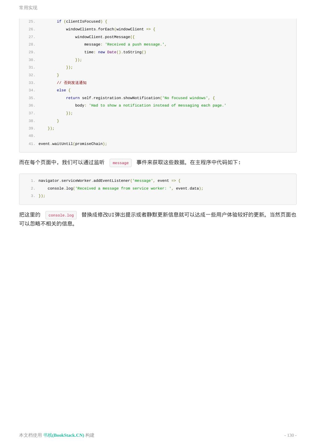 24 .如何进行 Service Worker 调试 如何进行 Service Worker 调试 如何进行 Service Worker 调试 开发 Service Worker 的过程中,我们如何让我们的开发更加高效并且准确的找出 bug 所在呢?我们在这一章专 门讲一讲如何调试 Service Worker。 Service Worker 作为独立于主线程的独立线程,在调试方面有其实和常规的 JavaScript 开发类似,我们关注 的点大概有如下几点: 代码是否有报错 Service Worker 能否顺利更新 在不同机型上的兼容性问题 debug 不同类型资源和请求的缓存策略的验证 debug 环境下的开发跳过等待状态 我们都知道,根据 Service Worker 生命周期的特性,如果浏览器还在使用旧的 Service Worker 版本,即使 有 Service Worker 新的版本也不会立即被浏览器激活,只能进行安装并进入等待状态,直到浏览器 Tab 标签被 重新关闭打开。 在开发调试 Service Worker 时肯定希望重新加载后立即激活,我们不希望每次都重新打开当前页面调试,为此我 们可以在 install 事件发生时通过 skipWaiting() 来设置 skip waiting 标记。 这样每次 Service Worker 安装后就会被立即激活。 1. self.addEventListener('install', function () { 2. if (ENV === 'development') { 3. self.skipWaiting(); 4. } 5. }); 但是当浏览器未检测到 Service Worker 发生变化时(比如该文件设置了 HTTP 缓存), 甚至连安装都不会被触 发。现在可以借助于浏览器 DevTools 调试了: 比如在 Chrome DevTools 的 Application 标签页勾选 Update on reload ,Chrome 会在每次刷新时去访问 Service Worker 文件并重新安装和激活。 借助 Chrome 浏览器 debug 使用 Chrome 浏览器,可以通过进入控制台 Application -> Service Workers 面板查看和调试。如下图所示: 本文档使用 书栈(BookStack.CN) 构建 - 24 -