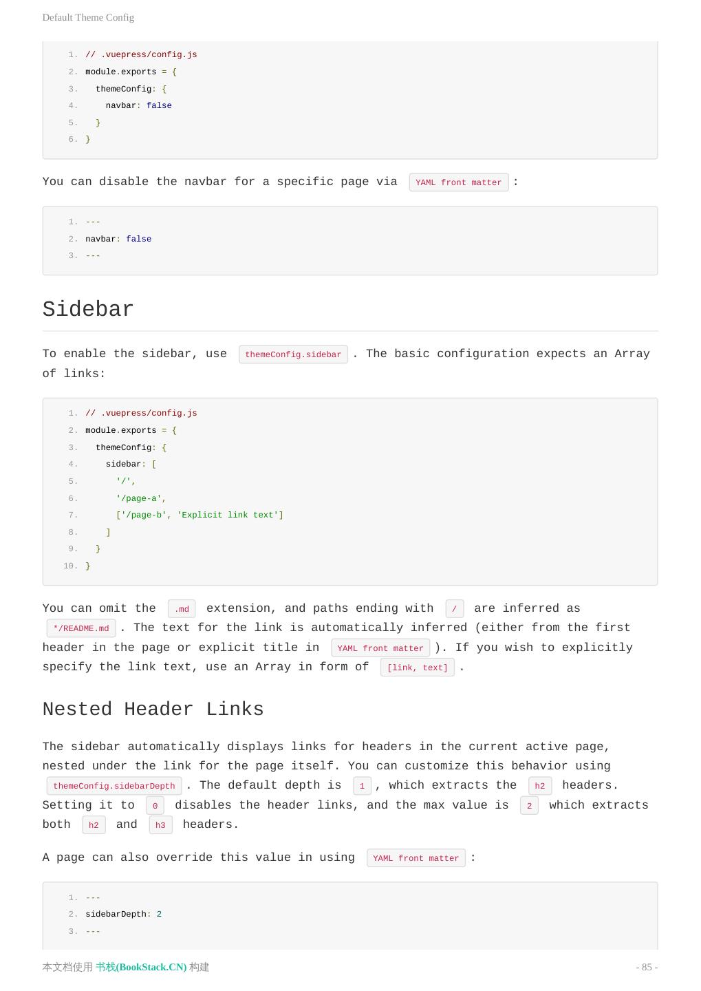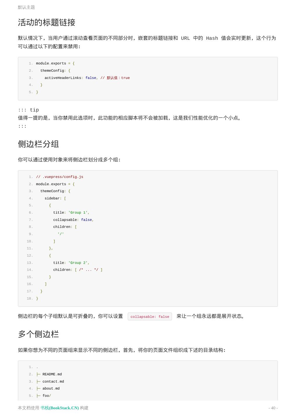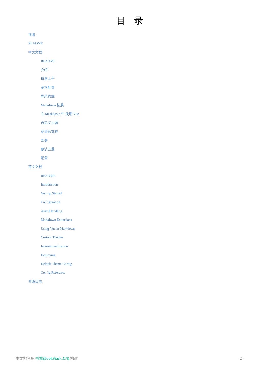 2 . 目 录 致谢 README 中文文档 README 介绍 快速上手 基本配置 静态资源 Markdown 拓展 在 Markdown 中 使用 Vue 自定义主题 多语言支持 部署 默认主题 配置 英文文档 README Introduction Getting Started Configuration Asset Handling Markdown Extensions Using Vue in Markdown Custom Themes Internationalization Deploying Default Theme Config Config Reference 升级日志 本文档使用 书栈(BookStack.CN) 构建 - 2 -