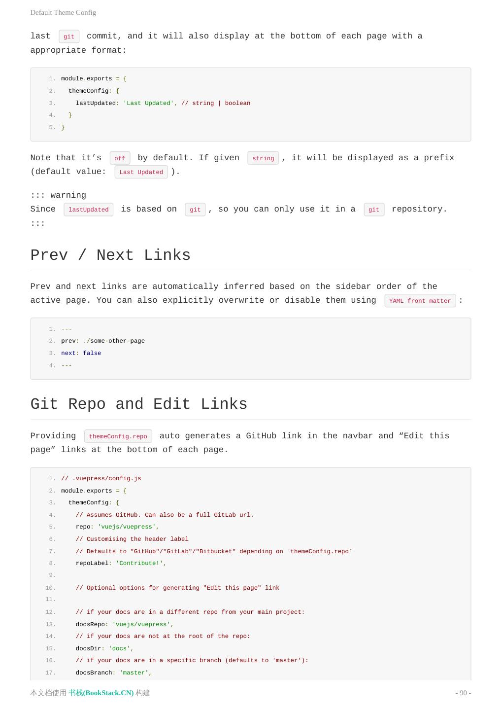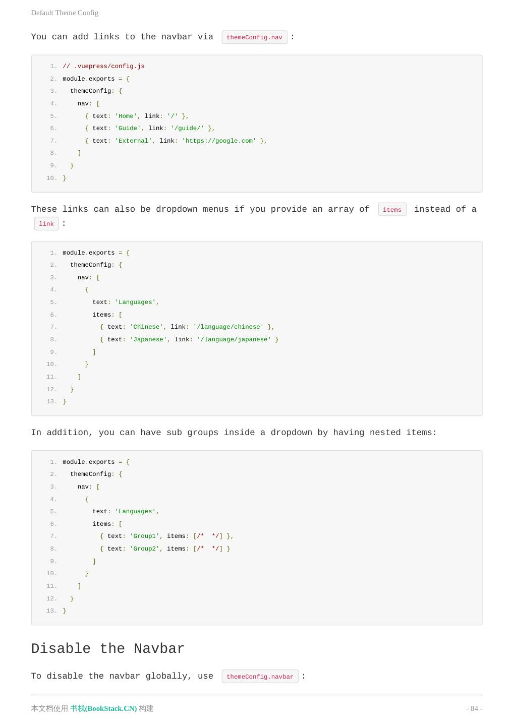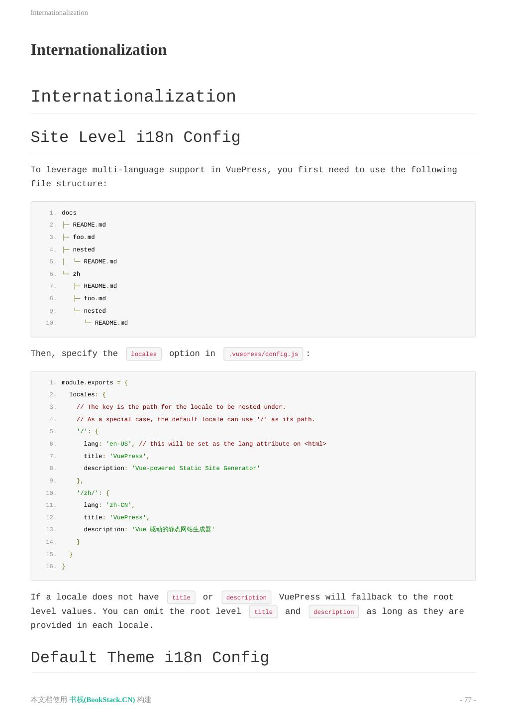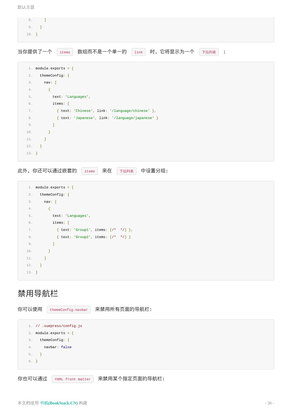 2 . 目 录 致谢 README 中文文档 README 介绍 快速上手 基本配置 静态资源 Markdown 拓展 在 Markdown 中 使用 Vue 自定义主题 多语言支持 部署 默认主题 配置 英文文档 README Introduction Getting Started Configuration Asset Handling Markdown Extensions Using Vue in Markdown Custom Themes Internationalization Deploying Default Theme Config Config Reference 升级日志 本文档使用 书栈(BookStack.CN) 构建 - 2 -