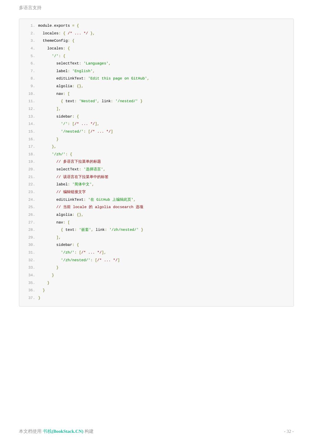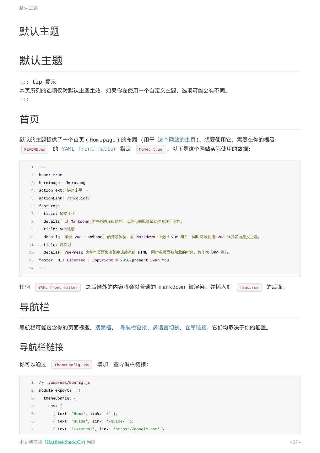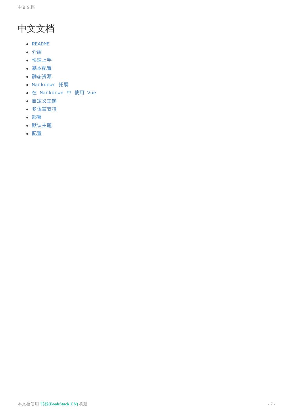 7 .中文文档 中文文档 README 介绍 快速上手 基本配置 静态资源 Markdown 拓展 在 Markdown 中 使用 Vue 自定义主题 多语言支持 部署 默认主题 配置 本文档使用 书栈(BookStack.CN) 构建 - 7 -