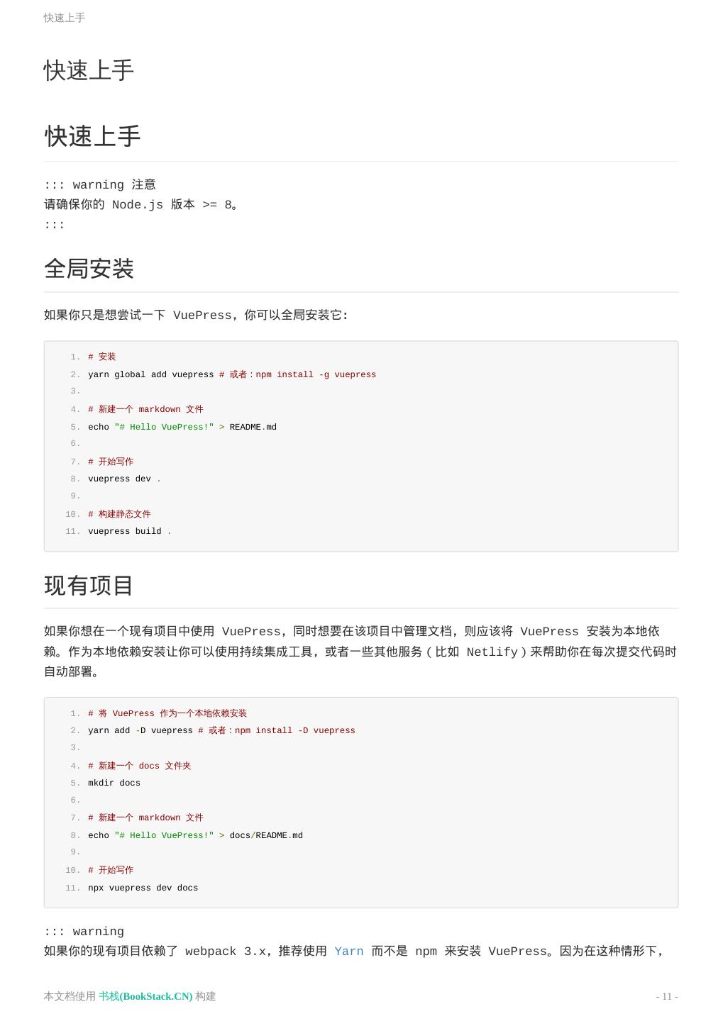 11 .快速上手 快速上手 快速上手 ::: warning 注意 请确保你的 Node.js 版本 >= 8。 ::: 全局安装 如果你只是想尝试一下 VuePress,你可以全局安装它: 1. # 安装 2. yarn global add vuepress # 或者:npm install -g vuepress 3. 4. # 新建一个 markdown 文件 5. echo "# Hello VuePress!" > README.md 6. 7. # 开始写作 8. vuepress dev . 9. 10. # 构建静态文件 11. vuepress build . 现有项目 如果你想在一个现有项目中使用 VuePress,同时想要在该项目中管理文档,则应该将 VuePress 安装为本地依 赖。作为本地依赖安装让你可以使用持续集成工具,或者一些其他服务(比如 Netlify)来帮助你在每次提交代码时 自动部署。 1. # 将 VuePress 作为一个本地依赖安装 2. yarn add -D vuepress # 或者:npm install -D vuepress 3. 4. # 新建一个 docs 文件夹 5. mkdir docs 6. 7. # 新建一个 markdown 文件 8. echo "# Hello VuePress!" > docs/README.md 9. 10. # 开始写作 11. npx vuepress dev docs ::: warning 如果你的现有项目依赖了 webpack 3.x,推荐使用 Yarn 而不是 npm 来安装 VuePress。因为在这种情形下, 本文档使用 书栈(BookStack.CN) 构建 - 11 -