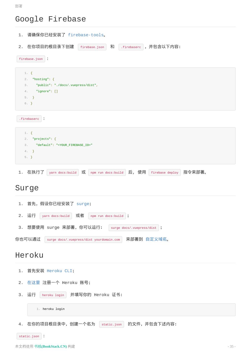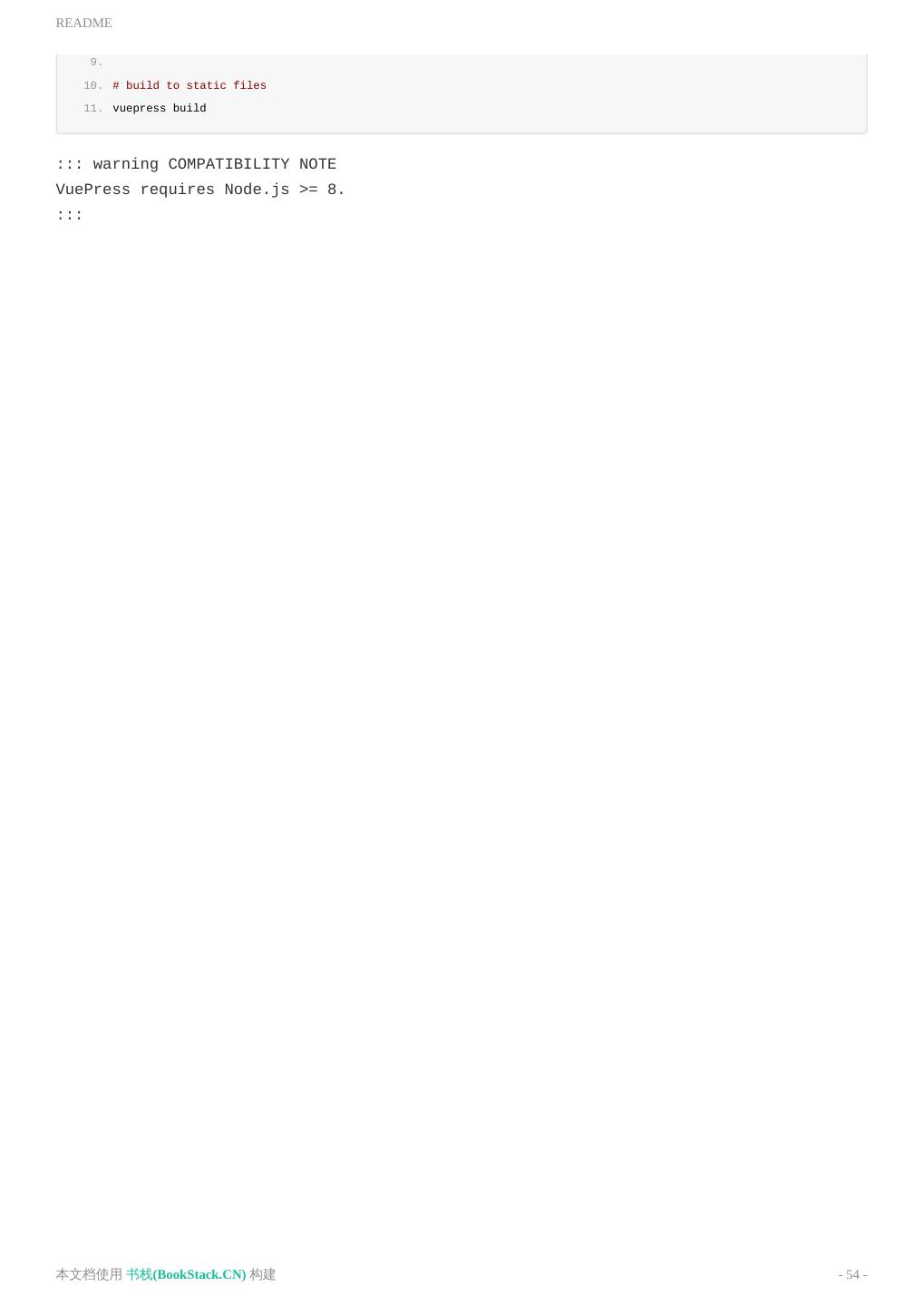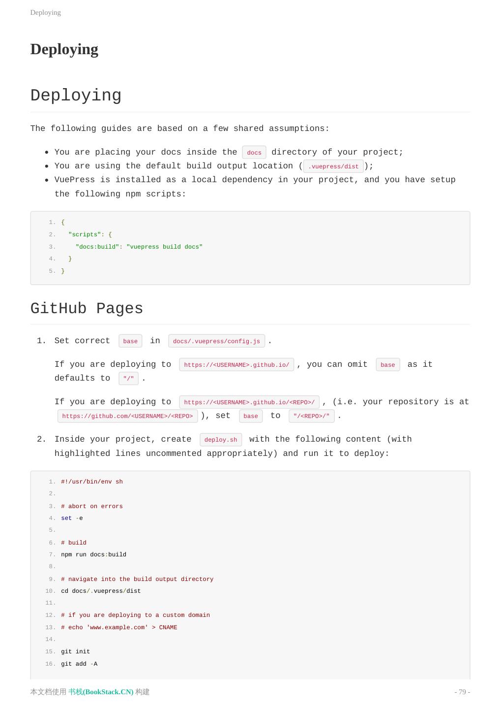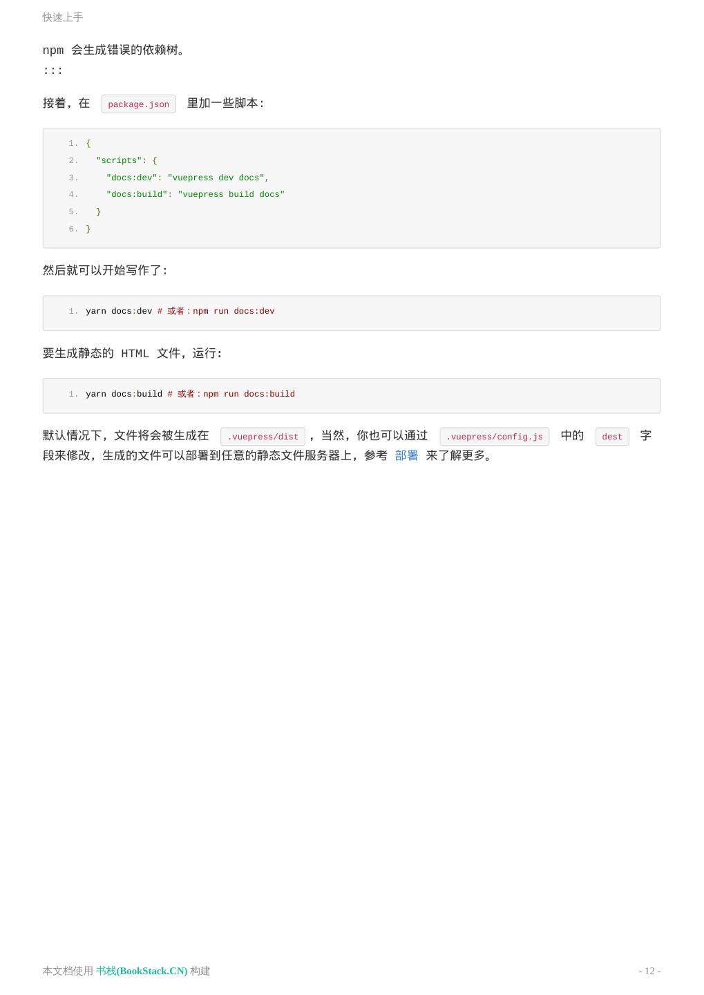 12 .快速上手 npm 会生成错误的依赖树。 ::: 接着,在 package.json 里加一些脚本: 1. { 2. "scripts": { 3. "docs:dev": "vuepress dev docs", 4. "docs:build": "vuepress build docs" 5. } 6. } 然后就可以开始写作了: 1. yarn docs:dev # 或者:npm run docs:dev 要生成静态的 HTML 文件,运行: 1. yarn docs:build # 或者:npm run docs:build 默认情况下,文件将会被生成在 .vuepress/dist ,当然,你也可以通过 .vuepress/config.js 中的 dest 字 段来修改,生成的文件可以部署到任意的静态文件服务器上,参考 部署 来了解更多。 本文档使用 书栈(BookStack.CN) 构建 - 12 -