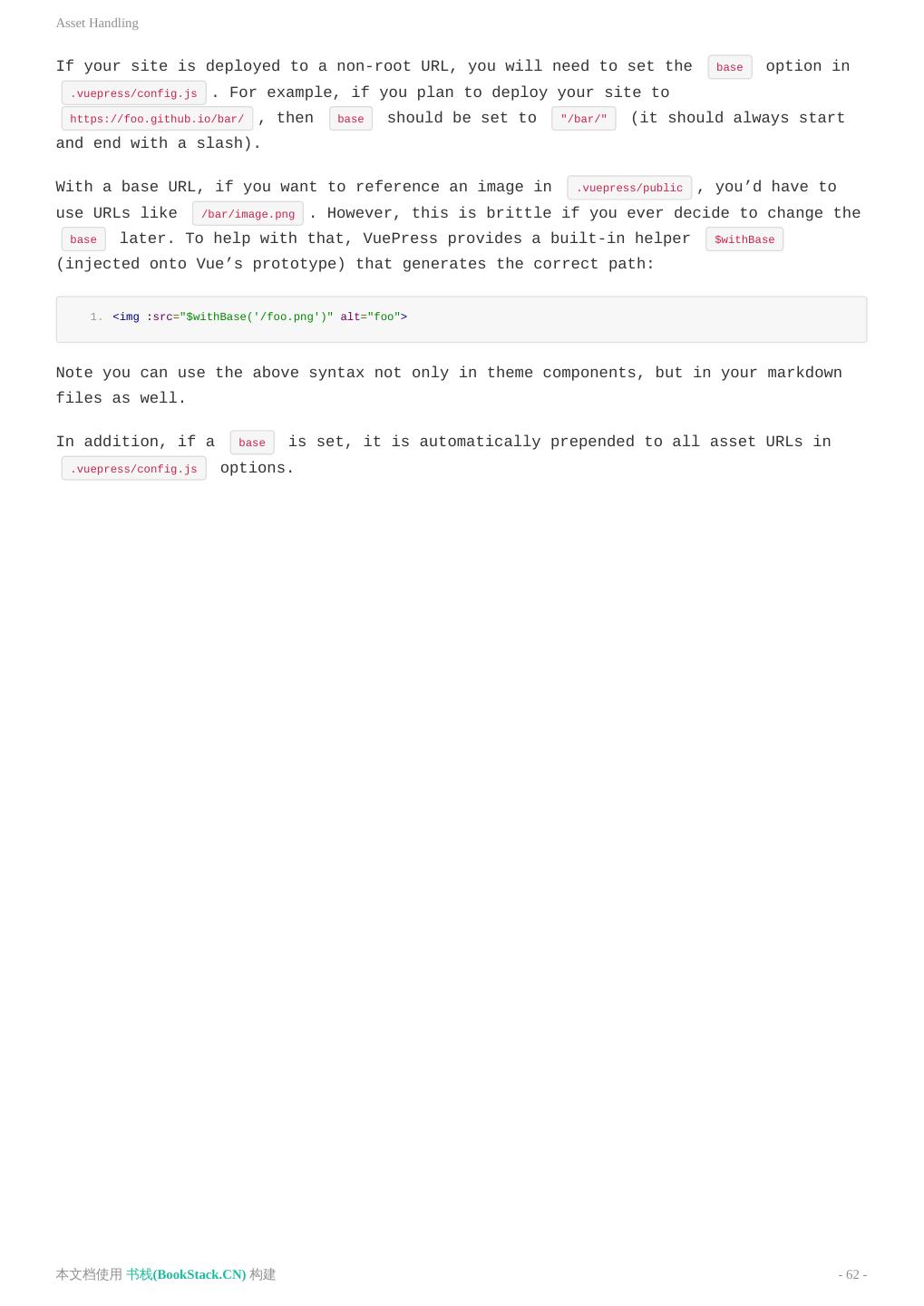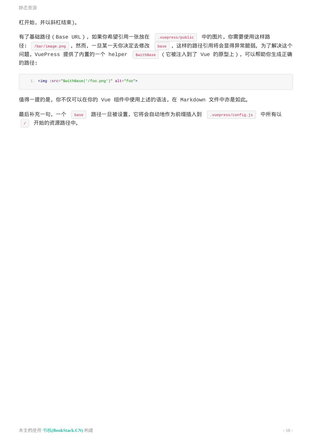 16 .静态资源 杠开始,并以斜杠结束)。 有了基础路径(Base URL),如果你希望引用一张放在 .vuepress/public 中的图片,你需要使用这样路 径: /bar/image.png ,然而,一旦某一天你决定去修改 base ,这样的路径引用将会显得异常脆弱。为了解决这个 问题,VuePress 提供了内置的一个 helper $withBase (它被注入到了 Vue 的原型上),可以帮助你生成正确 的路径: 1. <img :src="$withBase('/foo.png')" alt="foo"> 值得一提的是,你不仅可以在你的 Vue 组件中使用上述的语法,在 Markdown 文件中亦是如此。 最后补充一句,一个 base 路径一旦被设置,它将会自动地作为前缀插入到 .vuepress/config.js 中所有以 / 开始的资源路径中。 本文档使用 书栈(BookStack.CN) 构建 - 16 -