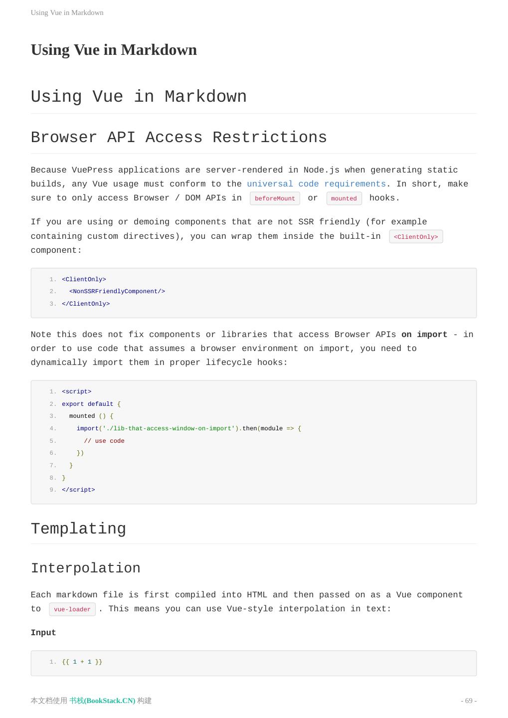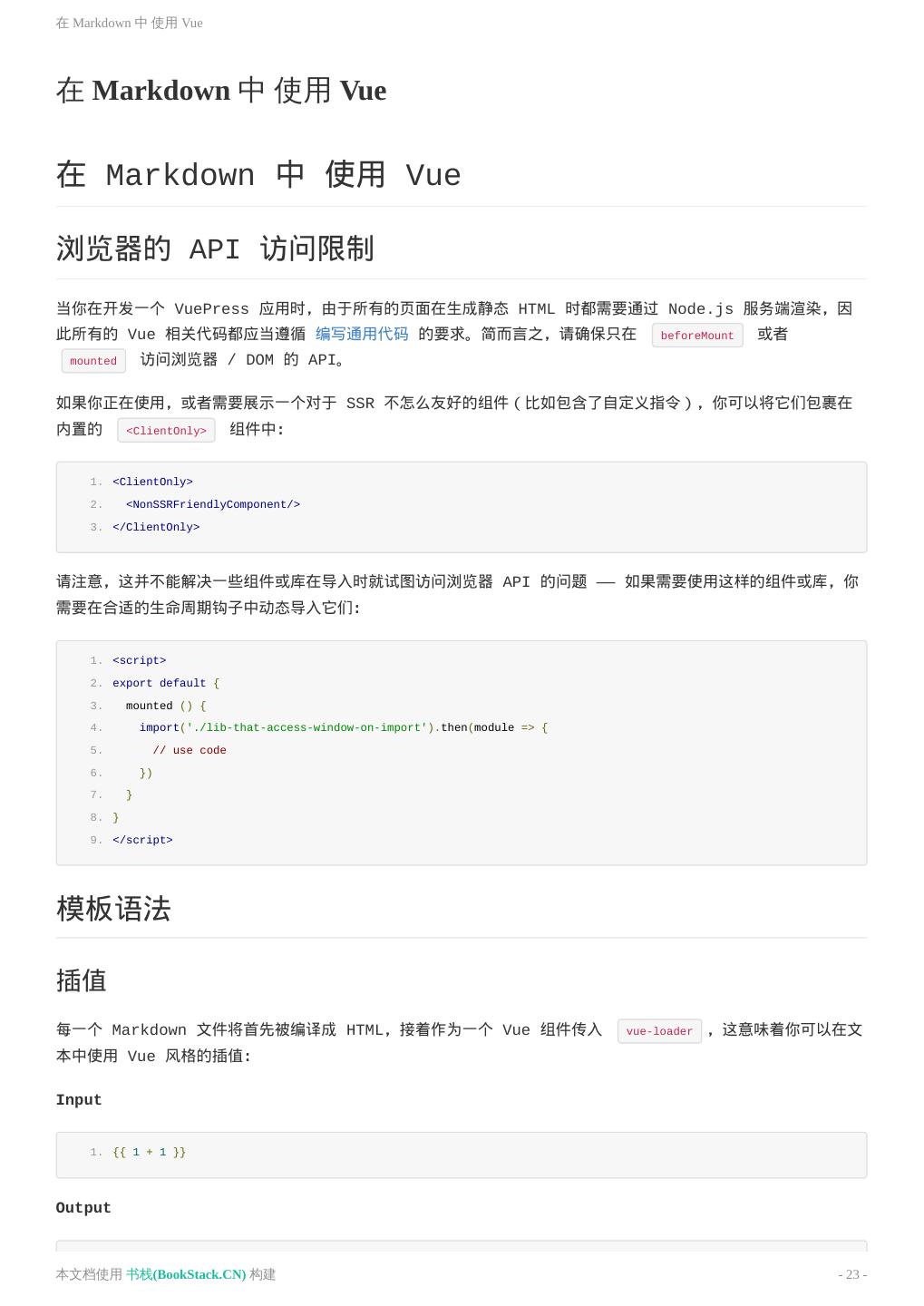 23 .在 Markdown 中 使用 Vue 在 Markdown 中 使用 Vue 在 Markdown 中 使用 Vue 浏览器的 API 访问限制 当你在开发一个 VuePress 应用时,由于所有的页面在生成静态 HTML 时都需要通过 Node.js 服务端渲染,因 此所有的 Vue 相关代码都应当遵循 编写通用代码 的要求。简而言之,请确保只在 beforeMount 或者 mounted 访问浏览器 / DOM 的 API。 如果你正在使用,或者需要展示一个对于 SSR 不怎么友好的组件(比如包含了自定义指令),你可以将它们包裹在 内置的 <ClientOnly> 组件中: 1. <ClientOnly> 2. <NonSSRFriendlyComponent/> 3. </ClientOnly> 请注意,这并不能解决一些组件或库在导入时就试图访问浏览器 API 的问题 —— 如果需要使用这样的组件或库,你 需要在合适的生命周期钩子中动态导入它们: 1. <script> 2. export default { 3. mounted () { 4. import('./lib-that-access-window-on-import').then(module => { 5. // use code 6. }) 7. } 8. } 9. </script> 模板语法 插值 每一个 Markdown 文件将首先被编译成 HTML,接着作为一个 Vue 组件传入 vue-loader ,这意味着你可以在文 本中使用 Vue 风格的插值: Input 1. {{ 1 + 1 }} Output 本文档使用 书栈(BookStack.CN) 构建 - 23 -