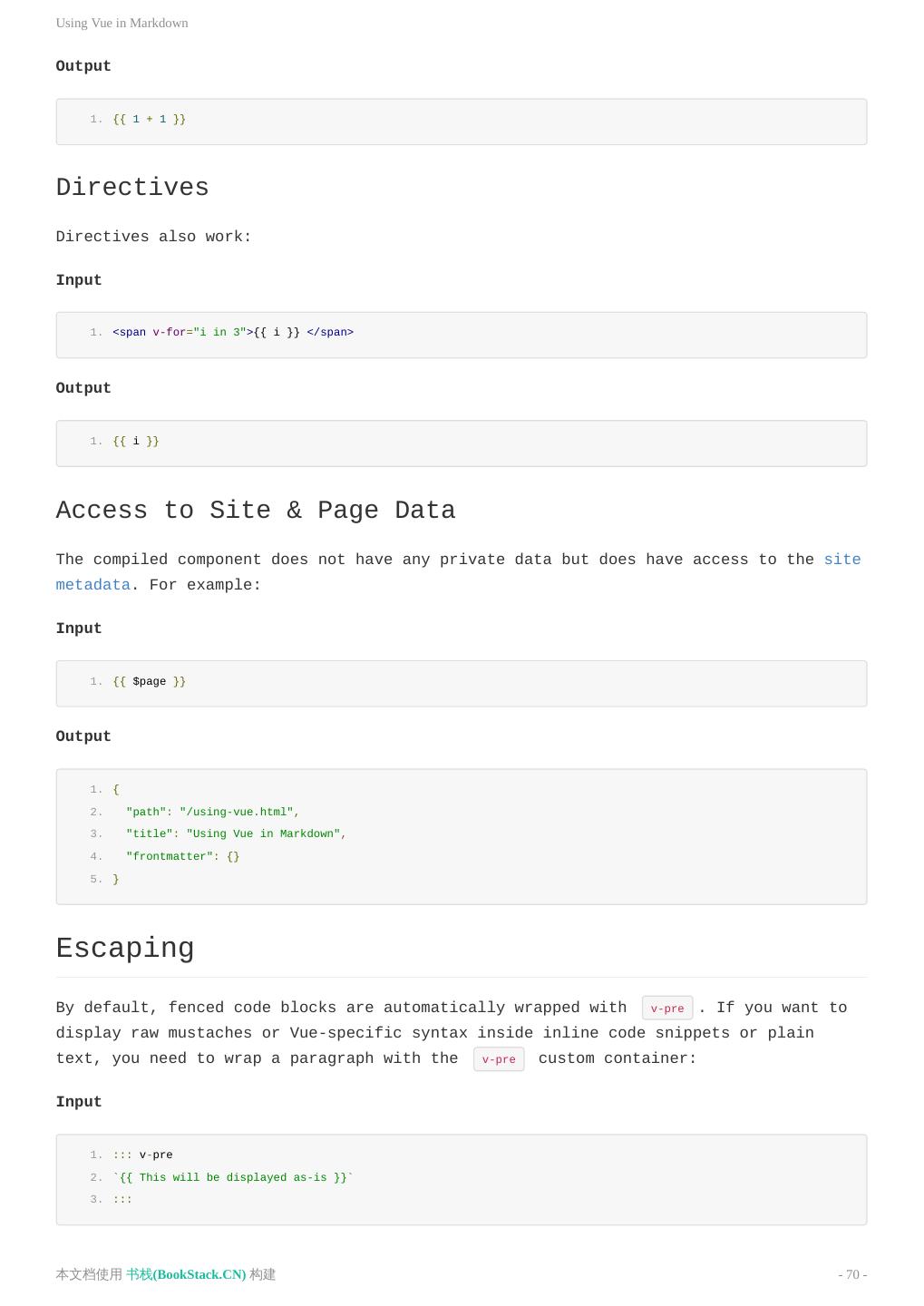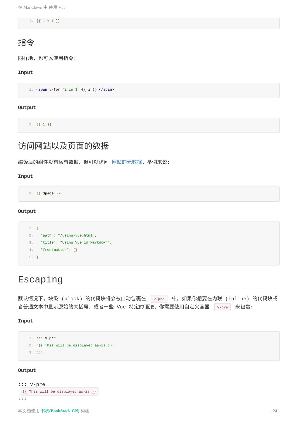24 .在 Markdown 中 使用 Vue 1. {{ 1 + 1 }} 指令 同样地,也可以使用指令: Input 1. <span v-for="i in 3">{{ i }} </span> Output 1. {{ i }} 访问网站以及页面的数据 编译后的组件没有私有数据,但可以访问 网站的元数据,举例来说: Input 1. {{ $page }} Output 1. { 2. "path": "/using-vue.html", 3. "title": "Using Vue in Markdown", 4. "frontmatter": {} 5. } Escaping 默认情况下,块级 (block) 的代码块将会被自动包裹在 v-pre 中。如果你想要在内联 (inline) 的代码块或 者普通文本中显示原始的大括号,或者一些 Vue 特定的语法,你需要使用自定义容器 v-pre 来包裹: Input 1. ::: v-pre 2. `{{ This will be displayed as-is }}` 3. ::: Output ::: v-pre {{ This will be displayed as-is }} ::: 本文档使用 书栈(BookStack.CN) 构建 - 24 -