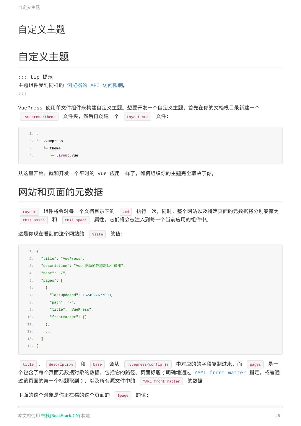 28 .自定义主题 自定义主题 自定义主题 ::: tip 提示 主题组件受到同样的 浏览器的 API 访问限制。 ::: VuePress 使用单文件组件来构建自定义主题。想要开发一个自定义主题,首先在你的文档根目录新建一个 .vuepress/theme 文件夹,然后再创建一个 Layout.vue 文件: 1. . 2. └─ .vuepress 3. └─ theme 4. └─ Layout.vue 从这里开始,就和开发一个平时的 Vue 应用一样了,如何组织你的主题完全取决于你。 网站和页面的元数据 Layout 组件将会对每一个文档目录下的 .md 执行一次,同时,整个网站以及特定页面的元数据将分别暴露为 this.$site 和 this.$page 属性,它们将会被注入到每一个当前应用的组件中。 这是你现在看到的这个网站的 $site 的值: 1. { 2. "title": "VuePress", 3. "description": "Vue 驱动的静态网站生成器", 4. "base": "/", 5. "pages": [ 6. { 7. "lastUpdated": 1524027677000, 8. "path": "/", 9. "title": "VuePress", 10. "frontmatter": {} 11. }, 12. ... 13. ] 14. } title , description 和 base 会从 .vuepress/config.js 中对应的的字段复制过来,而 pages 是一 个包含了每个页面元数据对象的数据,包括它的路径、页面标题(明确地通过 YAML front matter 指定,或者通 过该页面的第一个标题取到),以及所有源文件中的 YAML front matter 的数据。 下面的这个对象是你正在看的这个页面的 $page 的值: 本文档使用 书栈(BookStack.CN) 构建 - 28 -