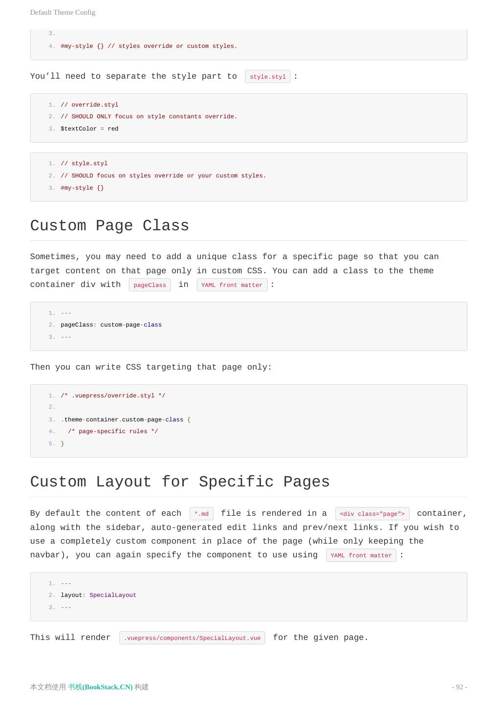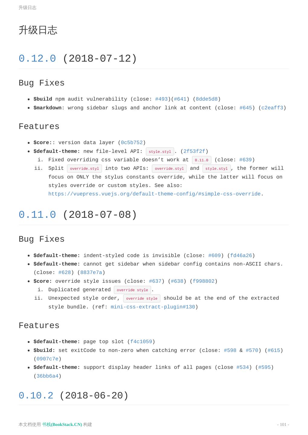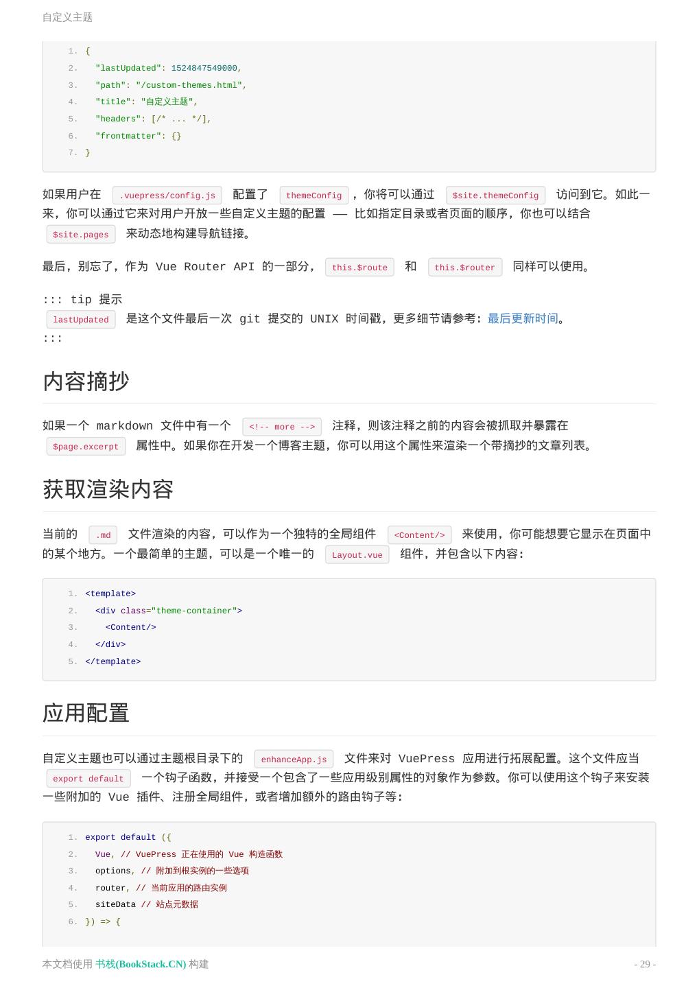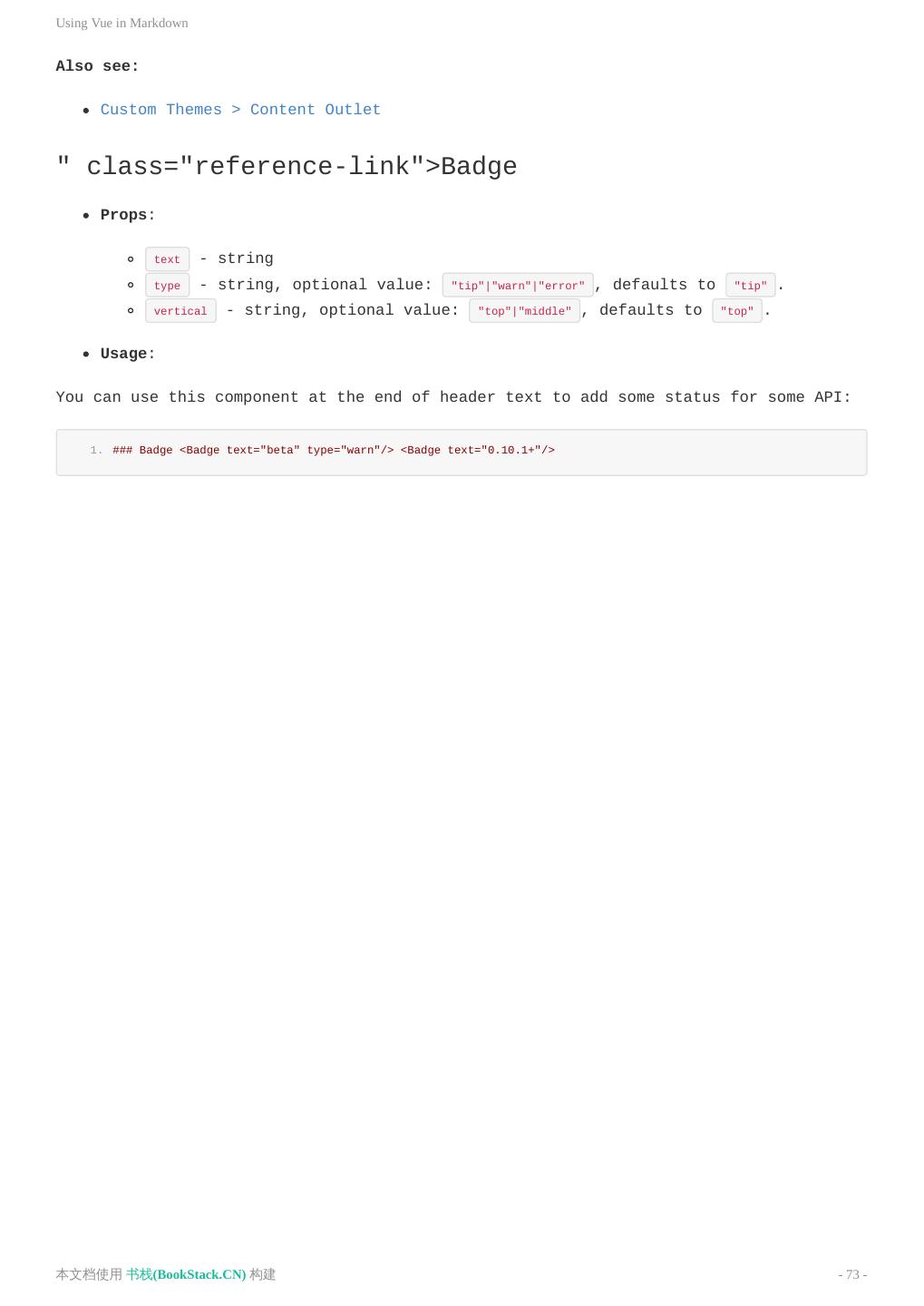 26 .在 Markdown 中 使用 Vue ::: 脚本和样式提升 有时,你可以只想在当前页面应用一些 JavaScript 或者 CSS,在这种情况下,你可以直接在 Markdown 文件中 使用原生的 <script> 或者 <style> 标签,它们将会从编译后的 HTML 文件中提取出来,并作为生成的 Vue 单文件组件的 <script> 和 <style> 标签。 内置的组件 " class="reference-link">OutboundLink () 用来表明当前是一个外部链接。在 VuePress 中这个组件会紧跟在每一个外部链接后面。 " class="reference-link">ClientOnly 参考 浏览器的 API 访问限制。 " class="reference-link">Content Props: custom - boolean 用法: 当前的 .md 文件渲染的内容,当你在使用 自定义布局 时,它将非常有用。 1. <Content/> 参考: 自定义主题 > 获取渲染内容 " class="reference-link">Badge Props: text - string type - string, 可选值: "tip"|"warn"|"error" ,默认值是: "tip" vertical - string, 可选值: "top"|"middle" ,默认值是: "top" Usage: 你可以在标题文本的末尾,使用这个组件来为某些 API 添加一些状态: 本文档使用 书栈(BookStack.CN) 构建 - 26 -