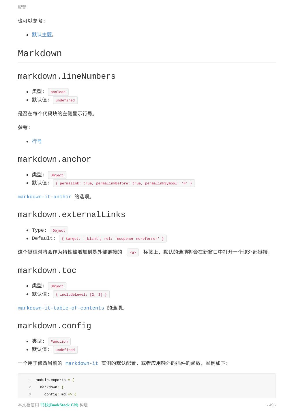22 .Markdown 拓展 1. <<< @/test/markdown/fragments/snippet.js{2} Output <<< @/test/markdown/fragments/snippet.js{2} ::: tip 注意 由于代码段的导入将在 webpack 编译之前执行,因此你无法使用 webpack 中的路径别名,此处的 @ 默认值 是 process.cwd() 。 ::: 进阶配置 VuePress 使用 markdown-it 来渲染 Markdown,上述大多数的拓展也都是通过自定义的插件实现的。想要进一 步的话,你可以通过 .vuepress/config.js 的 markdown 选项,来对当前的 markdown-it 实例做一些自定义 的配置: 1. module.exports = { 2. markdown: { 3. // markdown-it-anchor 的选项 4. anchor: { permalink: false }, 5. // markdown-it-toc 的选项 6. toc: { includeLevel: [1, 2] }, 7. config: md => { 8. // 使用更多的 markdown-it 插件! 9. md.use(require('markdown-it-xxx')) 10. } 11. } 12. } 本文档使用 书栈(BookStack.CN) 构建 - 22 -