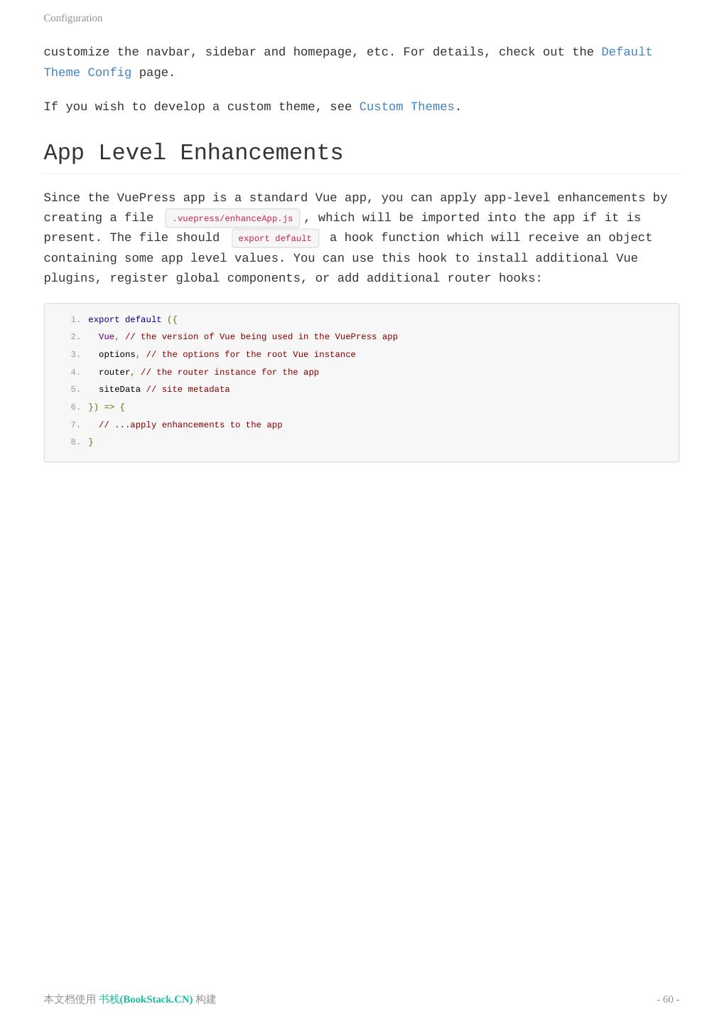 14 .基本配置 由于 VuePress 是一个标准的 Vue 应用,你可以通过创建一个 .vuepress/enhanceApp.js 文件来做一些应用级别 的配置,当该文件存在的时候,会被导入到应用内部。 enhanceApp.js 应该 export default 一个钩子函数,并接 受一个包含了一些应用级别属性的对象作为参数。你可以使用这个钩子来安装一些附加的 Vue 插件、注册全局组 件,或者增加额外的路由钩子等: 1. export default ({ 2. Vue, // VuePress 正在使用的 Vue 构造函数 3. options, // 附加到根实例的一些选项 4. router, // 当前应用的路由实例 5. siteData // 站点元数据 6. }) => { 7. // ...做一些其他的应用级别的优化 8. } 本文档使用 书栈(BookStack.CN) 构建 - 14 -
