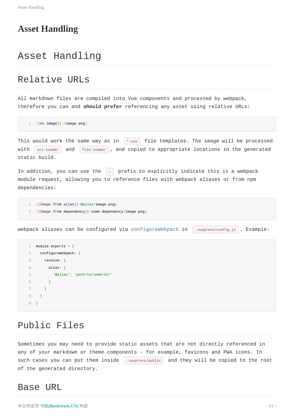 15 .静态资源 静态资源 静态资源 相对路径 所有的 Markdown 文件都会被 webpack 编译成 Vue 组件,因此你可以,并且应该更倾向于使用相对路径 (Relative URLs)来引用所有的静态资源: 1.  同样地,这在 *.vue 文件的模板中一样可以工作,图片将会被 url-loader 和 file-loader 处理,在运行 生成静态文件的构建任务时,文件会被复制到正确的位置。 除此之外,你也使用 ~ 前缀来明确地指出这是一个 webpack 的模块请求,这将允许你通过 webpack 别名来 引用文件或者 npm 的依赖: 1.  2.  Webpack 的别名可以通过 .vuepress/config.js 中 configureWebpack 来配置,如: 1. module.exports = { 2. configureWebpack: { 3. resolve: { 4. alias: { 5. '@alias': 'path/to/some/dir' 6. } 7. } 8. } 9. } 公共文件 有时,你可能需要提供一个静态资源,但是它们并不直接被你的任何一个 markdown 文件或者主题组件引用 —— 举 例来说,favicons 和 PWA 的图标,在这种情形下,你可以将它们放在 .vuepress/public 中, 它们最终会被复 制到生成的静态文件夹中。 基础路径 如果你的网站会被部署到一个非根路径,你将需要在 .vuepress/config.js 中设置 base ,举例来说,如果你打 算将你的网站部署到 https://foo.github.io/bar/ ,那么 base 的值就应该被设置为 "/bar/" (应当总是以斜 本文档使用 书栈(BookStack.CN) 构建 - 15 -