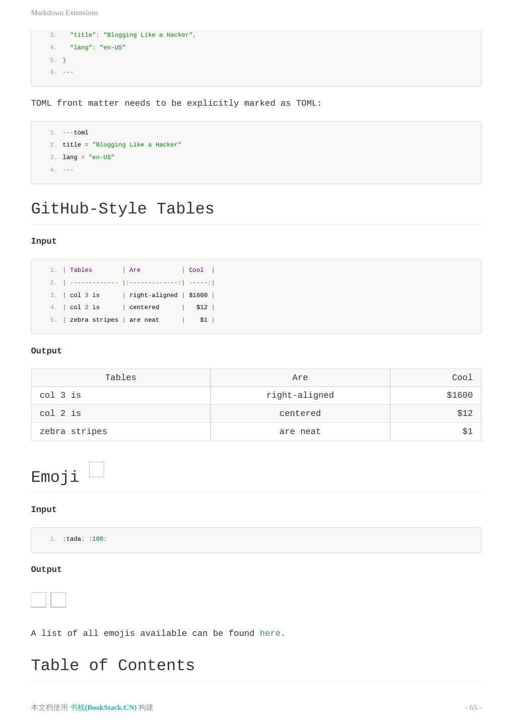 19 .Markdown 拓展 1. ---toml 2. title = "Blogging Like a Hacker" 3. lang = "en-US" 4. --- GitHub 风格的表格 Input 1. | Tables | Are | Cool | 2. | ------------- |:-------------:| -----:| 3. | col 3 is | right-aligned | $1600 | 4. | col 2 is | centered | $12 | 5. | zebra stripes | are neat | $1 | Output Tables Are Cool col 3 is right-aligned $1600 col 2 is centered $12 zebra stripes are neat $1 Emoji Input 1. :tada: :100: Output 目录 Input 1. [[toc]] Output [[toc]] 目录(Table of Contents)的渲染可以通过 markdown.toc 选项来配置。 本文档使用 书栈(BookStack.CN) 构建 - 19 -