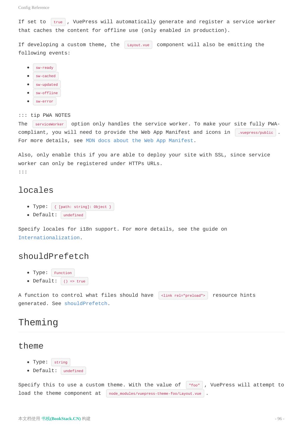 13 .基本配置 基本配置 基本配置 配置文件 如果没有任何配置,这个网站将会是非常局限的,用户也无法在你的网站上自由导航。为了更好地自定义你的网站, 让我们首先在你的文档目录下创建一个 .vuepress 目录,所有 VuePress 相关的文件都将会被放在这里。你的项 目结构可能是这样: 1. . 2. ├─ docs 3. │ ├─ README.md 4. │ └─ .vuepress 5. │ └─ config.js 6. └─ package.json 一个 VuePress 网站必要的配置文件是 .vuepress/config.js ,它应该导出一个 JavaScript 对象: 1. module.exports = { 2. title: 'Hello VuePress', 3. description: 'Just playing around' 4. } 对于上述的配置,如果你运行起 dev server,你应该能看到一个页面,它包含一个页头,里面包含一个标题和一个 搜索框。VuePress 内置了基于 headers 的搜索 —— 它会自动为所有页面的标题、 h2 和 h3 构建起一个 简单的搜索索引。 参见 配置 来查看所有可配置的选项。 ::: tip 其他配置格式 你也可以使用 YAML ( .vuepress/config.yml ) 或是 TOML ( .vuepress/config.toml ) 格式的配置文件。 ::: 主题配置 一个 VuePress 主题应该负责整个网站的布局和交互细节。在 VuePress 中,目前自带了一个默认的主题(正是 你现在所看到的),它是为技术文档而设计的。同时,默认主题提供了一些选项,让你可以去自定义导航栏 (navbar)、 侧边栏(sidebar)和 首页(homepage) 等,详情请参见 默认主题 。 如果你想开发一个自定义主题,可以参考 自定义主题。 应用级别的配置 本文档使用 书栈(BookStack.CN) 构建 - 13 -