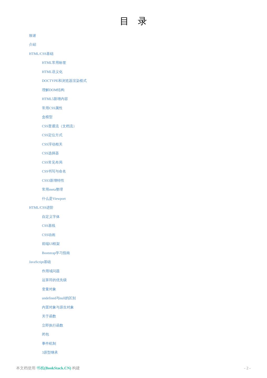 2 . 目 录 致谢 介紹 HTML/CSS基础 HTML常用标签 HTML语义化 DOCTYPE和浏览器渲染模式 理解DOM结构 HTML5新增内容 常用CSS属性 盒模型 CSS普通流(文档流) CSS定位方式 CSS浮动相关 CSS选择器 CSS常见布局 CSS书写与命名 CSS3新增特性 常用meta整理 什么是Viewport HTML/CSS进阶 自定义字体 CSS基线 CSS动画 前端UI框架 Bootstrap学习指南 JavaScript基础 作用域问题 运算符的优先级 变量对象 undefined与null的区别 内置对象与原生对象 关于函数 立即执行函数 闭包 事件机制 3原型继承 本文档使用 书栈(BookStack.CN) 构建 - 2 -