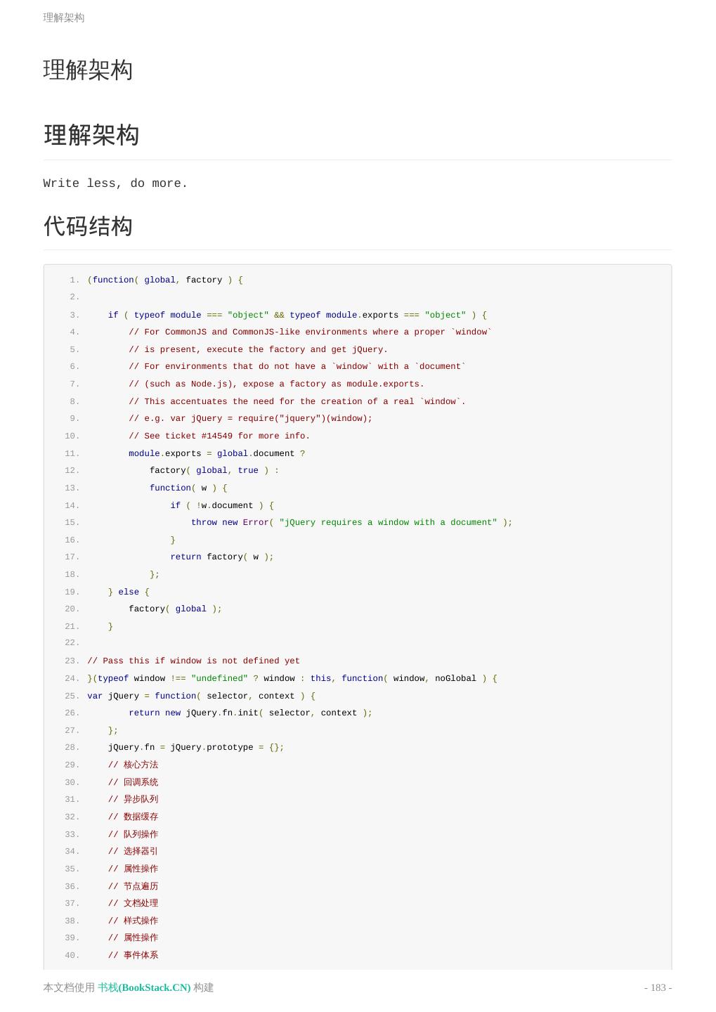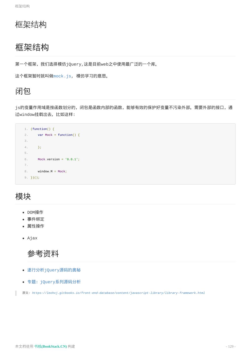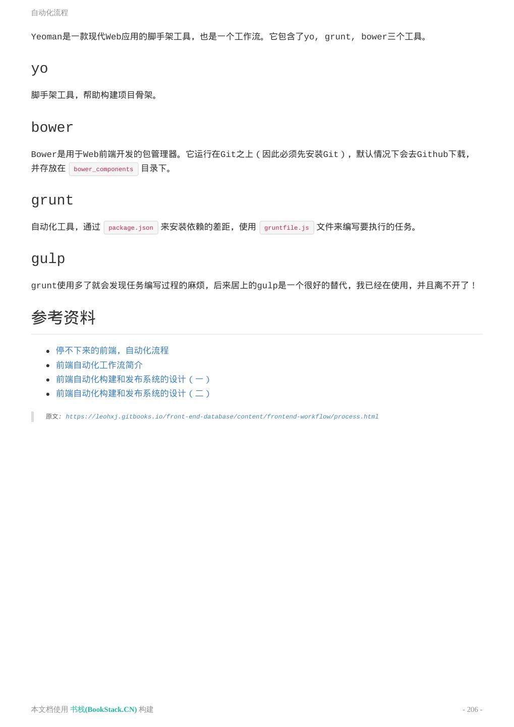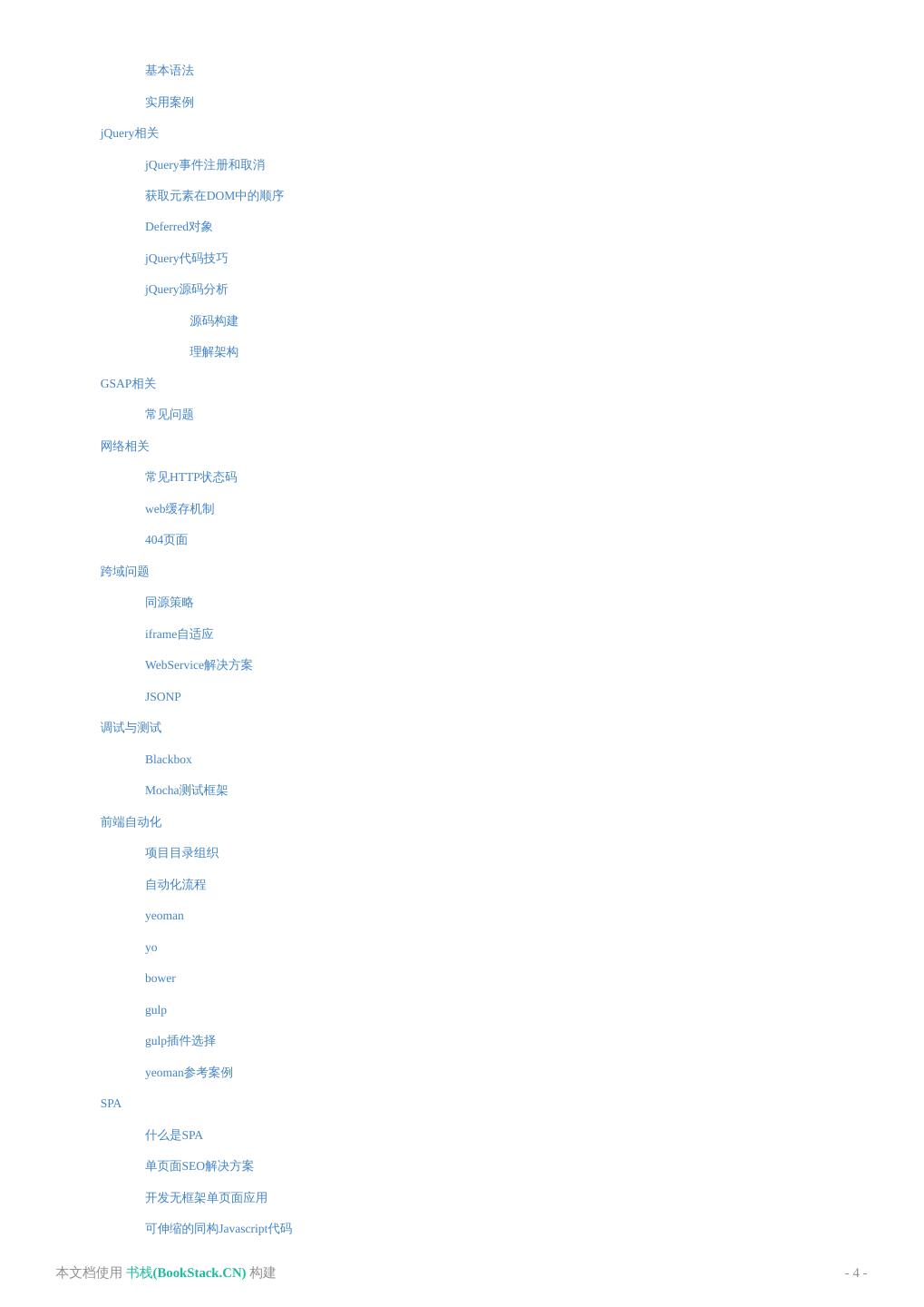 4 . 基本语法 实用案例 jQuery相关 jQuery事件注册和取消 获取元素在DOM中的顺序 Deferred对象 jQuery代码技巧 jQuery源码分析 源码构建 理解架构 GSAP相关 常见问题 网络相关 常见HTTP状态码 web缓存机制 404页面 跨域问题 同源策略 iframe自适应 WebService解决方案 JSONP 调试与测试 Blackbox Mocha测试框架 前端自动化 项目目录组织 自动化流程 yeoman yo bower gulp gulp插件选择 yeoman参考案例 SPA 什么是SPA 单页面SEO解决方案 开发无框架单页面应用 可伸缩的同构Javascript代码 本文档使用 书栈(BookStack.CN) 构建 - 4 -