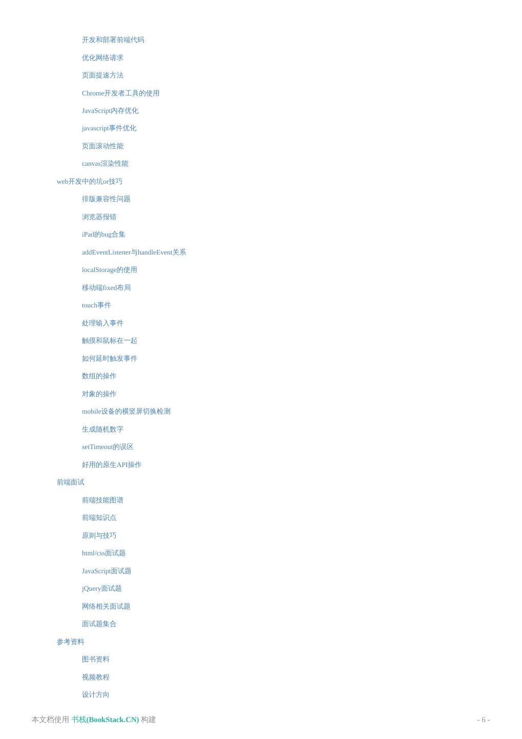6 . 开发和部署前端代码 优化网络请求 页面提速方法 Chrome开发者工具的使用 JavaScript内存优化 javascript事件优化 页面滚动性能 canvas渲染性能 web开发中的坑or技巧 排版兼容性问题 浏览器报错 iPad的bug合集 addEventListener与handleEvent关系 localStorage的使用 移动端fixed布局 touch事件 处理输入事件 触摸和鼠标在一起 如何延时触发事件 数组的操作 对象的操作 mobile设备的横竖屏切换检测 生成随机数字 setTimeout的误区 好用的原生API操作 前端面试 前端技能图谱 前端知识点 原则与技巧 html/css面试题 JavaScript面试题 jQuery面试题 网络相关面试题 面试题集合 参考资料 图书资料 视频教程 设计方向 本文档使用 书栈(BookStack.CN) 构建 - 6 -