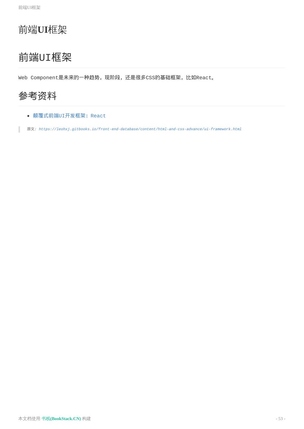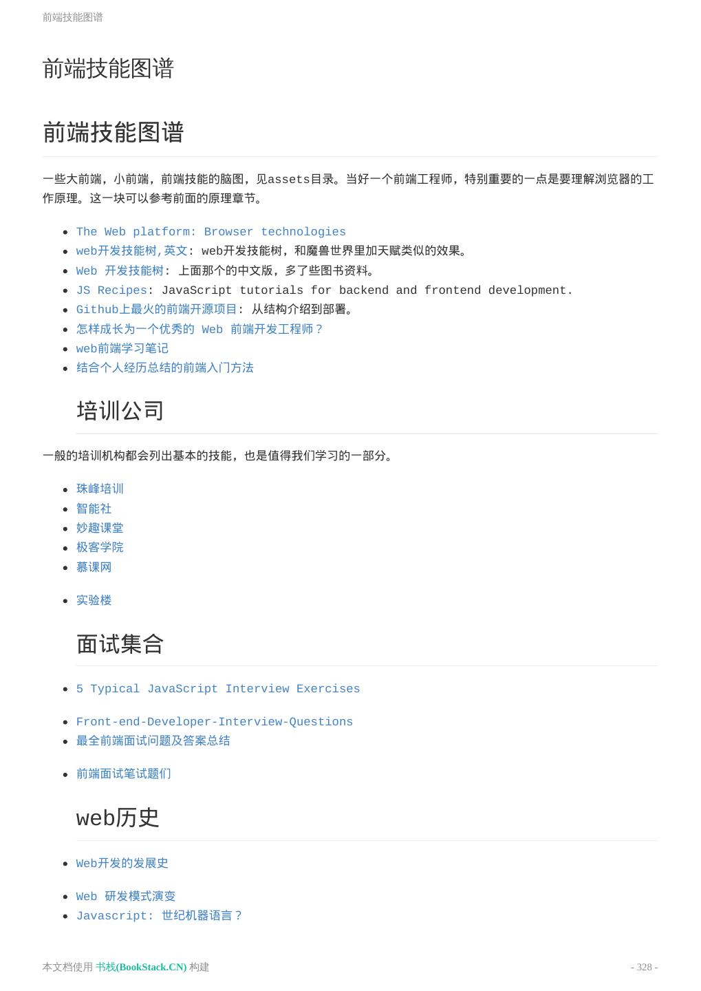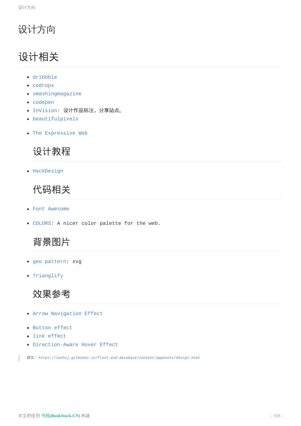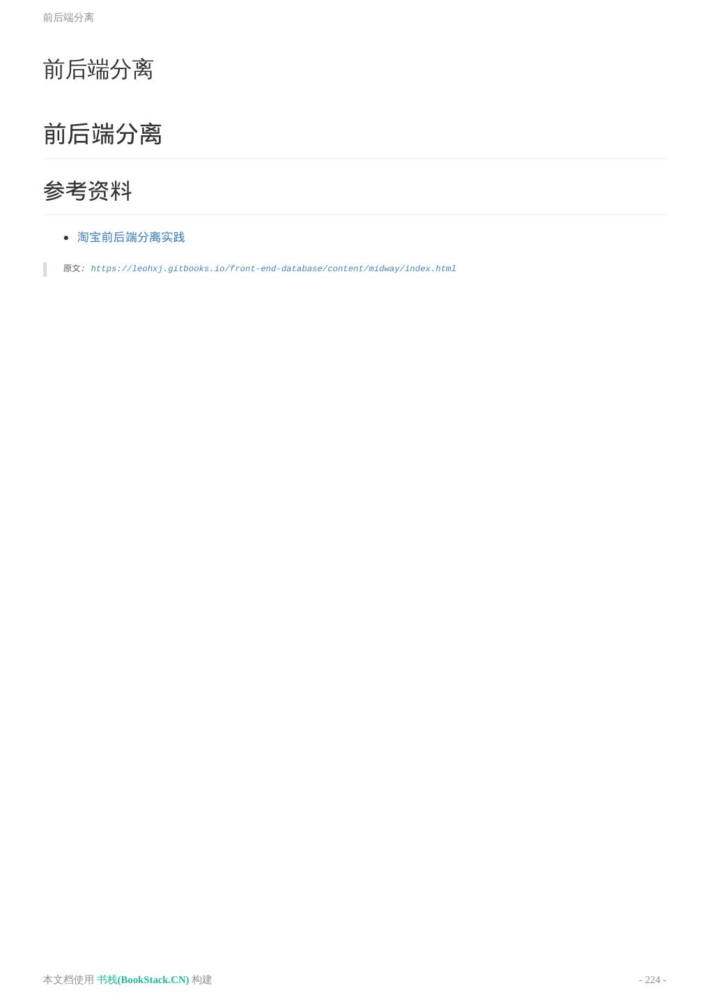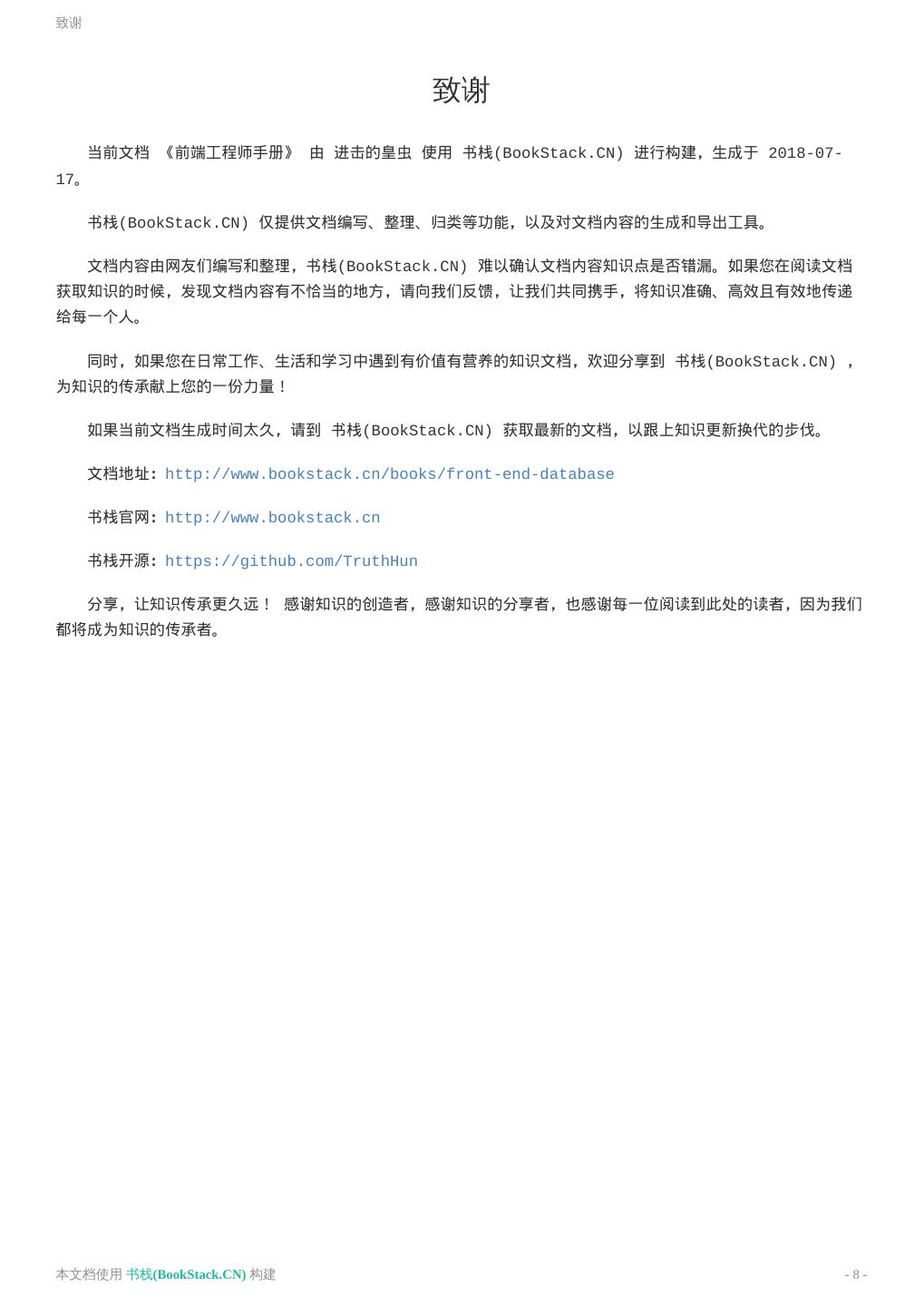 8 .致谢 致谢 当前文档 《前端工程师手册》 由 进击的皇虫 使用 书栈(BookStack.CN) 进行构建,生成于 2018-07- 17。 书栈(BookStack.CN) 仅提供文档编写、整理、归类等功能,以及对文档内容的生成和导出工具。 文档内容由网友们编写和整理,书栈(BookStack.CN) 难以确认文档内容知识点是否错漏。如果您在阅读文档 获取知识的时候,发现文档内容有不恰当的地方,请向我们反馈,让我们共同携手,将知识准确、高效且有效地传递 给每一个人。 同时,如果您在日常工作、生活和学习中遇到有价值有营养的知识文档,欢迎分享到 书栈(BookStack.CN) , 为知识的传承献上您的一份力量! 如果当前文档生成时间太久,请到 书栈(BookStack.CN) 获取最新的文档,以跟上知识更新换代的步伐。 文档地址:http://www.bookstack.cn/books/front-end-database 书栈官网:http://www.bookstack.cn 书栈开源:https://github.com/TruthHun 分享,让知识传承更久远! 感谢知识的创造者,感谢知识的分享者,也感谢每一位阅读到此处的读者,因为我们 都将成为知识的传承者。 本文档使用 书栈(BookStack.CN) 构建 - 8 -