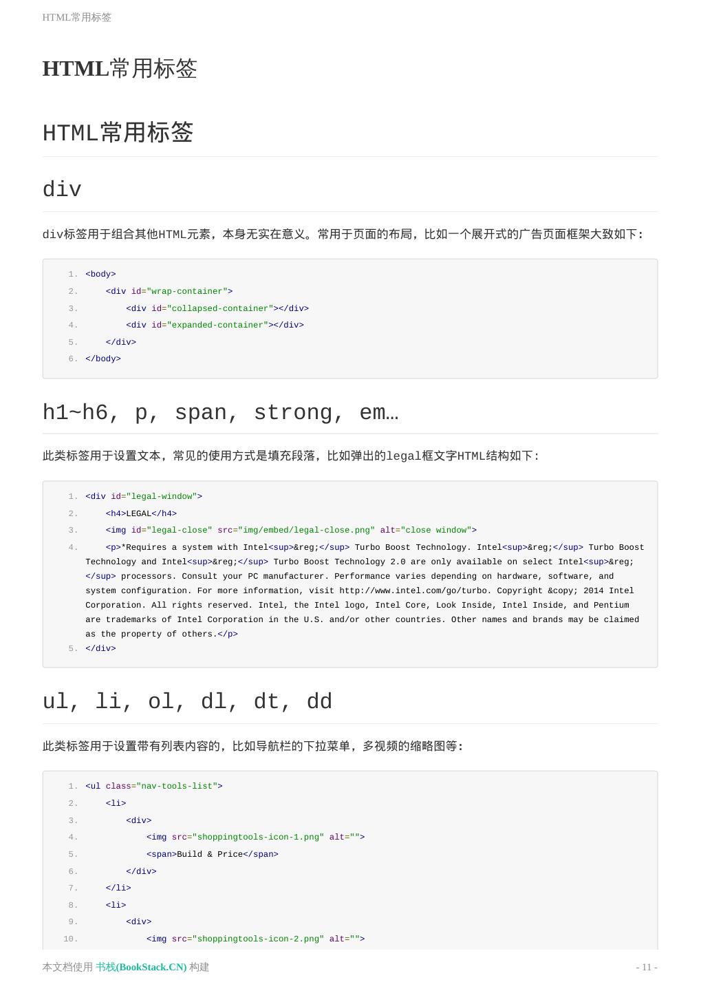 11 .HTML常用标签 HTML常用标签 HTML常用标签 div div标签用于组合其他HTML元素,本身无实在意义。常用于页面的布局,比如一个展开式的广告页面框架大致如下: 1. <body> 2. <div id="wrap-container"> 3. <div id="collapsed-container"></div> 4. <div id="expanded-container"></div> 5. </div> 6. </body> h1~h6, p, span, strong, em… 此类标签用于设置文本,常见的使用方式是填充段落,比如弹出的legal框文字HTML结构如下: 1. <div id="legal-window"> 2. <h4>LEGAL</h4> 3. <img id="legal-close" src="img/embed/legal-close.png" alt="close window"> 4. <p>*Requires a system with Intel<sup>®</sup> Turbo Boost Technology. Intel<sup>®</sup> Turbo Boost Technology and Intel<sup>®</sup> Turbo Boost Technology 2.0 are only available on select Intel<sup>® </sup> processors. Consult your PC manufacturer. Performance varies depending on hardware, software, and system configuration. For more information, visit http://www.intel.com/go/turbo. Copyright © 2014 Intel Corporation. All rights reserved. Intel, the Intel logo, Intel Core, Look Inside, Intel Inside, and Pentium are trademarks of Intel Corporation in the U.S. and/or other countries. Other names and brands may be claimed as the property of others.</p> 5. </div> ul, li, ol, dl, dt, dd 此类标签用于设置带有列表内容的,比如导航栏的下拉菜单,多视频的缩略图等: 1. <ul class="nav-tools-list"> 2. <li> 3. <div> 4. <img src="shoppingtools-icon-1.png" alt=""> 5. <span>Build & Price</span> 6. </div> 7. </li> 8. <li> 9. <div> 10. <img src="shoppingtools-icon-2.png" alt=""> 本文档使用 书栈(BookStack.CN) 构建 - 11 -