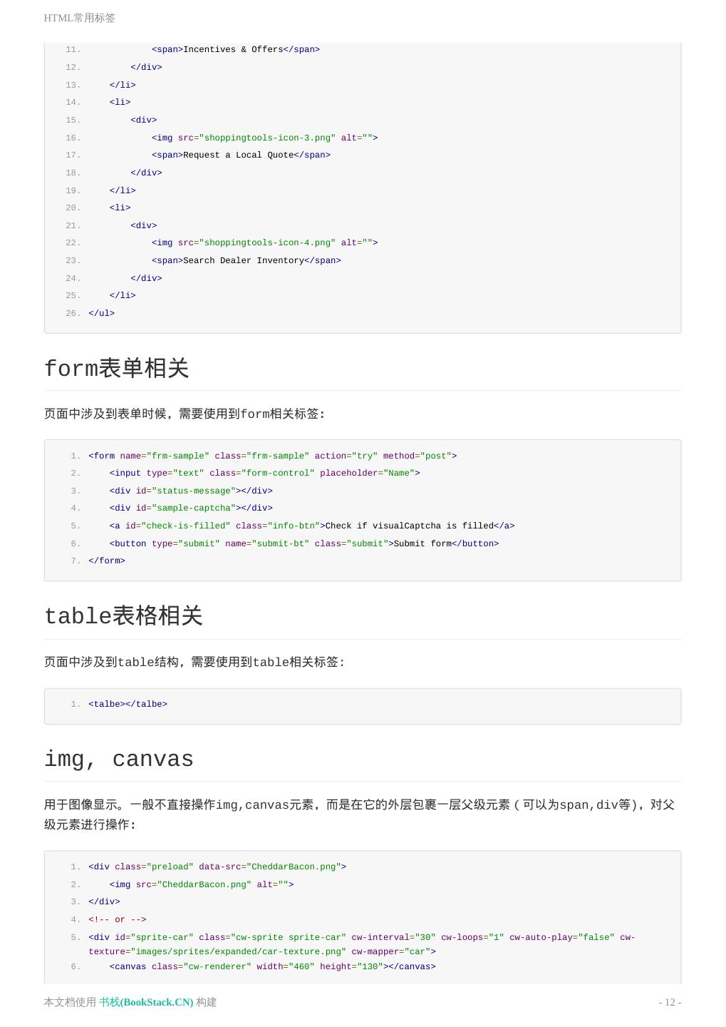 12 .HTML常用标签 11. <span>Incentives & Offers</span> 12. </div> 13. </li> 14. <li> 15. <div> 16. <img src="shoppingtools-icon-3.png" alt=""> 17. <span>Request a Local Quote</span> 18. </div> 19. </li> 20. <li> 21. <div> 22. <img src="shoppingtools-icon-4.png" alt=""> 23. <span>Search Dealer Inventory</span> 24. </div> 25. </li> 26. </ul> form表单相关 页面中涉及到表单时候,需要使用到form相关标签: 1. <form name="frm-sample" class="frm-sample" action="try" method="post"> 2. <input type="text" class="form-control" placeholder="Name"> 3. <div id="status-message"></div> 4. <div id="sample-captcha"></div> 5. <a id="check-is-filled" class="info-btn">Check if visualCaptcha is filled</a> 6. <button type="submit" name="submit-bt" class="submit">Submit form</button> 7. </form> table表格相关 页面中涉及到table结构,需要使用到table相关标签: 1. <talbe></talbe> img, canvas 用于图像显示。一般不直接操作img,canvas元素,而是在它的外层包裹一层父级元素(可以为span,div等),对父 级元素进行操作: 1. <div class="preload" data-src="CheddarBacon.png"> 2. <img src="CheddarBacon.png" alt=""> 3. </div> 4. <!-- or --> 5. <div id="sprite-car" class="cw-sprite sprite-car" cw-interval="30" cw-loops="1" cw-auto-play="false" cw- texture="images/sprites/expanded/car-texture.png" cw-mapper="car"> 6. <canvas class="cw-renderer" width="460" height="130"></canvas> 本文档使用 书栈(BookStack.CN) 构建 - 12 -