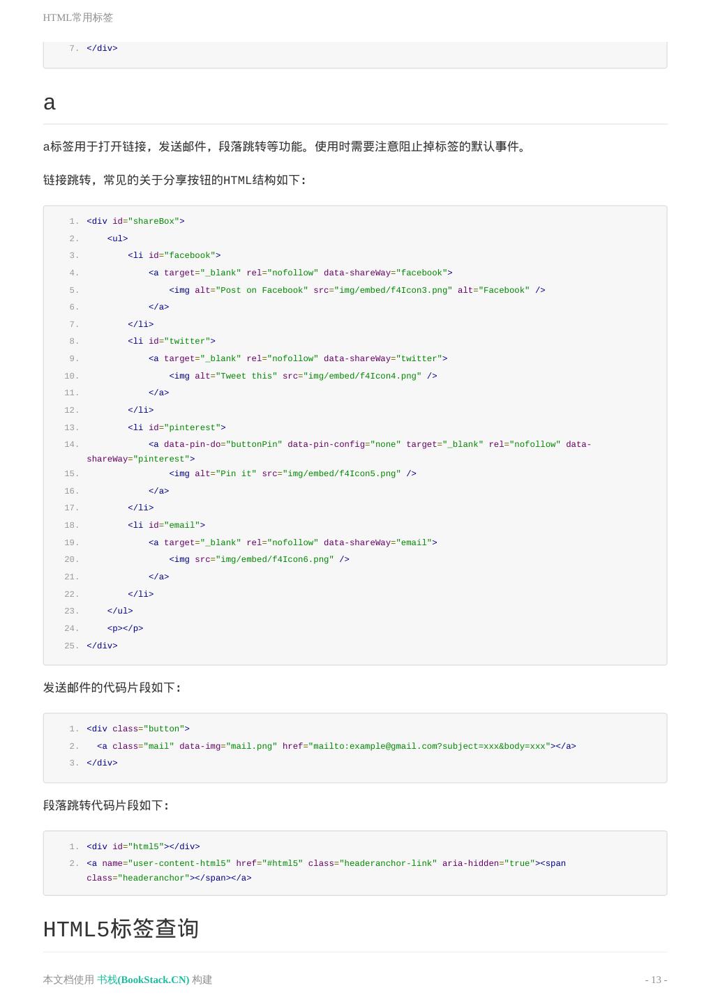 13 .HTML常用标签 7. </div> a a标签用于打开链接,发送邮件,段落跳转等功能。使用时需要注意阻止掉标签的默认事件。 链接跳转,常见的关于分享按钮的HTML结构如下: 1. <div id="shareBox"> 2. <ul> 3. <li id="facebook"> 4. <a target="_blank" rel="nofollow" data-shareWay="facebook"> 5. <img alt="Post on Facebook" src="img/embed/f4Icon3.png" alt="Facebook" /> 6. </a> 7. </li> 8. <li id="twitter"> 9. <a target="_blank" rel="nofollow" data-shareWay="twitter"> 10. <img alt="Tweet this" src="img/embed/f4Icon4.png" /> 11. </a> 12. </li> 13. <li id="pinterest"> 14. <a data-pin-do="buttonPin" data-pin-config="none" target="_blank" rel="nofollow" data- shareWay="pinterest"> 15. <img alt="Pin it" src="img/embed/f4Icon5.png" /> 16. </a> 17. </li> 18. <li id="email"> 19. <a target="_blank" rel="nofollow" data-shareWay="email"> 20. <img src="img/embed/f4Icon6.png" /> 21. </a> 22. </li> 23. </ul> 24. <p></p> 25. </div> 发送邮件的代码片段如下: 1. <div class="button"> 2. <a class="mail" data-img="mail.png" href="mailto:example@gmail.com?subject=xxx&body=xxx"></a> 3. </div> 段落跳转代码片段如下: 1. <div id="html5"></div> 2. <a name="user-content-html5" href="#html5" class="headeranchor-link" aria-hidden="true"><span class="headeranchor"></span></a> HTML5标签查询 本文档使用 书栈(BookStack.CN) 构建 - 13 -
