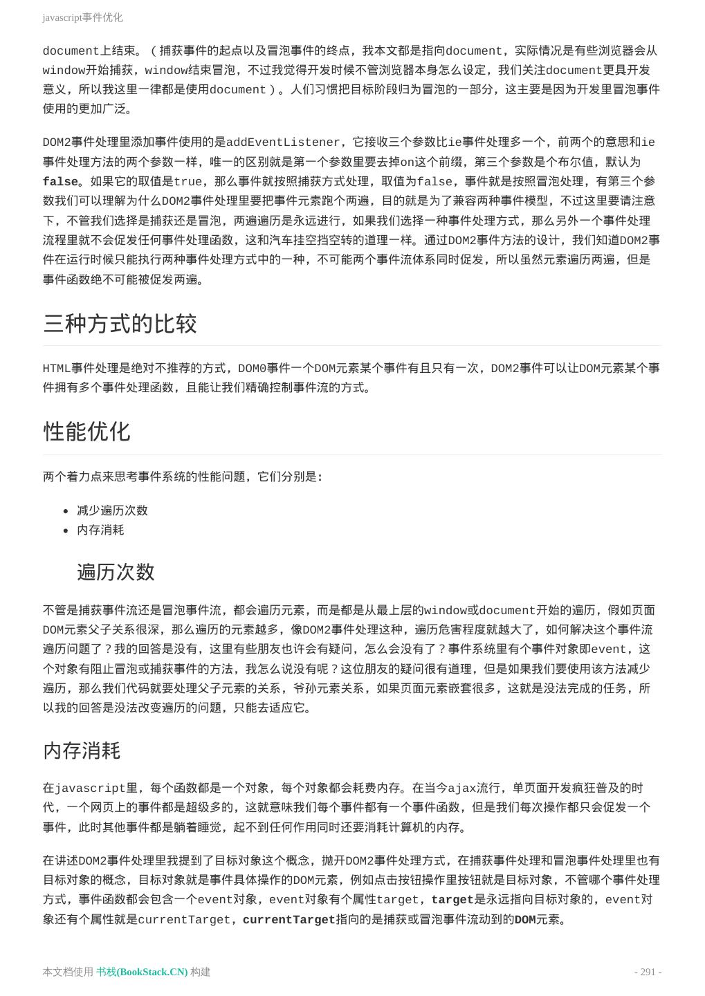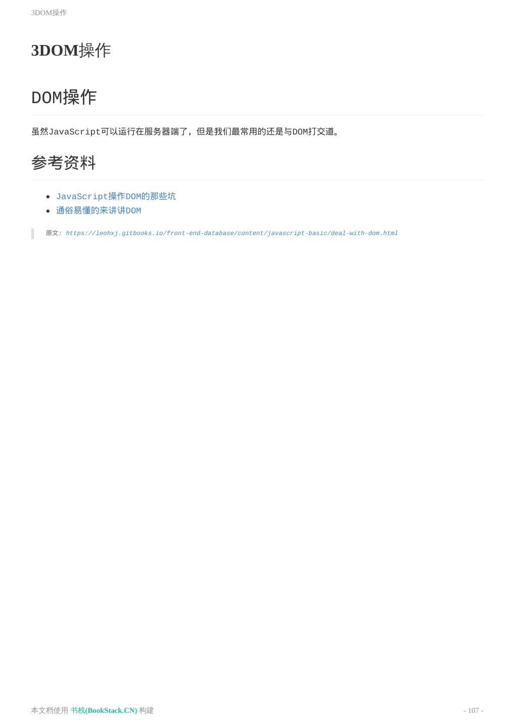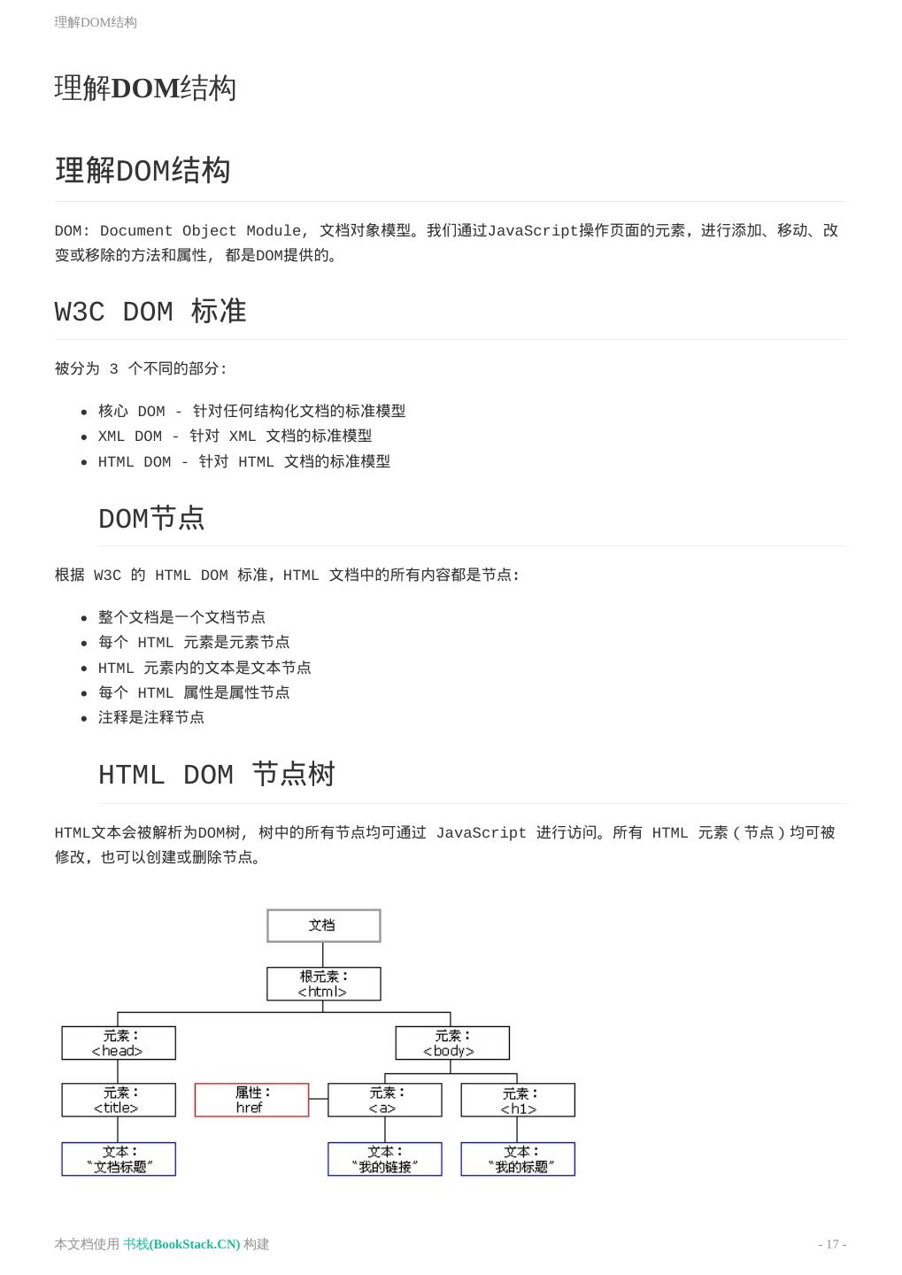 17 .理解DOM结构 理解DOM结构 理解DOM结构 DOM: Document Object Module, 文档对象模型。我们通过JavaScript操作页面的元素,进行添加、移动、改 变或移除的方法和属性, 都是DOM提供的。 W3C DOM 标准 被分为 3 个不同的部分: 核心 DOM - 针对任何结构化文档的标准模型 XML DOM - 针对 XML 文档的标准模型 HTML DOM - 针对 HTML 文档的标准模型 DOM节点 根据 W3C 的 HTML DOM 标准,HTML 文档中的所有内容都是节点: 整个文档是一个文档节点 每个 HTML 元素是元素节点 HTML 元素内的文本是文本节点 每个 HTML 属性是属性节点 注释是注释节点 HTML DOM 节点树 HTML文本会被解析为DOM树, 树中的所有节点均可通过 JavaScript 进行访问。所有 HTML 元素(节点)均可被 修改,也可以创建或删除节点。 本文档使用 书栈(BookStack.CN) 构建 - 17 -