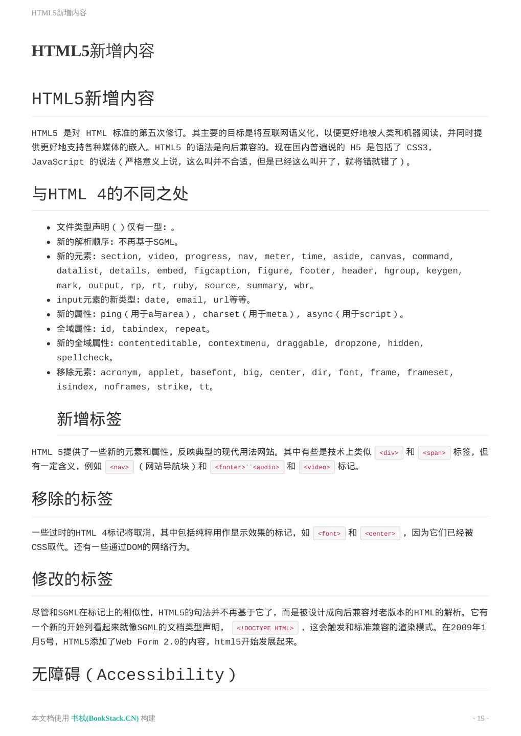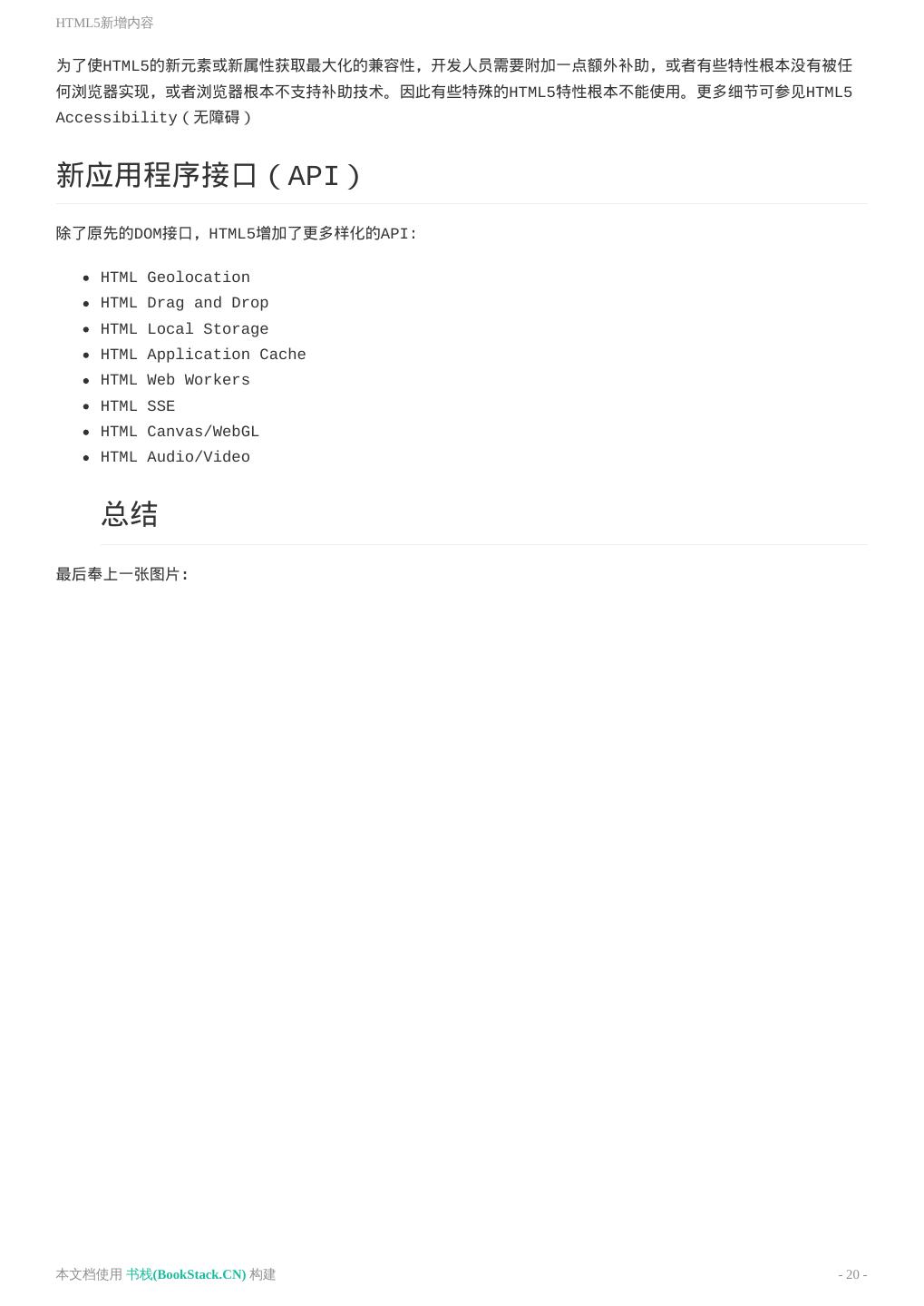 20 .HTML5新增内容 为了使HTML5的新元素或新属性获取最大化的兼容性,开发人员需要附加一点额外补助,或者有些特性根本没有被任 何浏览器实现,或者浏览器根本不支持补助技术。因此有些特殊的HTML5特性根本不能使用。更多细节可参见HTML5 Accessibility(无障碍) 新应用程序接口(API) 除了原先的DOM接口,HTML5增加了更多样化的API: HTML Geolocation HTML Drag and Drop HTML Local Storage HTML Application Cache HTML Web Workers HTML SSE HTML Canvas/WebGL HTML Audio/Video 总结 最后奉上一张图片: 本文档使用 书栈(BookStack.CN) 构建 - 20 -