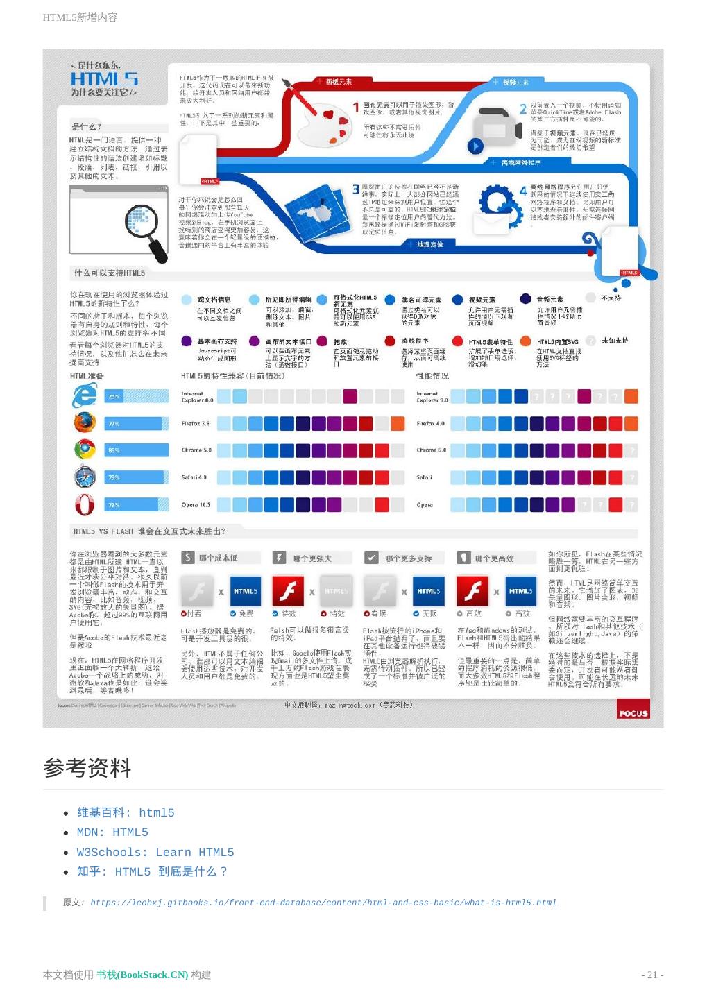 21 .HTML5新增内容 参考资料 维基百科: html5 MDN: HTML5 W3Schools: Learn HTML5 知乎: HTML5 到底是什么? 原文: https://leohxj.gitbooks.io/front-end-database/content/html-and-css-basic/what-is-html5.html 本文档使用 书栈(BookStack.CN) 构建 - 21 -