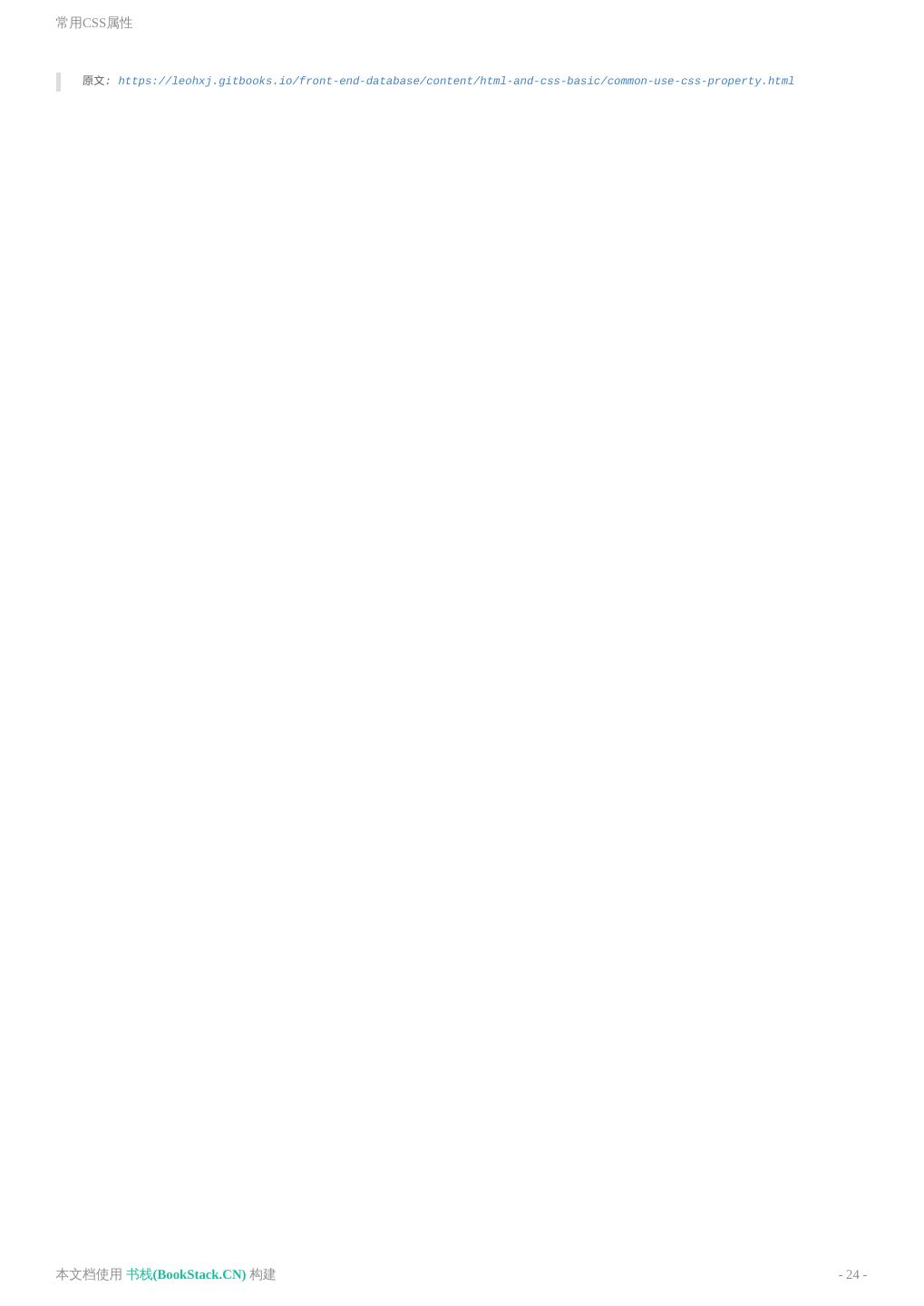 24 .常用CSS属性 原文: https://leohxj.gitbooks.io/front-end-database/content/html-and-css-basic/common-use-css-property.html 本文档使用 书栈(BookStack.CN) 构建 - 24 -