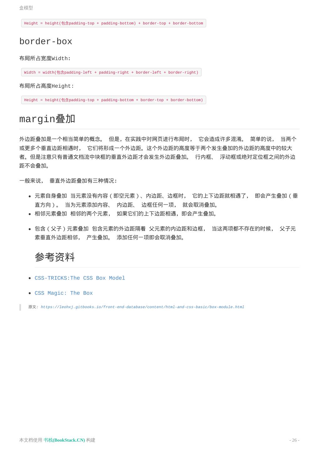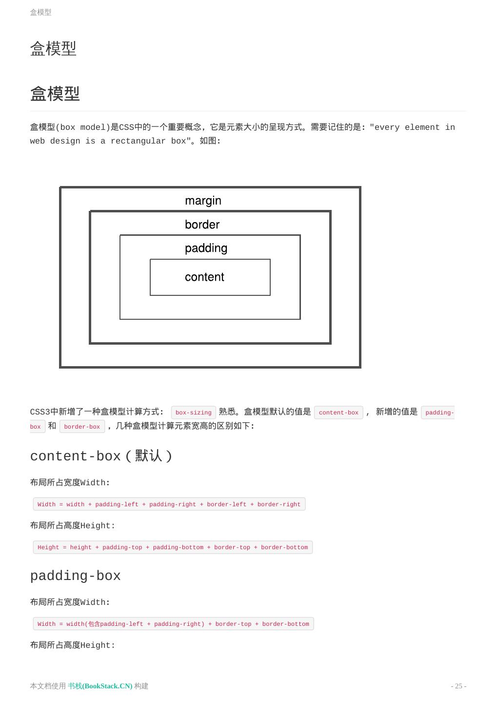 25 .盒模型 盒模型 盒模型 盒模型(box model)是CSS中的一个重要概念,它是元素大小的呈现方式。需要记住的是:"every element in web design is a rectangular box"。如图: CSS3中新增了一种盒模型计算方式: box-sizing 熟悉。盒模型默认的值是 content-box , 新增的值是 padding- box 和 border-box ,几种盒模型计算元素宽高的区别如下: content-box(默认) 布局所占宽度Width: Width = width + padding-left + padding-right + border-left + border-right 布局所占高度Height: Height = height + padding-top + padding-bottom + border-top + border-bottom padding-box 布局所占宽度Width: Width = width(包含padding-left + padding-right) + border-top + border-bottom 布局所占高度Height: 本文档使用 书栈(BookStack.CN) 构建 - 25 -