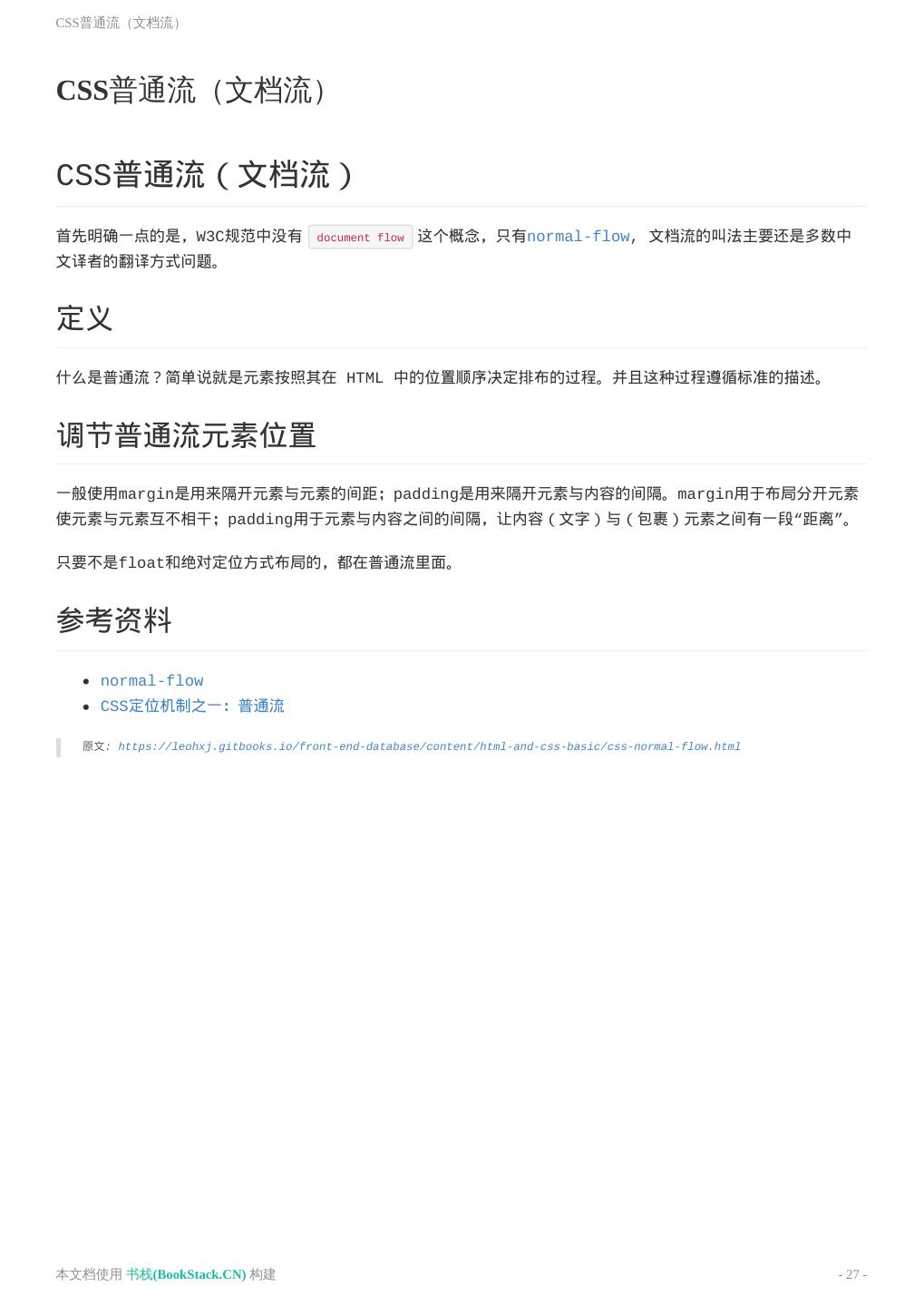 27 .CSS普通流(文档流) CSS普通流(文档流) CSS普通流(文档流) 首先明确一点的是,W3C规范中没有 document flow 这个概念,只有normal-flow, 文档流的叫法主要还是多数中 文译者的翻译方式问题。 定义 什么是普通流?简单说就是元素按照其在 HTML 中的位置顺序决定排布的过程。并且这种过程遵循标准的描述。 调节普通流元素位置 一般使用margin是用来隔开元素与元素的间距;padding是用来隔开元素与内容的间隔。margin用于布局分开元素 使元素与元素互不相干;padding用于元素与内容之间的间隔,让内容(文字)与(包裹)元素之间有一段“距离”。 只要不是float和绝对定位方式布局的,都在普通流里面。 参考资料 normal-flow CSS定位机制之一:普通流 原文: https://leohxj.gitbooks.io/front-end-database/content/html-and-css-basic/css-normal-flow.html 本文档使用 书栈(BookStack.CN) 构建 - 27 -