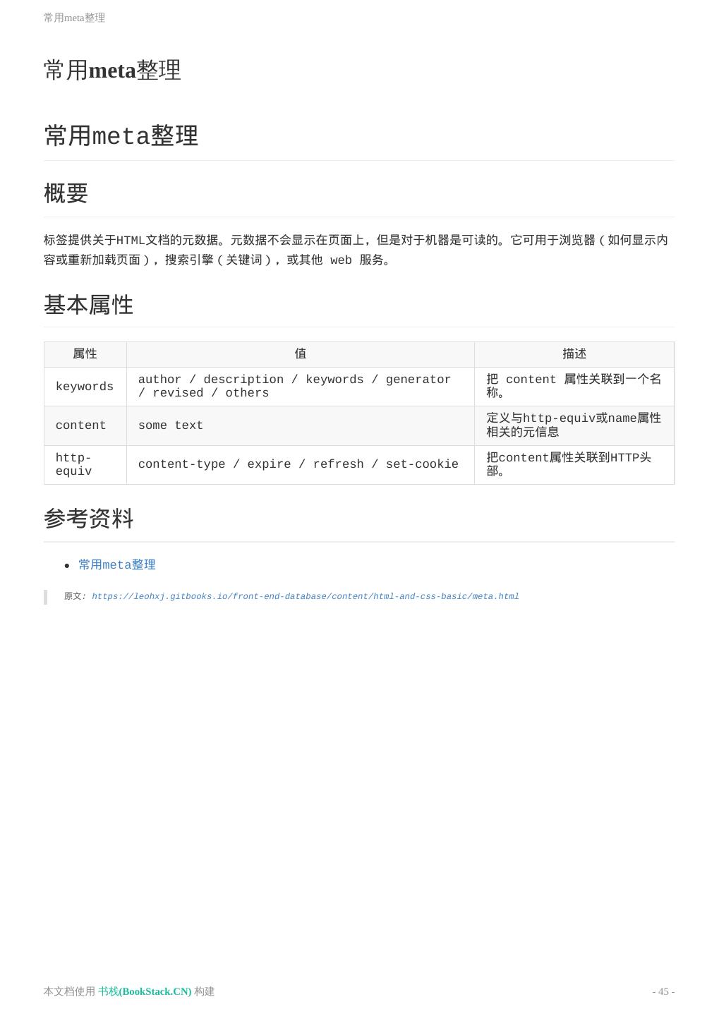 10 .HTML/CSS基础 HTML/CSS基础 HTML/CSS 基础知识 罗列一些基础内容。 资料 学习资料可以参考HTML Dog以及Learn HTML & CSS。 详细的文档内容,推荐参考WebPlatform和MDN。 关于属性的兼容性,可以通过Can I Use查询。 原文: https://leohxj.gitbooks.io/front-end-database/content/html-and-css-basic/index.html 本文档使用 书栈(BookStack.CN) 构建 - 10 -