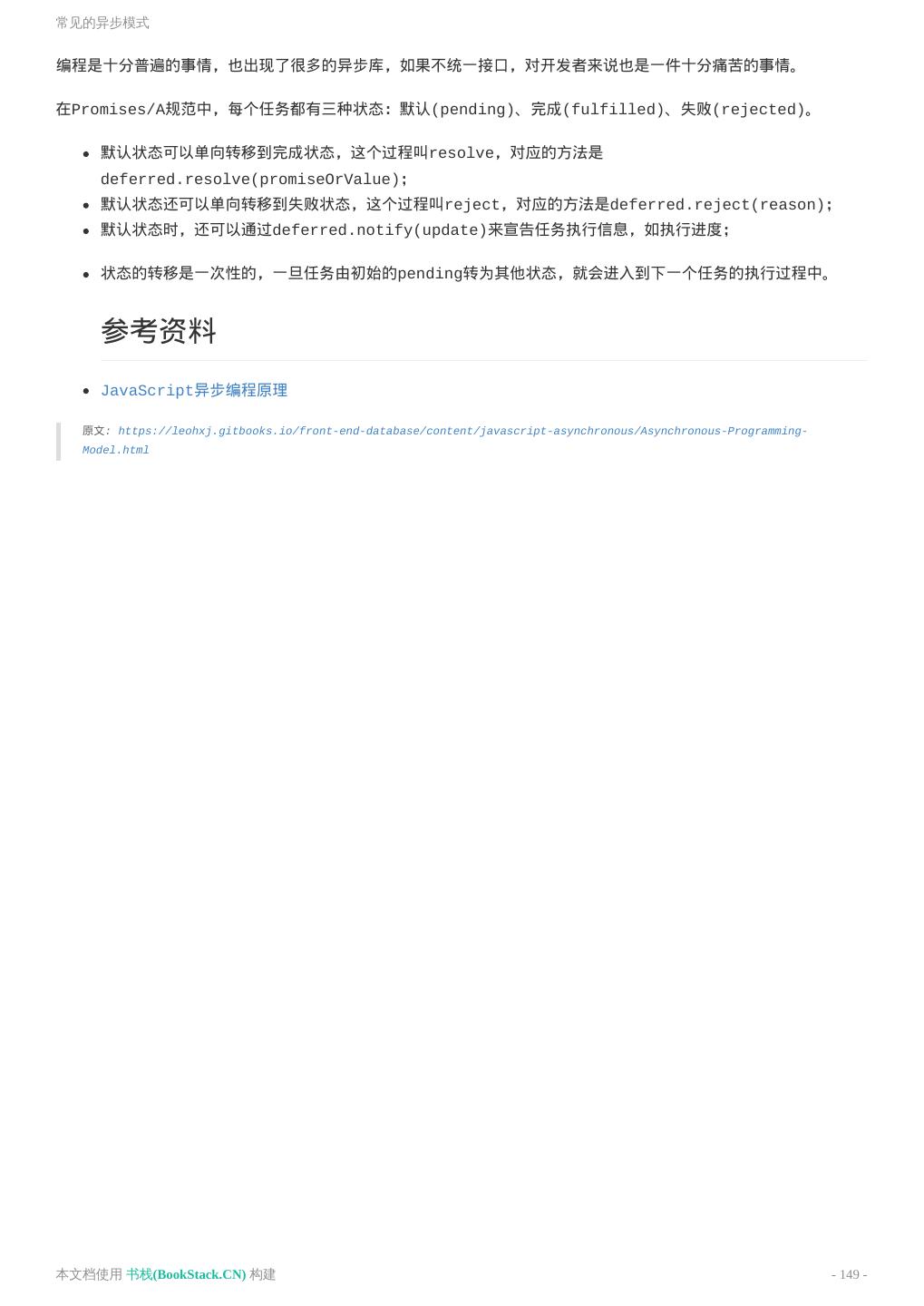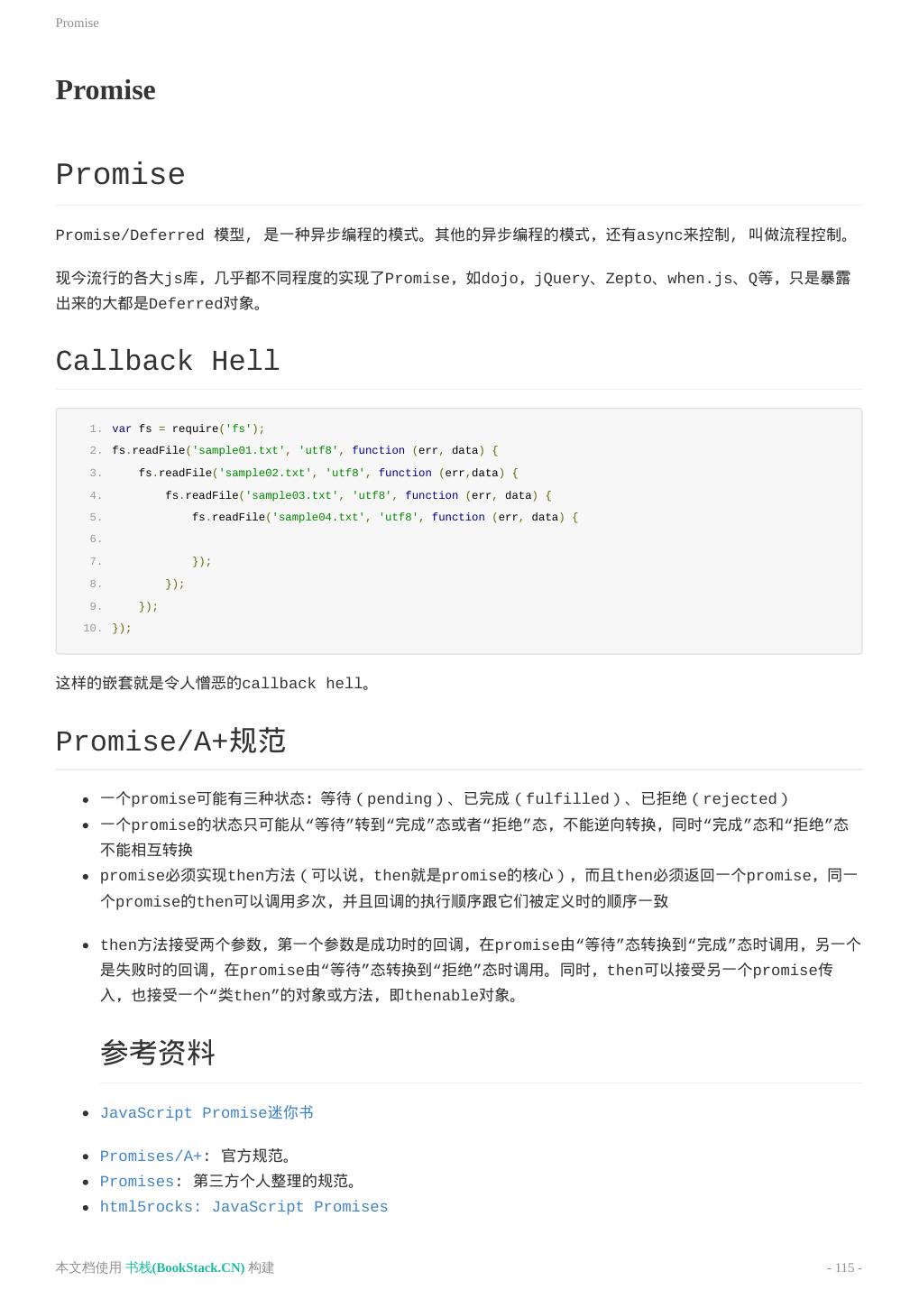 3 . 3详解this 3在JavaScript中一切都是对象吗? 3DOM操作 3JSON对象 JavaScript进阶 理解作用域链 Callback问题 Promise 模板引擎 Underscore ES6 Base64编码与解码 JavaScript面向对象 封装 继承 JavaScript设计模式 单例模式: Singleton 编写JavaScript框架 框架结构 JavaScript模块管理 模块化简介 模块依赖管理工具对比 AMD UMD requireJS 入门使用 压缩优化 JavaScript数据结构 数据类型 JavaScript异步编程 常见的异步模式 什么是Promise Promise规范 Promise实战 Async控制异步流程 EventProxy控制异步流程 JSDeferred控制异步流程 JavaScript正则表达式 本文档使用 书栈(BookStack.CN) 构建 - 3 -