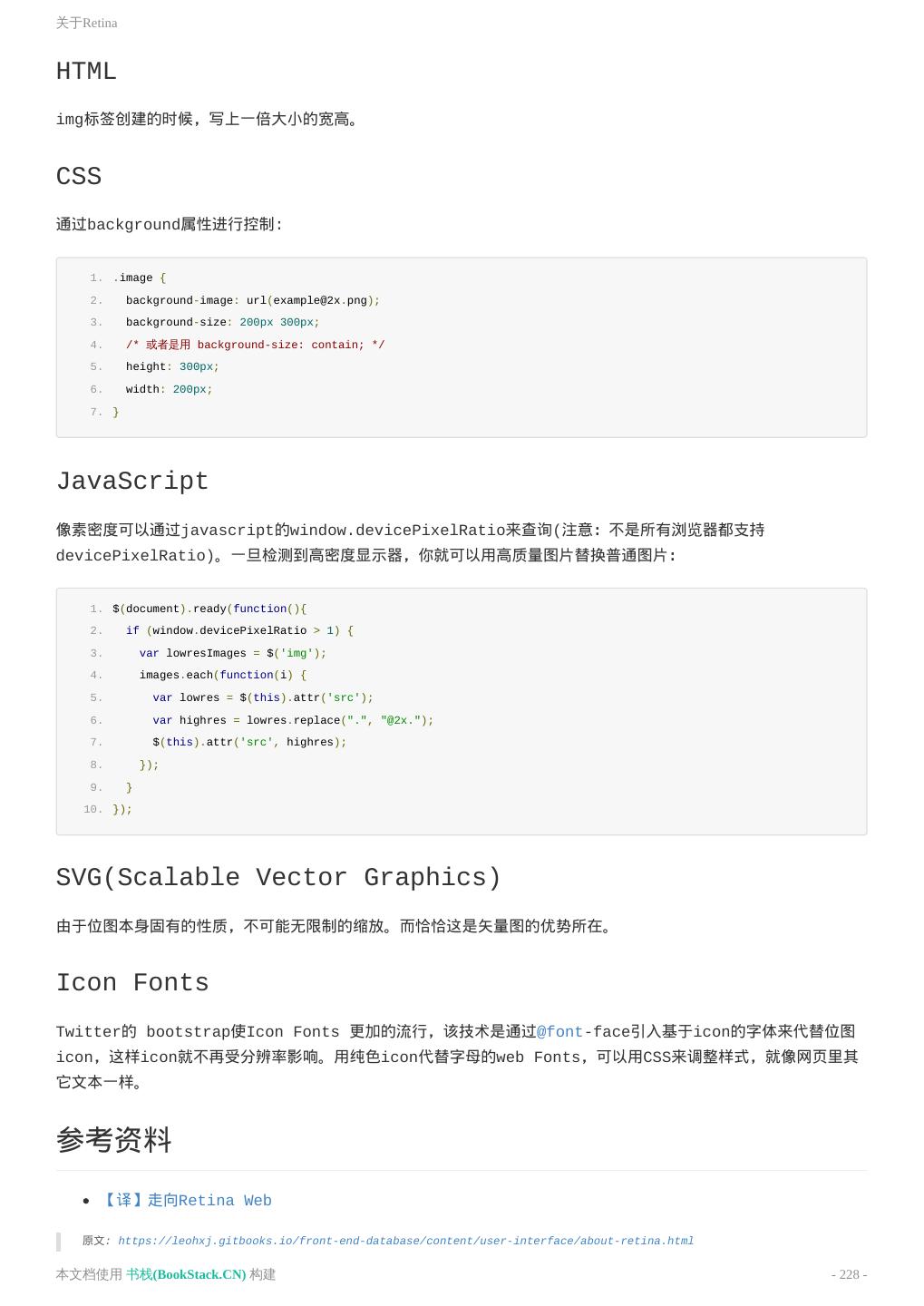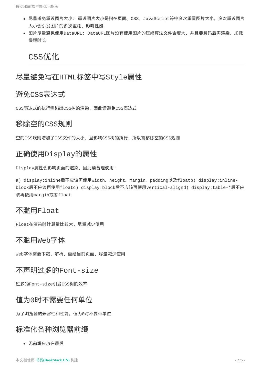 5 . PJAX 理解架构 前后端分离 一个简单粗暴的前后端分离方案 UI 关于Retina 响应式图片 响应式字体 中文字体 移动端字体 响应式设计原则 中文排版的规范 移动端尺寸 UX 页面滚动条出现时不跳动 使用渐进式JPEG来提升用户体验 动画相关 动画类型 跟动画有关的数学和物理公式 缓动原理与实现 常用动画效果与缓动 SVG动画 原理性质 JavaScript的加载与执行 单线程的Javascript 浏览器解析介绍 v8引擎 浏览器渲染 JS动画性能 Repaint和Reflow URL编码与解码 字体的渲染 2图片格式的优缺点 性能优化 编码规范 JavaScript代码最佳实践 移动H5前端性能优化指南 浏览器渲染性能优化 本文档使用 书栈(BookStack.CN) 构建 - 5 -