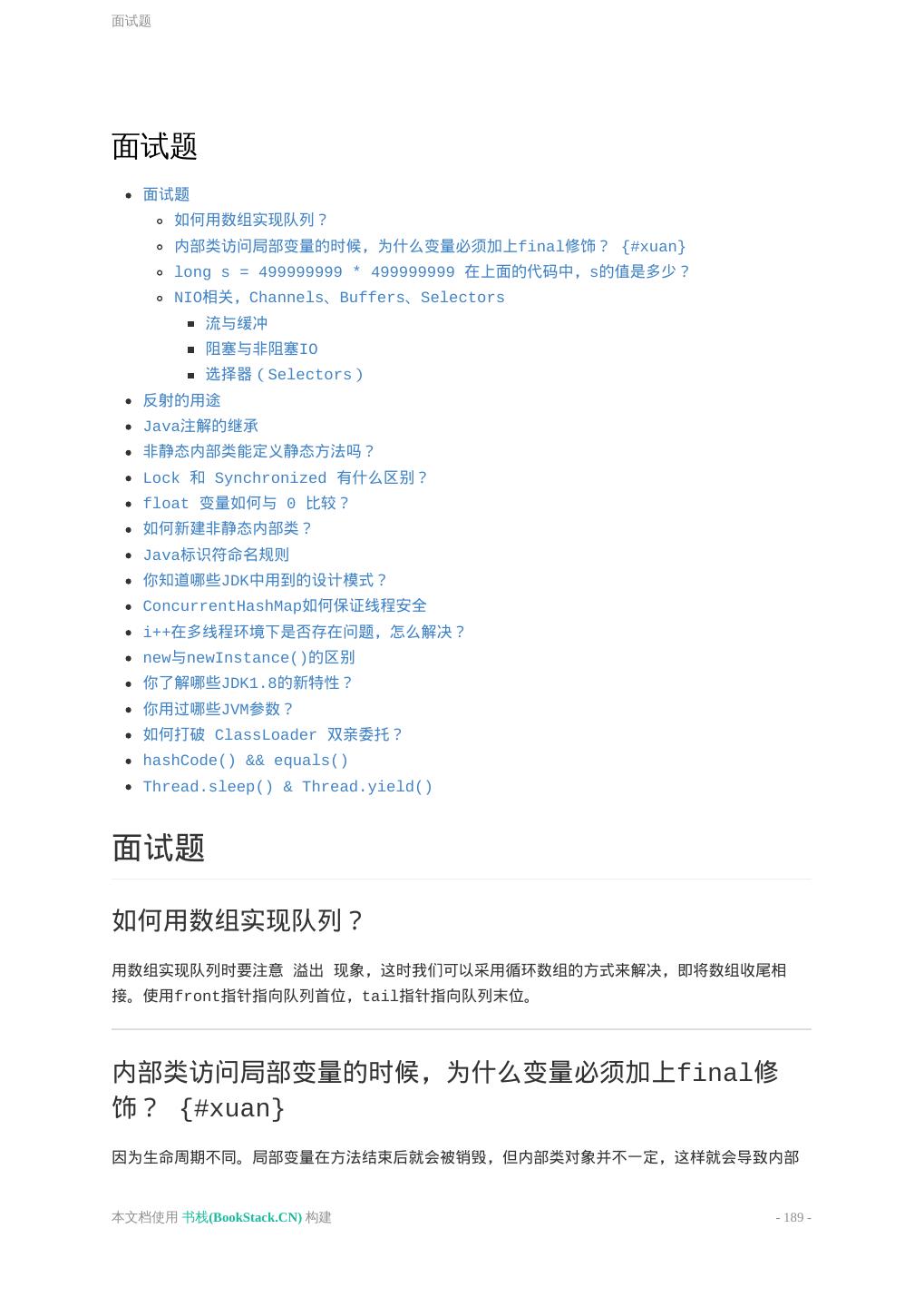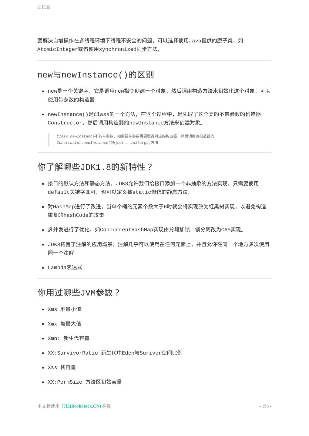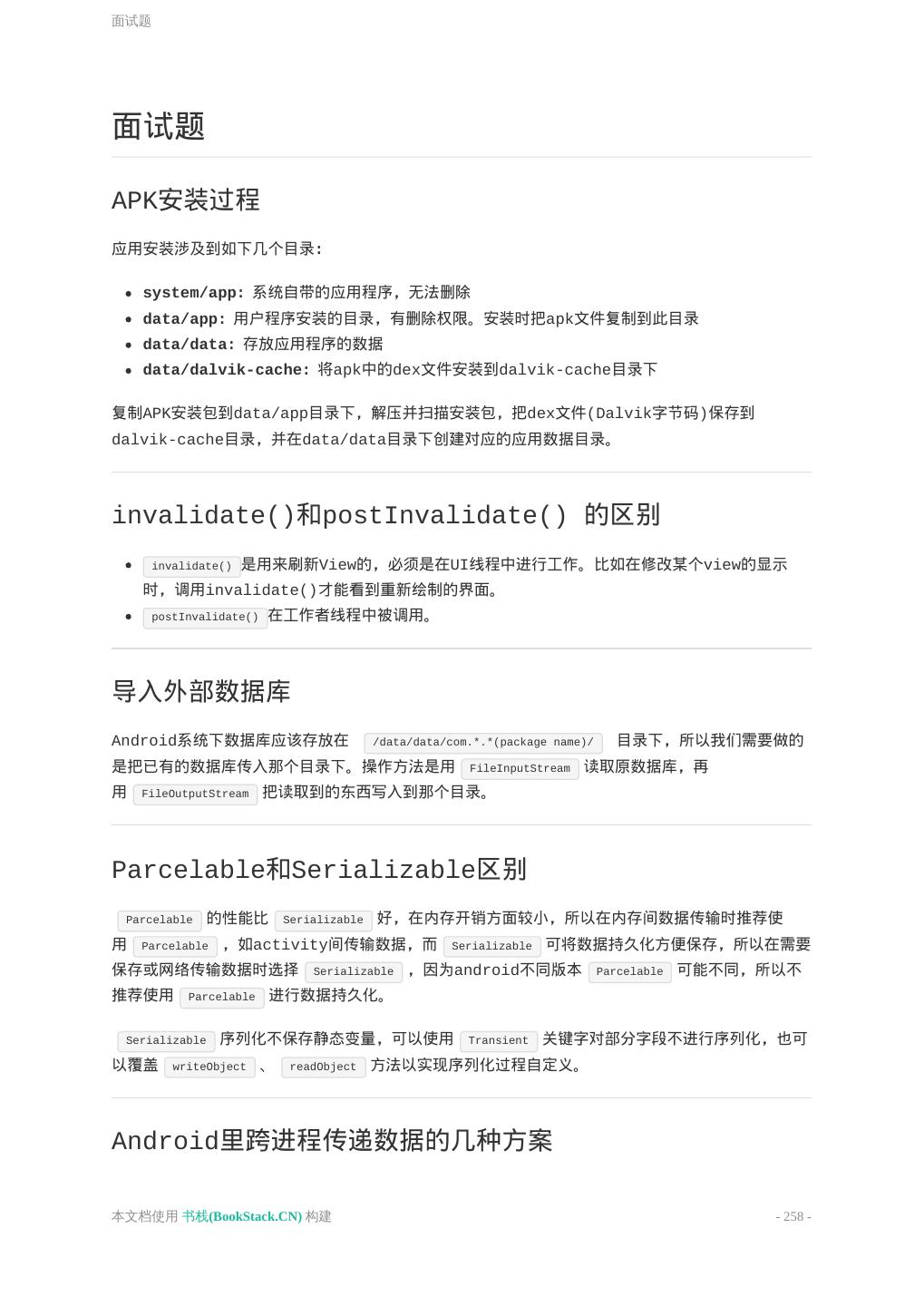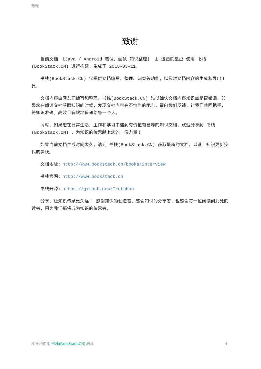 4 .致谢 致谢 当前文档 《Java / Android 笔试、面试 知识整理》 由 进击的皇虫 使用 书栈 (BookStack.CN) 进行构建,生成于 2018-03-11。 书栈(BookStack.CN) 仅提供文档编写、整理、归类等功能,以及对文档内容的生成和导出工 具。 文档内容由网友们编写和整理,书栈(BookStack.CN) 难以确认文档内容知识点是否错漏。如 果您在阅读文档获取知识的时候,发现文档内容有不恰当的地方,请向我们反馈,让我们共同携手, 将知识准确、高效且有效地传递给每一个人。 同时,如果您在日常生活、工作和学习中遇到有价值有营养的知识文档,欢迎分享到 书栈 (BookStack.CN) ,为知识的传承献上您的一份力量! 如果当前文档生成时间太久,请到 书栈(BookStack.CN) 获取最新的文档,以跟上知识更新换 代的步伐。 文档地址:http://www.bookstack.cn/books/interview 书栈官网:http://www.bookstack.cn 书栈开源:https://github.com/TruthHun 分享,让知识传承更久远! 感谢知识的创造者,感谢知识的分享者,也感谢每一位阅读到此处的 读者,因为我们都将成为知识的传承者。 本文档使用 书栈(BookStack.CN) 构建 - 4 -