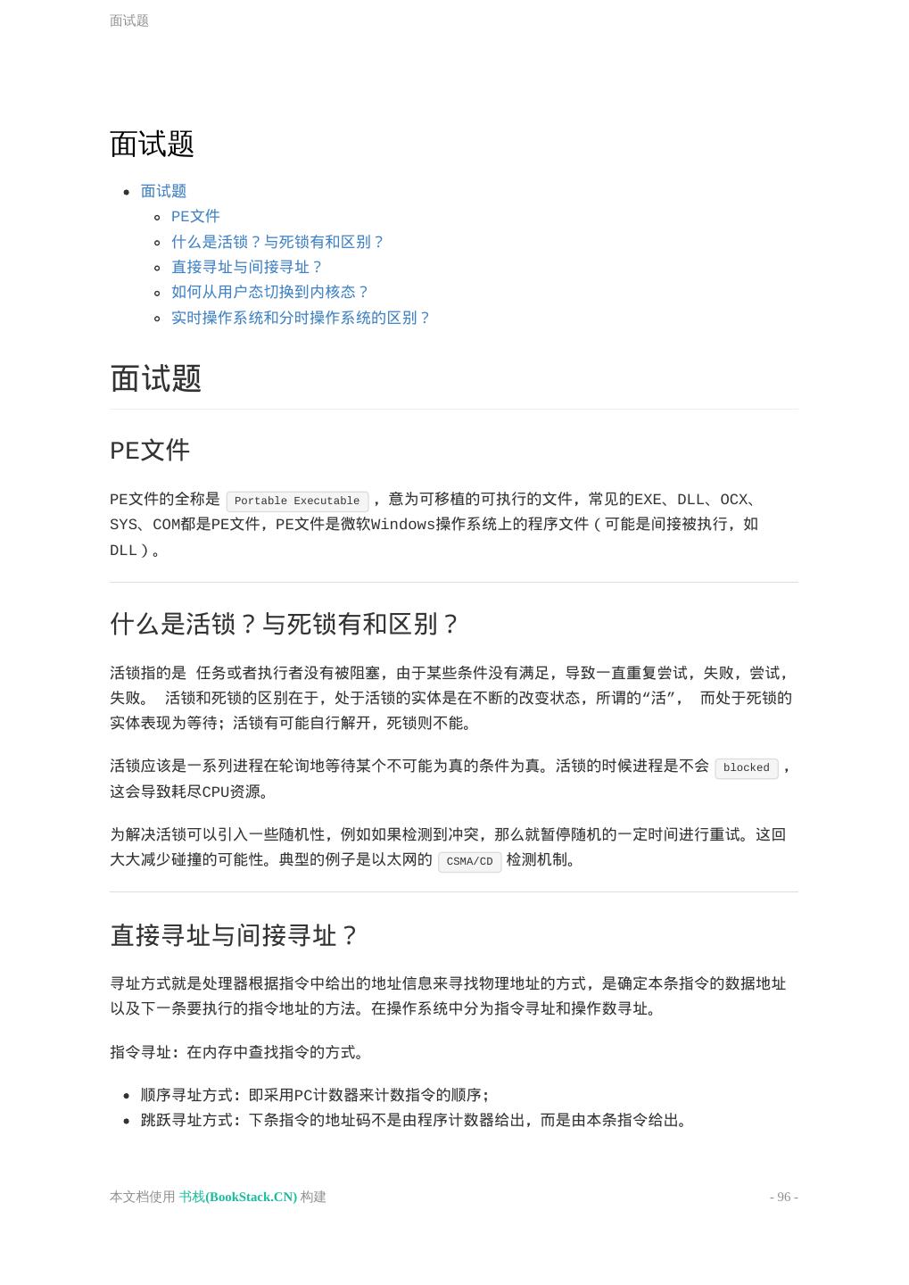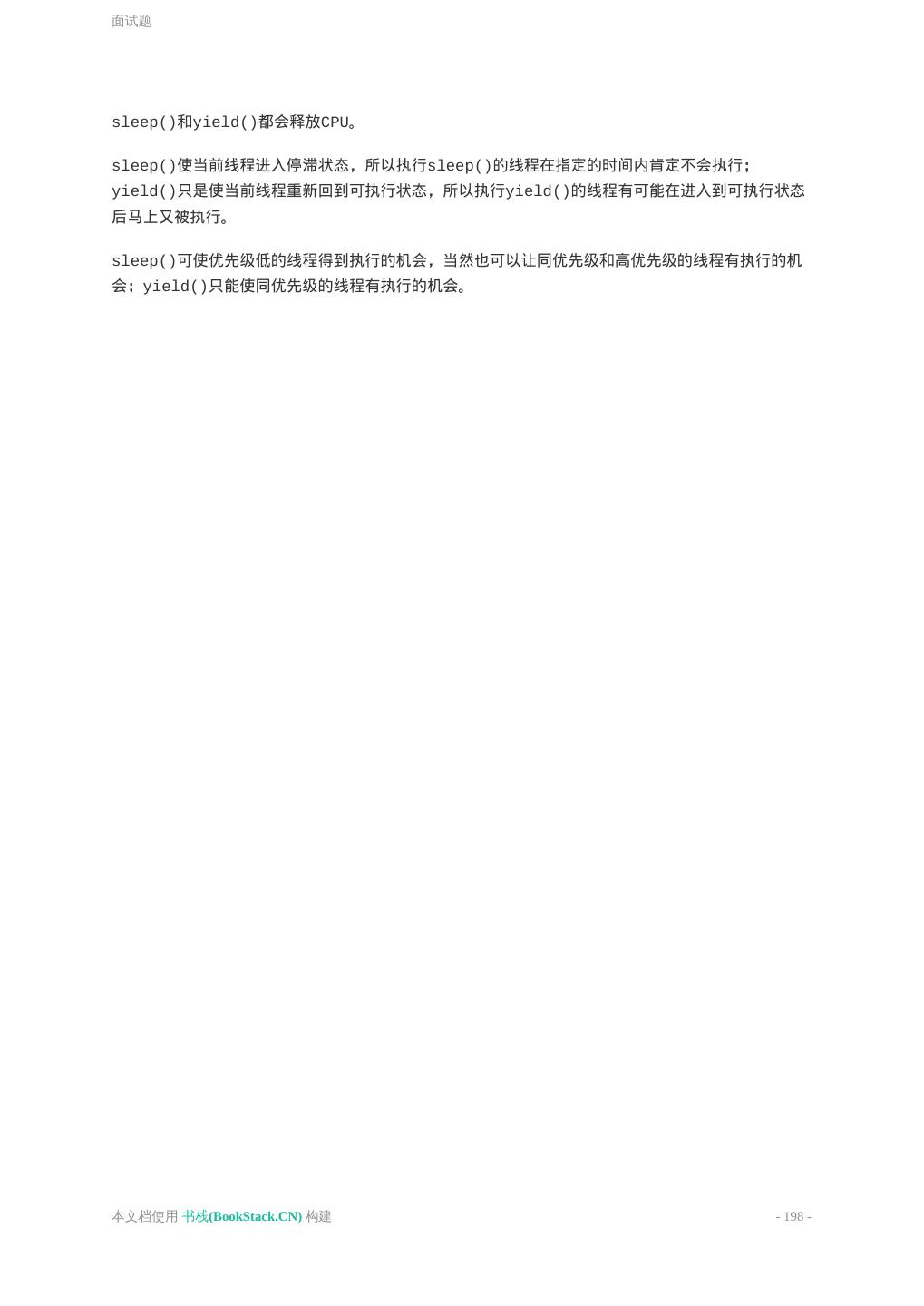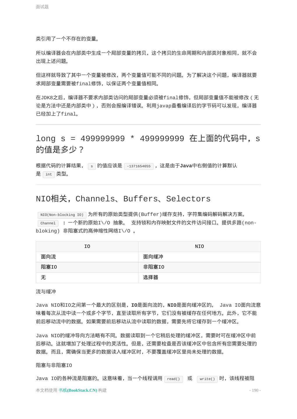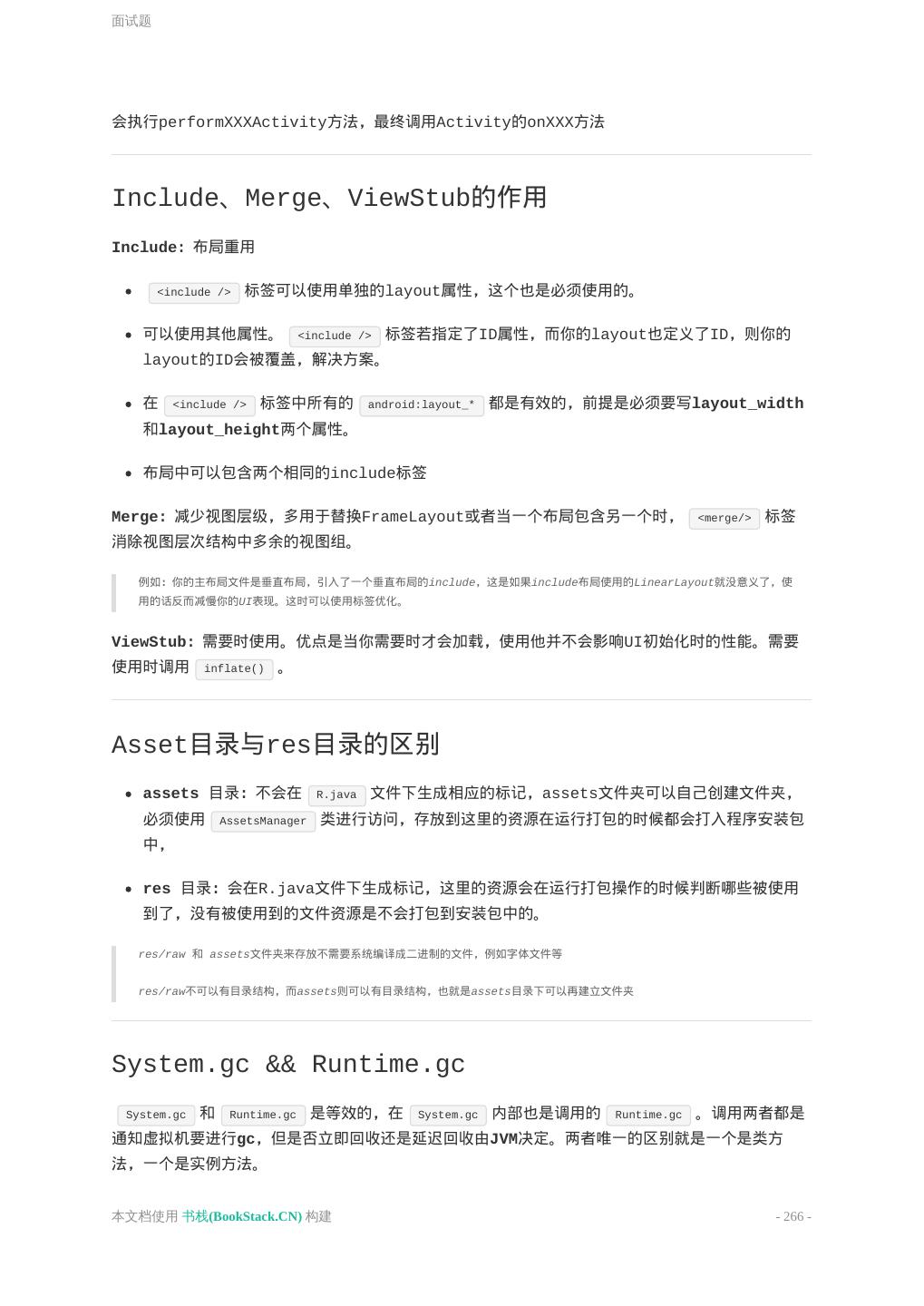 4 .致谢 致谢 当前文档 《Java / Android 笔试、面试 知识整理》 由 进击的皇虫 使用 书栈 (BookStack.CN) 进行构建,生成于 2018-03-11。 书栈(BookStack.CN) 仅提供文档编写、整理、归类等功能,以及对文档内容的生成和导出工 具。 文档内容由网友们编写和整理,书栈(BookStack.CN) 难以确认文档内容知识点是否错漏。如 果您在阅读文档获取知识的时候,发现文档内容有不恰当的地方,请向我们反馈,让我们共同携手, 将知识准确、高效且有效地传递给每一个人。 同时,如果您在日常生活、工作和学习中遇到有价值有营养的知识文档,欢迎分享到 书栈 (BookStack.CN) ,为知识的传承献上您的一份力量! 如果当前文档生成时间太久,请到 书栈(BookStack.CN) 获取最新的文档,以跟上知识更新换 代的步伐。 文档地址:http://www.bookstack.cn/books/interview 书栈官网:http://www.bookstack.cn 书栈开源:https://github.com/TruthHun 分享,让知识传承更久远! 感谢知识的创造者,感谢知识的分享者,也感谢每一位阅读到此处的 读者,因为我们都将成为知识的传承者。 本文档使用 书栈(BookStack.CN) 构建 - 4 -