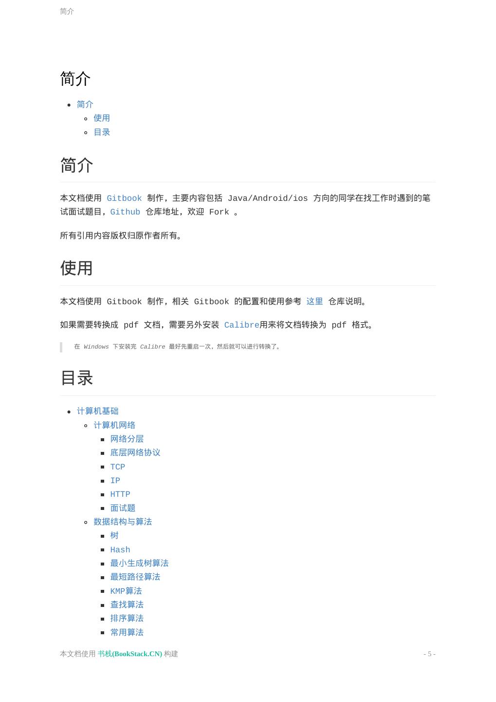 5 .简介 简介 简介 使用 目录 简介 本文档使用 Gitbook 制作,主要内容包括 Java/Android/ios 方向的同学在找工作时遇到的笔 试面试题目,Github 仓库地址,欢迎 Fork 。 所有引用内容版权归原作者所有。 使用 本文档使用 Gitbook 制作,相关 Gitbook 的配置和使用参考 这里 仓库说明。 如果需要转换成 pdf 文档,需要另外安装 Calibre用来将文档转换为 pdf 格式。 在 Windows 下安装完 Calibre 最好先重启一次,然后就可以进行转换了。 目录 计算机基础 计算机网络 网络分层 底层网络协议 TCP IP HTTP 面试题 数据结构与算法 树 Hash 最小生成树算法 最短路径算法 KMP算法 查找算法 排序算法 常用算法 本文档使用 书栈(BookStack.CN) 构建 - 5 -