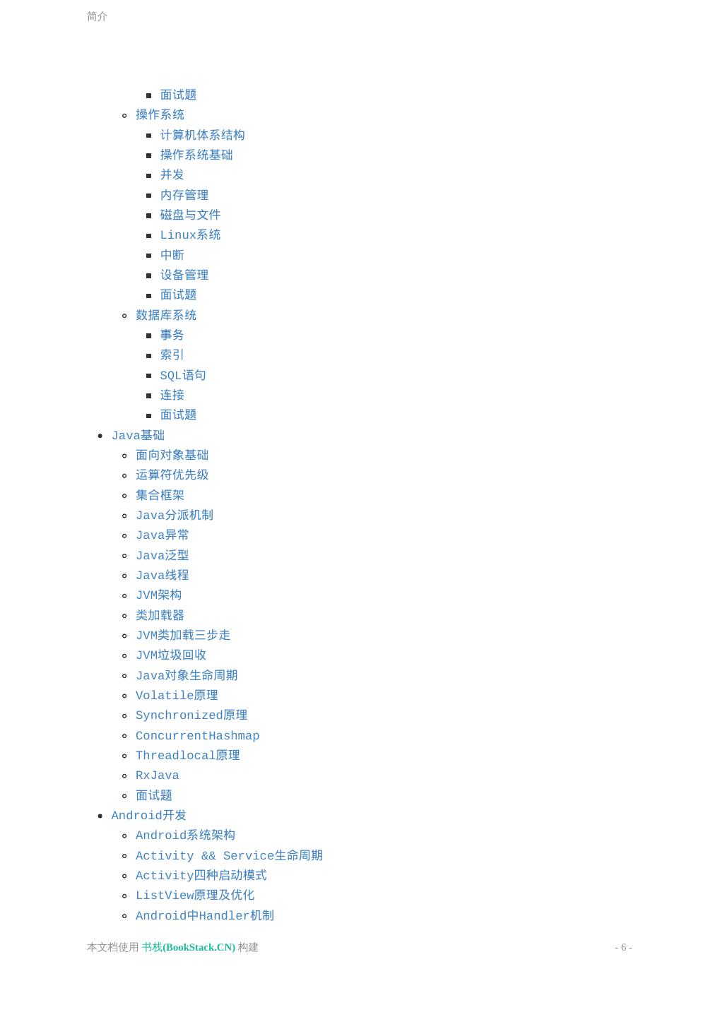 6 .简介 面试题 操作系统 计算机体系结构 操作系统基础 并发 内存管理 磁盘与文件 Linux系统 中断 设备管理 面试题 数据库系统 事务 索引 SQL语句 连接 面试题 Java基础 面向对象基础 运算符优先级 集合框架 Java分派机制 Java异常 Java泛型 Java线程 JVM架构 类加载器 JVM类加载三步走 JVM垃圾回收 Java对象生命周期 Volatile原理 Synchronized原理 ConcurrentHashmap Threadlocal原理 RxJava 面试题 Android开发 Android系统架构 Activity && Service生命周期 Activity四种启动模式 ListView原理及优化 Android中Handler机制 本文档使用 书栈(BookStack.CN) 构建 - 6 -