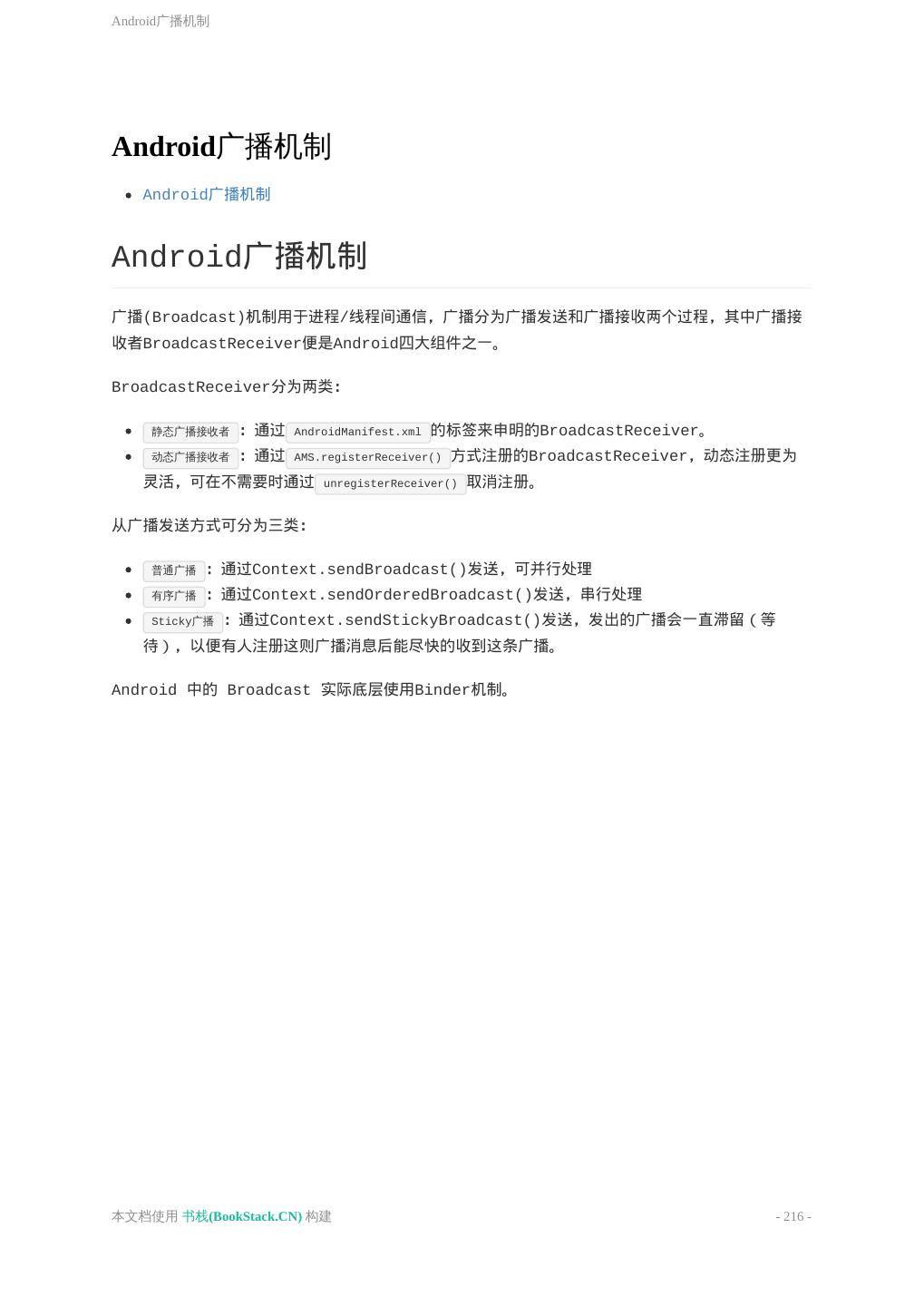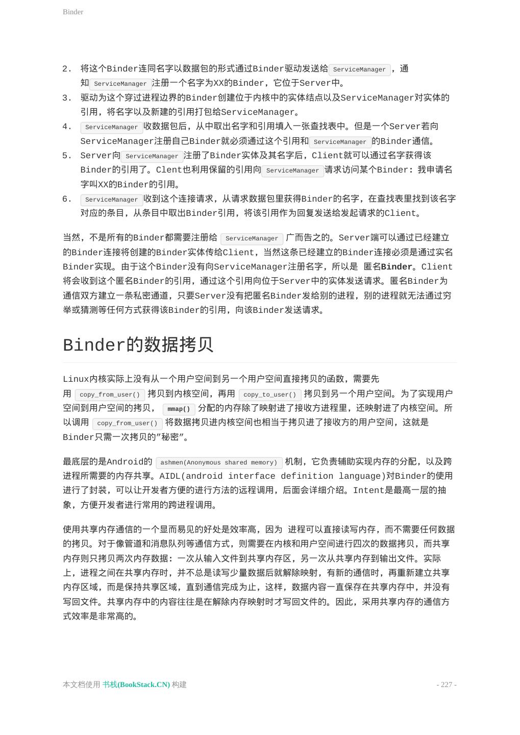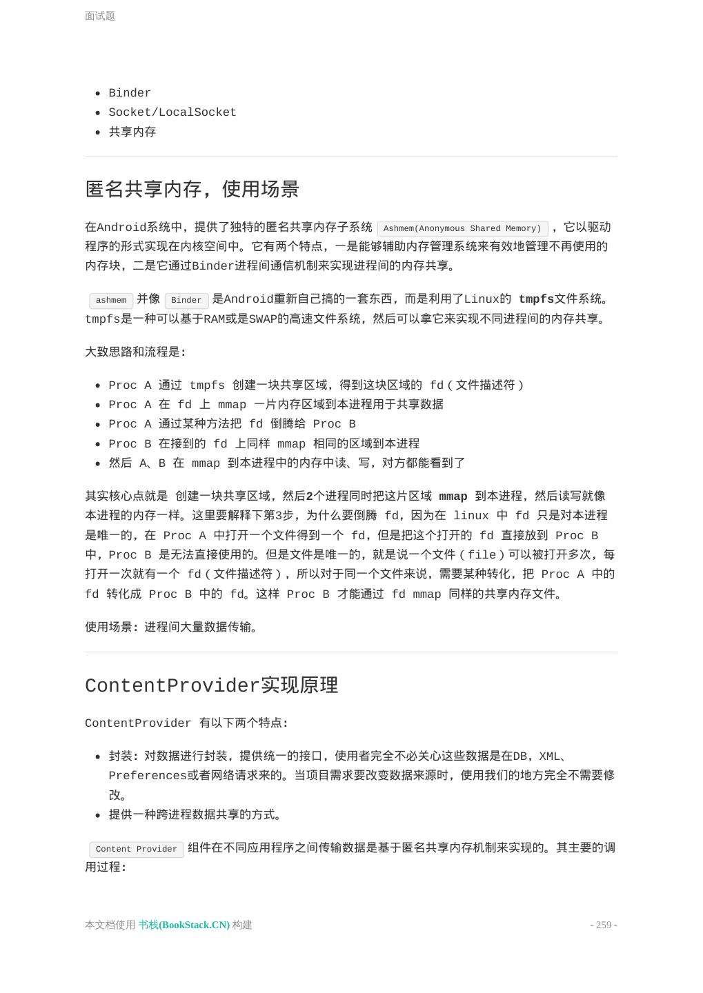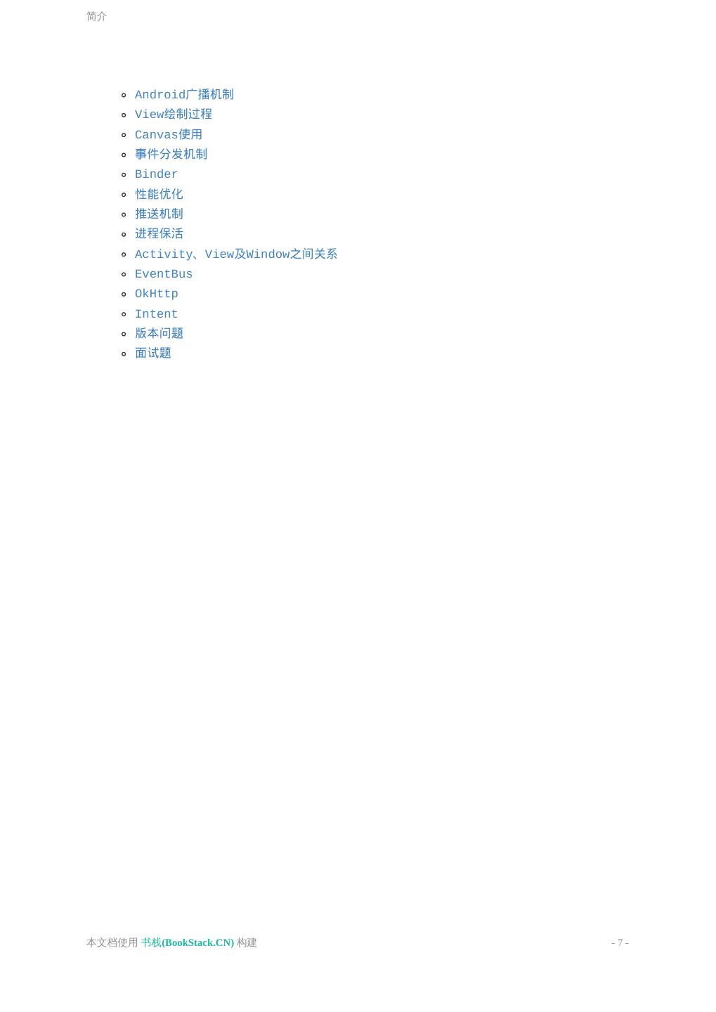 7 .简介 Android广播机制 View绘制过程 Canvas使用 事件分发机制 Binder 性能优化 推送机制 进程保活 Activity、View及Window之间关系 EventBus OkHttp Intent 版本问题 面试题 本文档使用 书栈(BookStack.CN) 构建 - 7 -