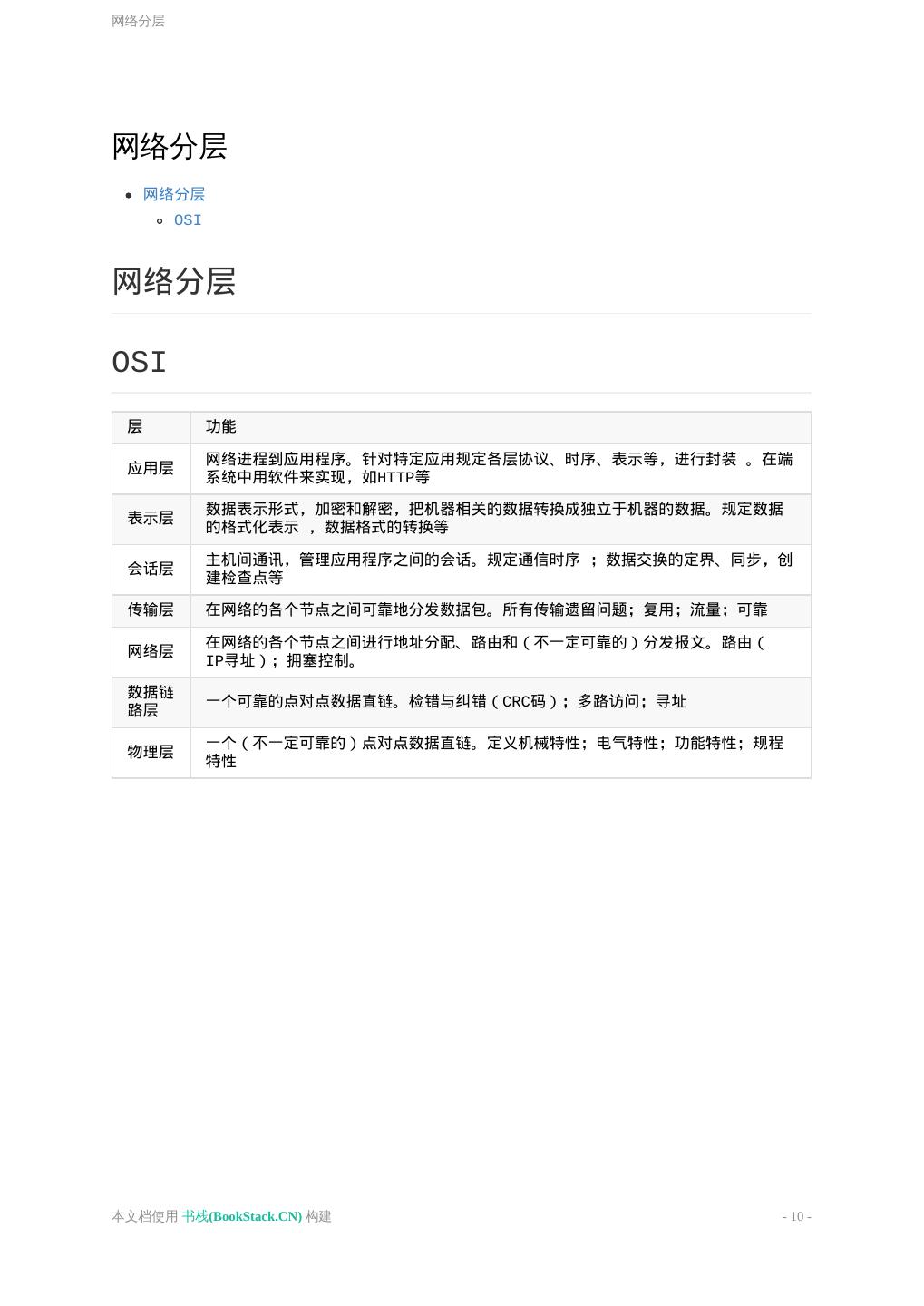 10 .网络分层 网络分层 网络分层 OSI 网络分层 OSI 层 功能 网络进程到应用程序。针对特定应用规定各层协议、时序、表示等,进行封装 。在端 应用层 系统中用软件来实现,如HTTP等 数据表示形式,加密和解密,把机器相关的数据转换成独立于机器的数据。规定数据 表示层 的格式化表示 ,数据格式的转换等 主机间通讯,管理应用程序之间的会话。规定通信时序 ;数据交换的定界、同步,创 会话层 建检查点等 传输层 在网络的各个节点之间可靠地分发数据包。所有传输遗留问题;复用;流量;可靠 在网络的各个节点之间进行地址分配、路由和(不一定可靠的)分发报文。路由( 网络层 IP寻址);拥塞控制。 数据链 一个可靠的点对点数据直链。检错与纠错(CRC码);多路访问;寻址 路层 一个(不一定可靠的)点对点数据直链。定义机械特性;电气特性;功能特性;规程 物理层 特性 本文档使用 书栈(BookStack.CN) 构建 - 10 -
